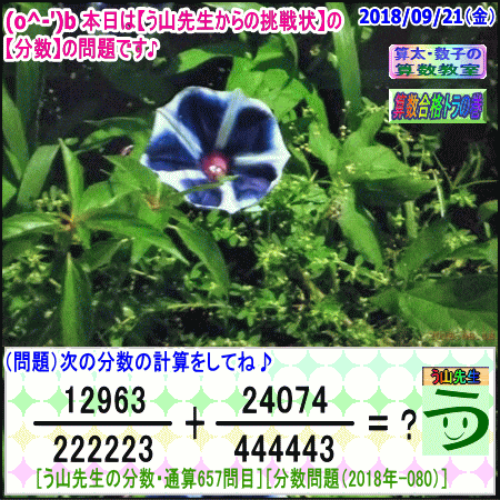 【う山先生のブログ】[1週間の画像まとめ]【2018年9月17日~9月20日】 ※──────────────────※ 【う山TV】 【算数合格トラの巻】 【算太・数子の算数教室】(R) □──────────────────□ □ □──────────────────□ ♪( ´θ`)ノ☆ □──────────────────□ □算数・数学・家庭教師・個別指導・質問教室 □──────────────────□ □ □□□□□□□□□□□□□□□□□□□□ [氏名]【う山雄一】 [動画]【う山TV(スタディ)】 [動画]【う山TV(バラエティ)】 [HP]【算数合格トラの巻】 [著作]【算太・数子の算数教室】(R) 算太君・数子ちゃん [著作]【算遊記(さんゆうき)】算蔵法師・算悟空 □ [メインサイト]【う山先生のHP】 https://uyama.theblog.me/ □ [中学受験]メイン http://www.geocities.jp/sansu_gokaku_toranomaki/ [仕事URL]サブ https://sansu.theblog.me/ http://santakazuko.wix.com/uyama □ [成績表・偏差値アップ] http://www.geocities.jp/santa_kazuko_1994/ □ [動画配信]【う山TV】(スタディ/バラエティ) http://www.geocities.jp/sansu_gokaku_toranomaki/3-uyama-tv https://uyama-tv.themedia.jp/ □ □ [指導日程] https://uyama-yuichi.theblog.me/ □ 【統括ブログ】 https://ameblo.jp/uyama-yuichi/ https://blogs.yahoo.co.jp/uyama_yuichi □ 【お知らせブログ】 https://ameblo.jp/uyama-sensei/ https://blogs.yahoo.co.jp/uyama_sensei https://uyama0515.wordpress.com/ □ □ □□□□□□□□□□□□□□□□□□□□ ☆ ☆ ☆ ☆ ☆ ☆ ☆ ☆