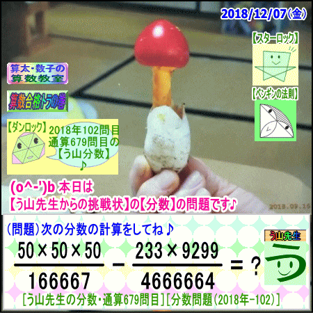 【う山先生のブログ】[1週間の画像まとめ]【2018年12月07日~12月09日】 ※──────────────────※ 【う山TV】 【算数合格トラの巻】 【算太・数子の算数教室】(R) □──────────────────□ □ □──────────────────□ ♪( ´θ`)ノ☆ □──────────────────□ □算数・数学・家庭教師・個別指導・質問教室 □──────────────────□ □ □□□□□□□□□□□□□□□□□□□□ [氏名]【う山雄一】 [動画]【う山TV(スタディ)】 [動画]【う山TV(バラエティ)】 [HP]【算数合格トラの巻】 [著作]【算太・数子の算数教室】(R) 算太君・数子ちゃん [著作]【算遊記(さんゆうき)】算蔵法師・算悟空 □ [メインサイト]【う山先生のHP】 https://uyama.theblog.me/ □ [中学受験]メイン http://www.geocities.jp/sansu_gokaku_toranomaki/ [仕事URL]サブ https://sansu.theblog.me/ http://santakazuko.wix.com/uyama □ [成績表・偏差値アップ] http://www.geocities.jp/santa_kazuko_1994/ □ [動画配信]【う山TV】(スタディ/バラエティ) http://www.geocities.jp/sansu_gokaku_toranomaki/3-uyama-tv https://uyama-tv.themedia.jp/ □ □ [指導日程] https://uyama-yuichi.theblog.me/ □ 【統括ブログ】 https://ameblo.jp/uyama-yuichi/ https://blogs.yahoo.co.jp/uyama_yuichi □ 【お知らせブログ】 https://ameblo.jp/uyama-sensei/ https://blogs.yahoo.co.jp/uyama_sensei https://uyama0515.wordpress.com/ □ □ □□□□□□□□□□□□□□□□□□□□ ☆ ☆ ☆ ☆ ☆ ☆ ☆ ☆