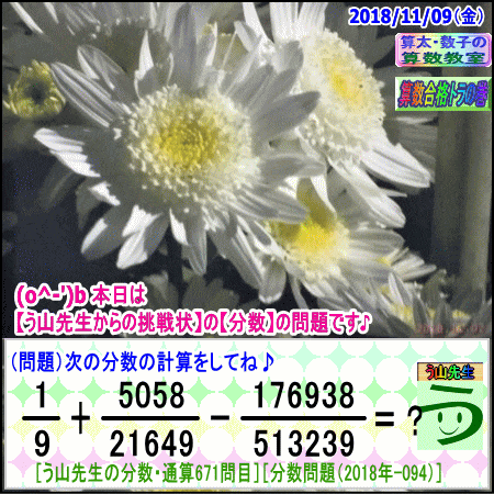 【う山先生のブログ】[1週間の画像まとめ]【2018年11月09日~11月11日】 ※──────────────────※ 【う山TV】 【算数合格トラの巻】 【算太・数子の算数教室】(R) □──────────────────□ □ □──────────────────□ ♪( ´θ`)ノ☆ □──────────────────□ □算数・数学・家庭教師・個別指導・質問教室 □──────────────────□ □ □□□□□□□□□□□□□□□□□□□□ [氏名]【う山雄一】 [動画]【う山TV(スタディ)】 [動画]【う山TV(バラエティ)】 [HP]【算数合格トラの巻】 [著作]【算太・数子の算数教室】(R) 算太君・数子ちゃん [著作]【算遊記(さんゆうき)】算蔵法師・算悟空 □ [メインサイト]【う山先生のHP】 https://uyama.theblog.me/ □ [中学受験]メイン http://www.geocities.jp/sansu_gokaku_toranomaki/ [仕事URL]サブ https://sansu.theblog.me/ http://santakazuko.wix.com/uyama □ [成績表・偏差値アップ] http://www.geocities.jp/santa_kazuko_1994/ □ [動画配信]【う山TV】(スタディ/バラエティ) http://www.geocities.jp/sansu_gokaku_toranomaki/3-uyama-tv https://uyama-tv.themedia.jp/ □ □ [指導日程] https://uyama-yuichi.theblog.me/ □ 【統括ブログ】 https://ameblo.jp/uyama-yuichi/ https://blogs.yahoo.co.jp/uyama_yuichi □ 【お知らせブログ】 https://ameblo.jp/uyama-sensei/ https://blogs.yahoo.co.jp/uyama_sensei https://uyama0515.wordpress.com/ □ □ □□□□□□□□□□□□□□□□□□□□ ☆ ☆ ☆ ☆ ☆ ☆ ☆ ☆