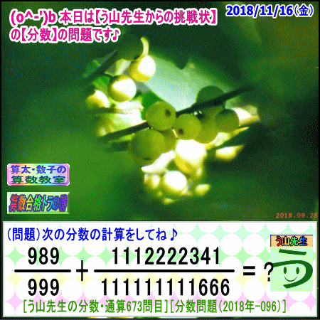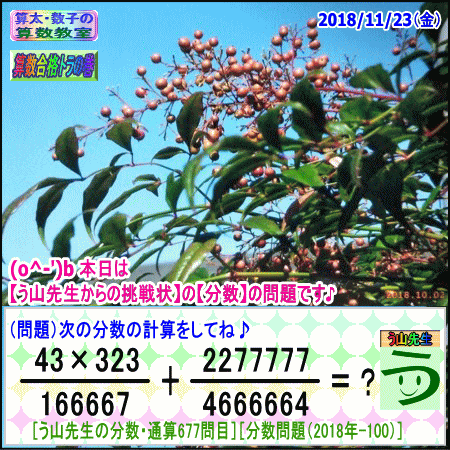 【う山先生のブログ】[1週間の画像まとめ]【2018年11月16日~11月18日】 ※──────────────────※ 【う山TV】 【算数合格トラの巻】 【算太・数子の算数教室】(R) □──────────────────□ □ □──────────────────□ ♪( ´θ`)ノ☆ □──────────────────□ □算数・数学・家庭教師・個別指導・質問教室 □──────────────────□ □ □□□□□□□□□□□□□□□□□□□□ [氏名]【う山雄一】 [動画]【う山TV(スタディ)】 [動画]【う山TV(バラエティ)】 [HP]【算数合格トラの巻】 [著作]【算太・数子の算数教室】(R) 算太君・数子ちゃん [著作]【算遊記(さんゆうき)】算蔵法師・算悟空 □ [メインサイト]【う山先生のHP】 https://uyama.theblog.me/ □ [中学受験]メイン http://www.geocities.jp/sansu_gokaku_toranomaki/ [仕事URL]サブ https://sansu.theblog.me/ http://santakazuko.wix.com/uyama □ [成績表・偏差値アップ] http://www.geocities.jp/santa_kazuko_1994/ □ [動画配信]【う山TV】(スタディ/バラエティ) http://www.geocities.jp/sansu_gokaku_toranomaki/3-uyama-tv https://uyama-tv.themedia.jp/ □ □ [指導日程] https://uyama-yuichi.theblog.me/ □ 【統括ブログ】 https://ameblo.jp/uyama-yuichi/ https://blogs.yahoo.co.jp/uyama_yuichi □ 【お知らせブログ】 https://ameblo.jp/uyama-sensei/ https://blogs.yahoo.co.jp/uyama_sensei https://uyama0515.wordpress.com/ □ □ □□□□□□□□□□□□□□□□□□□□ ☆ ☆ ☆ ☆ ☆ ☆ ☆ ☆