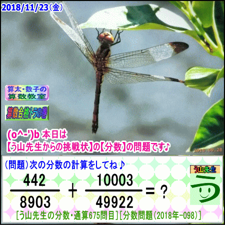 【う山先生のブログ】[1週間の画像まとめ]【2018年11月23日~11月25日】 ※──────────────────※ 【う山TV】 【算数合格トラの巻】 【算太・数子の算数教室】(R) □──────────────────□ □ □──────────────────□ ♪( ´θ`)ノ☆ □──────────────────□ □算数・数学・家庭教師・個別指導・質問教室 □──────────────────□ □ □□□□□□□□□□□□□□□□□□□□ [氏名]【う山雄一】 [動画]【う山TV(スタディ)】 [動画]【う山TV(バラエティ)】 [HP]【算数合格トラの巻】 [著作]【算太・数子の算数教室】(R) 算太君・数子ちゃん [著作]【算遊記(さんゆうき)】算蔵法師・算悟空 □ [メインサイト]【う山先生のHP】 https://uyama.theblog.me/ □ [中学受験]メイン http://www.geocities.jp/sansu_gokaku_toranomaki/ [仕事URL]サブ https://sansu.theblog.me/ http://santakazuko.wix.com/uyama □ [成績表・偏差値アップ] http://www.geocities.jp/santa_kazuko_1994/ □ [動画配信]【う山TV】(スタディ/バラエティ) http://www.geocities.jp/sansu_gokaku_toranomaki/3-uyama-tv https://uyama-tv.themedia.jp/ □ □ [指導日程] https://uyama-yuichi.theblog.me/ □ 【統括ブログ】 https://ameblo.jp/uyama-yuichi/ https://blogs.yahoo.co.jp/uyama_yuichi □ 【お知らせブログ】 https://ameblo.jp/uyama-sensei/ https://blogs.yahoo.co.jp/uyama_sensei https://uyama0515.wordpress.com/ □ □ □□□□□□□□□□□□□□□□□□□□ ☆ ☆ ☆ ☆ ☆ ☆ ☆ ☆