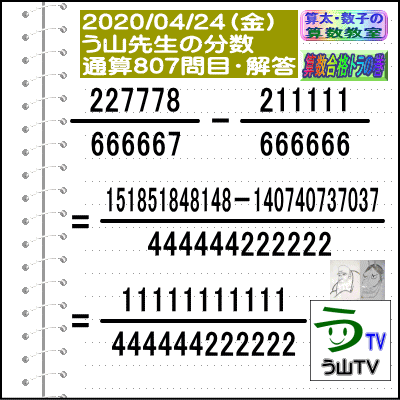 [う山雄一先生の分数]【分数807問目】算数・数学天才問題[2020年4月24日]Fraction □──────────────────□ 【算太・数子の算数教室】(R) 【算数合格トラの巻】 【う山TV(スタディ)】 【う山TV(バラエティ)】 【カンブリア・アカデミー】 ※──────────────────※ (o^-')b 大人気☆[う山先生式・分数計算]の問題です♪ ※──────────────────※ □ 2020/04/24(金曜) □ (o^-')b 【う山先生の分数・通算807問目】 [分数問題(2020年17問目)] 本日は2020年4月24日です。 次の分数計算をしてね♪ 227778/666667 - 211111/666666 = ? □ 【答え】後程♪ □ ※──────────────────※ (*^ー^)ノ[う山先生の分数(2020年17問目)]です☆ 本日は【う山先生の分数・807問目】です☆ 分子・分母ともどうなるかな♪ □ [Fraction of Professor Uyama] доля Frakcja Fracao ※──────────────────※ 算数・数学・家庭教師・個別指導・質問教室 ※──────────────────※ □ □□□□□□□□□□□□□□□□□□□□ [発行者氏名]【う山雄一】 [発行者web]【算数合格トラの巻】 [発行者web]【算太・数子の算数教室】(R) [著作]【算太・数子の算数教室】(R) 「さんた・かずこのさんすうきょうしつ」 [著作]【算遊記】 □ [メインサイト]う山先生のHP https://uyama.theblog.me/ □ [中学受験・算数]メイン http://uyama.aikotoba.jp/ [中学受験・算数]サブ https://sansu.theblog.me/ http://santakazuko.wix.com/uyama □ [成績表・偏差値アップ] http://uyama.aikotoba.jp/seiseki/seiseki.html □ [算遊記(さんゆうき)]算蔵法師・算悟空 http://www.geocities.jp/san_yu_ki/(←工事中) □ [仕事用フェイスブック] https://www.facebook.com/kazuko.santa.5/ □ [全般メール] ??????@gmail.com □ [中学受験・仕事用メール] ??????@gmail.com □ [ブログ]【算数合格トラの巻】 http://ameblo.jp/sansu/ http://uyama.blog.jp/ https://blog.goo.ne.jp/sansu_gokaku □ [ブログ]【算太・数子の算数教室】(R) http://ameblo.jp/santa-kazuko/ http://blog.goo.ne.jp/santa_kazuko http://santakazuko.wordpress.com/ http://santa-kazuko.at.webry.info/ http://santa-kazuko.blogspot.jp/ http://ch.nicovideo.jp/santa-kazuko http://santa-kazuko.blog.jp/ □ [ブログ]【う山先生】 http://happy.ap.teacup.com/uyama/ http://sansugokaku.blog.fc2.com/ https://uyama-sensei.hatenablog.com/ □ [ブログ]【オルドビスキー博士】 http://ameblo.jp/ordovisky/ □ [ブログ]【う山TV】 https://ameblo.jp/uyama-tv/ □ [動画一覧]【う山TV】(スタディ/バラエティ) http://uyama.aikotoba.jp/3-uyama-tv.html □ [動画一覧]【う山TV】 https://uyama-tv.themedia.jp/ □ [作曲一覧]【う山TV】(作曲) https://uyama-tv.amebaownd.com/ □ [分数、楽しい!]シリーズ [分数で算数・数学の天才になろう♪]シリーズ [知的ゲーム]シリーズ [一瞬で解こう!]シリーズ [解けたら天才♪]シリーズ [家庭教師]シリーズ [算数・面白い問題]シリーズ [算数・数学ファイル/SSファイル]シリーズ 【音楽・作曲】シリーズ 【空耳】シリーズ 【恋愛探偵サララ】シリーズ 【ランキング】シリーズ □ □ 【毎日の問題ブログ】一覧(お好きなブログを登録してね♪) http://uyama.aikotoba.jp/2-blog.html □ □□□□□□□□□□□□□□□□□□□□ ☆ ☆ ☆ ☆ ☆ ☆ ☆ ☆ ☆ ☆