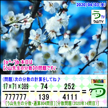 [う山雄一先生の分数]【分数804問目】算数・数学天才問題[2020年4月3日]Fraction □──────────────────□ 【算太・数子の算数教室】(R) 【算数合格トラの巻】 【う山TV(スタディ)】 【う山TV(バラエティ)】 【カンブリア・アカデミー】 ※──────────────────※ (o^-')b 大人気☆[う山先生式・分数計算]の問題です♪ ※──────────────────※ □ 2020/04/03(金曜) □ (o^-')b 【う山先生の分数・通算804問目】 [分数問題(2020年14問目)] 本日は2020年4月3日です。 次の分数計算をしてね♪ (17×71×389)/777777 - 74/139 - 252/4111 = ? □ 【答え】後程♪ □ ※──────────────────※ (*^ー^)ノ[う山先生の分数(2020年14問目)]です☆ 本日は【う山先生の分数・804問目】です☆ 本日、4月3日に相応しい分数問題を作成しました。 分子・分母ともどうなるかな♪ □ [Fraction of Professor Uyama] доля Frakcja Fracao ※──────────────────※ 算数・数学・家庭教師・個別指導・質問教室 ※──────────────────※ □ □□□□□□□□□□□□□□□□□□□□ [発行者氏名]【う山雄一】 [発行者web]【算数合格トラの巻】 [発行者web]【算太・数子の算数教室】(R) [著作]【算太・数子の算数教室】(R) 「さんた・かずこのさんすうきょうしつ」 [著作]【算遊記】 □ [メインサイト]う山先生のHP https://uyama.theblog.me/ □ [中学受験・算数]メイン http://uyama.aikotoba.jp/ [中学受験・算数]サブ https://sansu.theblog.me/ http://santakazuko.wix.com/uyama □ [成績表・偏差値アップ] http://uyama.aikotoba.jp/seiseki/seiseki.html □ [算遊記(さんゆうき)]算蔵法師・算悟空 http://www.geocities.jp/san_yu_ki/(←工事中) □ [仕事用フェイスブック] https://www.facebook.com/kazuko.santa.5/ □ [全般メール] ??????@gmail.com □ [中学受験・仕事用メール] ??????@gmail.com □ [ブログ]【算数合格トラの巻】 http://ameblo.jp/sansu/ http://uyama.blog.jp/ https://blog.goo.ne.jp/sansu_gokaku □ [ブログ]【算太・数子の算数教室】(R) http://ameblo.jp/santa-kazuko/ http://blog.goo.ne.jp/santa_kazuko http://santakazuko.wordpress.com/ http://santa-kazuko.at.webry.info/ http://santa-kazuko.blogspot.jp/ http://ch.nicovideo.jp/santa-kazuko http://santa-kazuko.blog.jp/ □ [ブログ]【う山先生】 http://happy.ap.teacup.com/uyama/ http://sansugokaku.blog.fc2.com/ https://uyama-sensei.hatenablog.com/ □ [ブログ]【オルドビスキー博士】 http://ameblo.jp/ordovisky/ □ [ブログ]【う山TV】 https://ameblo.jp/uyama-tv/ □ [動画配信]【う山TV】(スタディ/バラエティ) http://uyama.aikotoba.jp/3-uyama-tv.html https://uyama-tv.themedia.jp/ □ [分数、楽しい!]シリーズ [分数で算数・数学の天才になろう♪]シリーズ [知的ゲーム]シリーズ [一瞬で解こう!]シリーズ [解けたら天才♪]シリーズ [家庭教師]シリーズ [算数・面白い問題]シリーズ [算数・数学ファイル/SSファイル]シリーズ 【音楽・作曲】シリーズ 【空耳】シリーズ 【恋愛探偵サララ】シリーズ 【ランキング】シリーズ □ □ 【毎日の問題ブログ】一覧(お好きなブログを登録してね♪) http://uyama.aikotoba.jp/2-blog.html □ □□□□□□□□□□□□□□□□□□□□ ☆ ☆ ☆ ☆ ☆ ☆ ☆ ☆ ☆ ☆