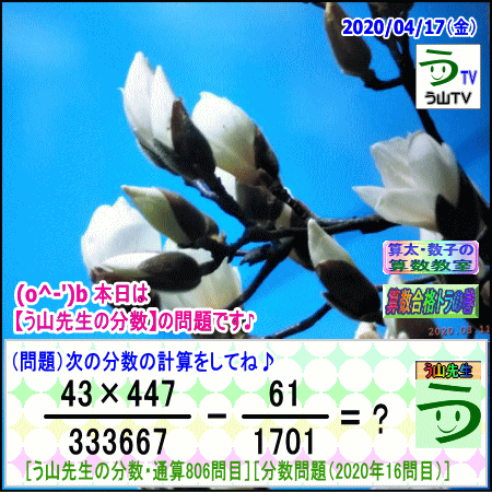 [う山雄一先生の分数]【分数806問目】算数・数学天才問題[2020年4月17日]Fraction □──────────────────□ 【算太・数子の算数教室】(R) 【算数合格トラの巻】 【う山TV(スタディ)】 【う山TV(バラエティ)】 【カンブリア・アカデミー】 ※──────────────────※ (o^-')b 大人気☆[う山先生式・分数計算]の問題です♪ ※──────────────────※ □ 2020/04/17(金曜) □ (o^-')b 【う山先生の分数・通算806問目】 [分数問題(2020年16問目)] 本日は2020年4月17日です。 次の分数計算をしてね♪ (43×447)/333667 - 61/1701 = ? □ 【答え】後程♪ □ ※──────────────────※ (*^ー^)ノ[う山先生の分数(2020年16問目)]です☆ 本日は【う山先生の分数・806問目】です☆ 分子・分母ともどうなるかな♪ □ [Fraction of Professor Uyama] доля Frakcja Fracao ※──────────────────※ 算数・数学・家庭教師・個別指導・質問教室 ※──────────────────※ □ □□□□□□□□□□□□□□□□□□□□ [発行者氏名]【う山雄一】 [発行者web]【算数合格トラの巻】 [発行者web]【算太・数子の算数教室】(R) [著作]【算太・数子の算数教室】(R) 「さんた・かずこのさんすうきょうしつ」 [著作]【算遊記】 □ [メインサイト]う山先生のHP https://uyama.theblog.me/ □ [中学受験・算数]メイン http://uyama.aikotoba.jp/ [中学受験・算数]サブ https://sansu.theblog.me/ http://santakazuko.wix.com/uyama □ [成績表・偏差値アップ] http://uyama.aikotoba.jp/seiseki/seiseki.html □ [算遊記(さんゆうき)]算蔵法師・算悟空 http://www.geocities.jp/san_yu_ki/(←工事中) □ [仕事用フェイスブック] https://www.facebook.com/kazuko.santa.5/ □ [全般メール] ??????@gmail.com □ [中学受験・仕事用メール] ??????@gmail.com □ [ブログ]【算数合格トラの巻】 http://ameblo.jp/sansu/ http://uyama.blog.jp/ https://blog.goo.ne.jp/sansu_gokaku □ [ブログ]【算太・数子の算数教室】(R) http://ameblo.jp/santa-kazuko/ http://blog.goo.ne.jp/santa_kazuko http://santakazuko.wordpress.com/ http://santa-kazuko.at.webry.info/ http://santa-kazuko.blogspot.jp/ http://ch.nicovideo.jp/santa-kazuko http://santa-kazuko.blog.jp/ □ [ブログ]【う山先生】 http://happy.ap.teacup.com/uyama/ http://sansugokaku.blog.fc2.com/ https://uyama-sensei.hatenablog.com/ □ [ブログ]【オルドビスキー博士】 http://ameblo.jp/ordovisky/ □ [ブログ]【う山TV】 https://ameblo.jp/uyama-tv/ □ [動画一覧]【う山TV】(スタディ/バラエティ) http://uyama.aikotoba.jp/3-uyama-tv.html □ [動画一覧]【う山TV】 https://uyama-tv.themedia.jp/ □ [作曲一覧]【う山TV】(作曲) https://uyama-tv.amebaownd.com/ □ [分数、楽しい!]シリーズ [分数で算数・数学の天才になろう♪]シリーズ [知的ゲーム]シリーズ [一瞬で解こう!]シリーズ [解けたら天才♪]シリーズ [家庭教師]シリーズ [算数・面白い問題]シリーズ [算数・数学ファイル/SSファイル]シリーズ 【音楽・作曲】シリーズ 【空耳】シリーズ 【恋愛探偵サララ】シリーズ 【ランキング】シリーズ □ □ 【毎日の問題ブログ】一覧(お好きなブログを登録してね♪) http://uyama.aikotoba.jp/2-blog.html □ □□□□□□□□□□□□□□□□□□□□ ☆ ☆ ☆ ☆ ☆ ☆ ☆ ☆ ☆ ☆
