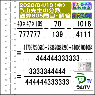 [う山雄一先生の分数]【分数805問目】算数・数学天才問題[2020年4月10日]Fraction □──────────────────□ 【算太・数子の算数教室】(R) 【算数合格トラの巻】 【う山TV(スタディ)】 【う山TV(バラエティ)】 【カンブリア・アカデミー】 ※──────────────────※ (o^-')b 大人気☆[う山先生式・分数計算]の問題です♪ ※──────────────────※ □ 2020/04/10(金曜) □ (o^-')b 【う山先生の分数・通算805問目】 [分数問題(2020年15問目)] 本日は2020年4月10日です。 次の分数計算をしてね♪ (40×47×109)/777777 - 70/139 + 1018/4111 = ? □ 【答え】後程♪ □ ※──────────────────※ (*^ー^)ノ[う山先生の分数(2020年15問目)]です☆ 本日は【う山先生の分数・805問目】です☆ 分子・分母ともどうなるかな♪ □ [Fraction of Professor Uyama] доля Frakcja Fracao ※──────────────────※ 算数・数学・家庭教師・個別指導・質問教室 ※──────────────────※ □ □□□□□□□□□□□□□□□□□□□□ [発行者氏名]【う山雄一】 [発行者web]【算数合格トラの巻】 [発行者web]【算太・数子の算数教室】(R) [著作]【算太・数子の算数教室】(R) 「さんた・かずこのさんすうきょうしつ」 [著作]【算遊記】 □ [メインサイト]う山先生のHP https://uyama.theblog.me/ □ [中学受験・算数]メイン http://uyama.aikotoba.jp/ [中学受験・算数]サブ https://sansu.theblog.me/ http://santakazuko.wix.com/uyama □ [成績表・偏差値アップ] http://uyama.aikotoba.jp/seiseki/seiseki.html □ [算遊記(さんゆうき)]算蔵法師・算悟空 http://www.geocities.jp/san_yu_ki/(←工事中) □ [仕事用フェイスブック] https://www.facebook.com/kazuko.santa.5/ □ [全般メール] ??????@gmail.com □ [中学受験・仕事用メール] ??????@gmail.com □ [ブログ]【算数合格トラの巻】 http://ameblo.jp/sansu/ http://uyama.blog.jp/ https://blog.goo.ne.jp/sansu_gokaku □ [ブログ]【算太・数子の算数教室】(R) http://ameblo.jp/santa-kazuko/ http://blog.goo.ne.jp/santa_kazuko http://santakazuko.wordpress.com/ http://santa-kazuko.at.webry.info/ http://santa-kazuko.blogspot.jp/ http://ch.nicovideo.jp/santa-kazuko http://santa-kazuko.blog.jp/ □ [ブログ]【う山先生】 http://happy.ap.teacup.com/uyama/ http://sansugokaku.blog.fc2.com/ https://uyama-sensei.hatenablog.com/ □ [ブログ]【オルドビスキー博士】 http://ameblo.jp/ordovisky/ □ [ブログ]【う山TV】 https://ameblo.jp/uyama-tv/ □ [動画配信]【う山TV】(スタディ/バラエティ) http://uyama.aikotoba.jp/3-uyama-tv.html https://uyama-tv.themedia.jp/ □ [分数、楽しい!]シリーズ [分数で算数・数学の天才になろう♪]シリーズ [知的ゲーム]シリーズ [一瞬で解こう!]シリーズ [解けたら天才♪]シリーズ [家庭教師]シリーズ [算数・面白い問題]シリーズ [算数・数学ファイル/SSファイル]シリーズ 【音楽・作曲】シリーズ 【空耳】シリーズ 【恋愛探偵サララ】シリーズ 【ランキング】シリーズ □ □ 【毎日の問題ブログ】一覧(お好きなブログを登録してね♪) http://uyama.aikotoba.jp/2-blog.html □ □□□□□□□□□□□□□□□□□□□□ ☆ ☆ ☆ ☆ ☆ ☆ ☆ ☆ ☆ ☆
