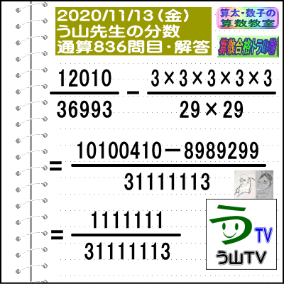 [う山雄一先生の分数]【分数836問目】算数・数学天才問題[2020年11月13日]Fraction □──────────────────□ 【算太・数子の算数教室】(R) 【算数合格トラの巻】 【う山TV(スタディ)】 【う山TV(バラエティ)】 【カンブリア・アカデミー】 □──────────────────□ (o^-')b 大人気☆[う山先生式・分数計算]の問題です♪ □──────────────────□ □ 2020/11/13(金曜) □ (o^-')b 【う山先生の分数・通算836問目】 [分数問題(2020年46問目)] 本日は2020年11月13日です。 次の分数計算をしてね♪ 12010/36993 -(3×3×3×3×3)/(29×29) = ? □ 【答え】後程♪ □ □──────────────────□ (*^ー^)ノ[う山先生の分数(2020年46問目)]です☆ 本日は【う山先生の分数・836問目】です☆ 本日、11月13日に相応しい面白い分数問題を作りました☆ 分子・分母ともどうなるかな♪ □ [Fraction of Professor Uyama] доля Frakcja Fracao □──────────────────□ 算数・数学・家庭教師・個別指導・質問教室 □──────────────────□ □ □□□□□□□□□□□□□□□□□□□□ [発行者氏名]【う山雄一】 [発行者web]【算数合格トラの巻】 [発行者web]【算太・数子の算数教室】(R) [著作]【算太・数子の算数教室】(R) 「さんた・かずこのさんすうきょうしつ」 [著作]【算遊記】 □ [メインサイト]う山先生のHP https://uyama.theblog.me/ □ [中学受験・算数]メイン http://uyama.aikotoba.jp/ [中学受験・算数]サブ https://sansu.theblog.me/ http://santakazuko.wix.com/uyama □ [成績表・偏差値アップ] http://uyama.aikotoba.jp/seiseki/seiseki.html □ [算遊記(さんゆうき)]算蔵法師・算悟空 http://www.geocities.jp/san_yu_ki/(←工事中) □ [仕事用フェイスブック] https://www.facebook.com/kazuko.santa.5/ □ [全般メール] ??????@gmail.com □ [中学受験・仕事用メール] ??????@gmail.com □ [ブログ]【算数合格トラの巻】 http://ameblo.jp/sansu/ http://uyama.blog.jp/ https://blog.goo.ne.jp/sansu_gokaku □ [ブログ]【算太・数子の算数教室】(R) http://ameblo.jp/santa-kazuko/ http://blog.goo.ne.jp/santa_kazuko http://santakazuko.wordpress.com/ http://santa-kazuko.at.webry.info/ http://santa-kazuko.blogspot.jp/ http://ch.nicovideo.jp/santa-kazuko http://santa-kazuko.blog.jp/ □ [ブログ]【う山先生】 http://happy.ap.teacup.com/uyama/ http://sansugokaku.blog.fc2.com/ https://uyama-sensei.hatenablog.com/ □ [ブログ]【オルドビスキー博士】 http://ameblo.jp/ordovisky/ □ [ブログ]【う山TV】 https://ameblo.jp/uyama-tv/ □ [動画一覧]【う山TV】(スタディ/バラエティ) http://uyama.aikotoba.jp/3-uyama-tv.html □ [動画一覧]【う山TV】 https://uyama-tv.themedia.jp/ □ [作曲一覧]【う山TV】(作曲) https://uyama-tv.amebaownd.com/ □ [分数、楽しい!]シリーズ [分数で算数・数学の天才になろう♪]シリーズ [知的ゲーム]シリーズ [一瞬で解こう!]シリーズ [解けたら天才♪]シリーズ [家庭教師]シリーズ [算数・面白い問題]シリーズ [算数・数学ファイル/SSファイル]シリーズ 【音楽・作曲】シリーズ 【空耳】シリーズ 【恋愛探偵サララ】シリーズ 【ランキング】シリーズ □ □ 【毎日の問題ブログ】一覧(お好きなブログを登録してね♪) http://uyama.aikotoba.jp/2-blog.html □ □□□□□□□□□□□□□□□□□□□□ ☆ ☆ ☆ ☆ ☆ ☆ ☆ ☆ ☆ ☆