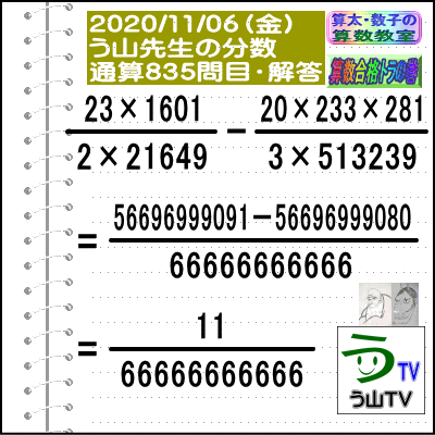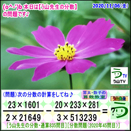 [う山雄一先生の分数]【分数835問目】算数・数学天才問題[2020年11月6日]Fraction □──────────────────□ 【算太・数子の算数教室】(R) 【算数合格トラの巻】 【う山TV(スタディ)】 【う山TV(バラエティ)】 【カンブリア・アカデミー】 □──────────────────□ (o^-')b 大人気☆[う山先生式・分数計算]の問題です♪ □──────────────────□ □ 2020/11/06(金曜) □ (o^-')b 【う山先生の分数・通算835問目】 [分数問題(2020年45問目)] 本日は2020年11月6日です。 次の分数計算をしてね♪ (23×1601)/(2×21649)-(20×233×281)/(3×513239)= ? □ 【答え】後程♪ □ □──────────────────□ (*^ー^)ノ[う山先生の分数(2020年45問目)]です☆ 本日は【う山先生の分数・835問目】です☆ 本日、11月6日に相応しい面白い分数問題を作りました☆ 分子・分母ともどうなるかな♪ □ [Fraction of Professor Uyama] доля Frakcja Fracao □──────────────────□ 算数・数学・家庭教師・個別指導・質問教室 □──────────────────□ □ □□□□□□□□□□□□□□□□□□□□ [発行者氏名]【う山雄一】 [発行者web]【算数合格トラの巻】 [発行者web]【算太・数子の算数教室】(R) [著作]【算太・数子の算数教室】(R) 「さんた・かずこのさんすうきょうしつ」 [著作]【算遊記】 □ [メインサイト]う山先生のHP https://uyama.theblog.me/ □ [中学受験・算数]メイン http://uyama.aikotoba.jp/ [中学受験・算数]サブ https://sansu.theblog.me/ http://santakazuko.wix.com/uyama □ [成績表・偏差値アップ] http://uyama.aikotoba.jp/seiseki/seiseki.html □ [算遊記(さんゆうき)]算蔵法師・算悟空 http://www.geocities.jp/san_yu_ki/(←工事中) □ [仕事用フェイスブック] https://www.facebook.com/kazuko.santa.5/ □ [全般メール] ??????@gmail.com □ [中学受験・仕事用メール] ??????@gmail.com □ [ブログ]【算数合格トラの巻】 http://ameblo.jp/sansu/ http://uyama.blog.jp/ https://blog.goo.ne.jp/sansu_gokaku □ [ブログ]【算太・数子の算数教室】(R) http://ameblo.jp/santa-kazuko/ http://blog.goo.ne.jp/santa_kazuko http://santakazuko.wordpress.com/ http://santa-kazuko.at.webry.info/ http://santa-kazuko.blogspot.jp/ http://ch.nicovideo.jp/santa-kazuko http://santa-kazuko.blog.jp/ □ [ブログ]【う山先生】 http://happy.ap.teacup.com/uyama/ http://sansugokaku.blog.fc2.com/ https://uyama-sensei.hatenablog.com/ □ [ブログ]【オルドビスキー博士】 http://ameblo.jp/ordovisky/ □ [ブログ]【う山TV】 https://ameblo.jp/uyama-tv/ □ [動画一覧]【う山TV】(スタディ/バラエティ) http://uyama.aikotoba.jp/3-uyama-tv.html □ [動画一覧]【う山TV】 https://uyama-tv.themedia.jp/ □ [作曲一覧]【う山TV】(作曲) https://uyama-tv.amebaownd.com/ □ [分数、楽しい!]シリーズ [分数で算数・数学の天才になろう♪]シリーズ [知的ゲーム]シリーズ [一瞬で解こう!]シリーズ [解けたら天才♪]シリーズ [家庭教師]シリーズ [算数・面白い問題]シリーズ [算数・数学ファイル/SSファイル]シリーズ 【音楽・作曲】シリーズ 【空耳】シリーズ 【恋愛探偵サララ】シリーズ 【ランキング】シリーズ □ □ 【毎日の問題ブログ】一覧(お好きなブログを登録してね♪) http://uyama.aikotoba.jp/2-blog.html □ □□□□□□□□□□□□□□□□□□□□ ☆ ☆ ☆ ☆ ☆ ☆ ☆ ☆ ☆ ☆