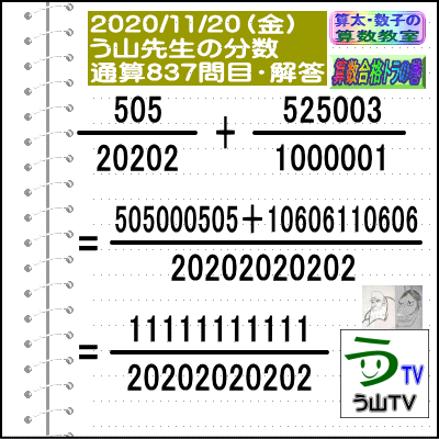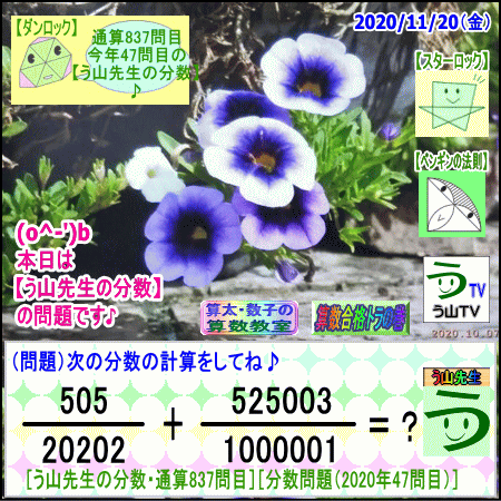[う山雄一先生の分数]【分数837問目】算数・数学天才問題[2020年11月20日]Fraction □──────────────────□ 【算太・数子の算数教室】(R) 【算数合格トラの巻】 【う山TV(スタディ)】 【う山TV(バラエティ)】 【カンブリア・アカデミー】 □──────────────────□ (o^-')b 大人気☆[う山先生式・分数計算]の問題です♪ □──────────────────□ □ 2020/11/20(金曜) □ (o^-')b 【う山先生の分数・通算837問目】 [分数問題(2020年47問目)] 本日は2020年11月20日です。 次の分数計算をしてね♪ 505/20202 + 525003/1000001 = ? □ 【答え】後程♪ □ □──────────────────□ (*^ー^)ノ[う山先生の分数(2020年47問目)]です☆ 本日は【う山先生の分数・837問目】です☆ 本日、11月20日に相応しい面白い分数問題を作りました☆ 分子・分母ともどうなるかな♪ □ [Fraction of Professor Uyama] доля Frakcja Fracao □──────────────────□ 算数・数学・家庭教師・個別指導・質問教室 □──────────────────□ □ □□□□□□□□□□□□□□□□□□□□ [発行者氏名]【う山雄一】 [発行者web]【算数合格トラの巻】 [発行者web]【算太・数子の算数教室】(R) [著作]【算太・数子の算数教室】(R) 「さんた・かずこのさんすうきょうしつ」 [著作]【算遊記】 □ [メインサイト]う山先生のHP https://uyama.theblog.me/ □ [中学受験・算数]メイン http://uyama.aikotoba.jp/ [中学受験・算数]サブ https://sansu.theblog.me/ http://santakazuko.wix.com/uyama □ [成績表・偏差値アップ] http://uyama.aikotoba.jp/seiseki/seiseki.html □ [算遊記(さんゆうき)]算蔵法師・算悟空 http://www.geocities.jp/san_yu_ki/(←工事中) □ [仕事用フェイスブック] https://www.facebook.com/kazuko.santa.5/ □ [全般メール] ??????@gmail.com □ [中学受験・仕事用メール] ??????@gmail.com □ [ブログ]【算数合格トラの巻】 http://ameblo.jp/sansu/ http://uyama.blog.jp/ https://blog.goo.ne.jp/sansu_gokaku □ [ブログ]【算太・数子の算数教室】(R) http://ameblo.jp/santa-kazuko/ http://blog.goo.ne.jp/santa_kazuko http://santakazuko.wordpress.com/ http://santa-kazuko.at.webry.info/ http://santa-kazuko.blogspot.jp/ http://ch.nicovideo.jp/santa-kazuko http://santa-kazuko.blog.jp/ □ [ブログ]【う山先生】 http://happy.ap.teacup.com/uyama/ http://sansugokaku.blog.fc2.com/ https://uyama-sensei.hatenablog.com/ □ [ブログ]【オルドビスキー博士】 http://ameblo.jp/ordovisky/ □ [ブログ]【う山TV】 https://ameblo.jp/uyama-tv/ □ [動画一覧]【う山TV】(スタディ/バラエティ) http://uyama.aikotoba.jp/3-uyama-tv.html □ [動画一覧]【う山TV】 https://uyama-tv.themedia.jp/ □ [作曲一覧]【う山TV】(作曲) https://uyama-tv.amebaownd.com/ □ [分数、楽しい!]シリーズ [分数で算数・数学の天才になろう♪]シリーズ [知的ゲーム]シリーズ [一瞬で解こう!]シリーズ [解けたら天才♪]シリーズ [家庭教師]シリーズ [算数・面白い問題]シリーズ [算数・数学ファイル/SSファイル]シリーズ 【音楽・作曲】シリーズ 【空耳】シリーズ 【恋愛探偵サララ】シリーズ 【ランキング】シリーズ □ □ 【毎日の問題ブログ】一覧(お好きなブログを登録してね♪) http://uyama.aikotoba.jp/2-blog.html □ □□□□□□□□□□□□□□□□□□□□ ☆ ☆ ☆ ☆ ☆ ☆ ☆ ☆ ☆ ☆