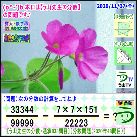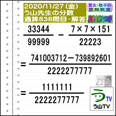 [う山雄一先生の分数]【分数838問目】算数・数学天才問題[2020年11月27日]Fraction □──────────────────□ 【算太・数子の算数教室】(R) 【算数合格トラの巻】 【う山TV(スタディ)】 【う山TV(バラエティ)】 【カンブリア・アカデミー】 □──────────────────□ (o^-')b 大人気☆[う山先生式・分数計算]の問題です♪ □──────────────────□ □ 2020/11/27(金曜) □ (o^-')b 【う山先生の分数・通算838問目】 [分数問題(2020年48問目)] 本日は2020年11月27日です。 次の分数計算をしてね♪ 33344/99999 -(7×7×151)/22223 = ? □ 【答え】後程♪ □ □──────────────────□ (*^ー^)ノ[う山先生の分数(2020年48問目)]です☆ 本日は【う山先生の分数・838問目】です☆ 本日、11月27日に相応しい面白い分数問題を作りました☆ 分子・分母ともどうなるかな♪ □ [Fraction of Professor Uyama] доля Frakcja Fracao □──────────────────□ 算数・数学・家庭教師・個別指導・質問教室 □──────────────────□ □ □□□□□□□□□□□□□□□□□□□□ [発行者氏名]【う山雄一】 [発行者web]【算数合格トラの巻】 [発行者web]【算太・数子の算数教室】(R) [著作]【算太・数子の算数教室】(R) 「さんた・かずこのさんすうきょうしつ」 [著作]【算遊記】 □ [メインサイト]う山先生のHP https://uyama.theblog.me/ □ [中学受験・算数]メイン http://uyama.aikotoba.jp/ [中学受験・算数]サブ https://sansu.theblog.me/ http://santakazuko.wix.com/uyama □ [成績表・偏差値アップ] http://uyama.aikotoba.jp/seiseki/seiseki.html □ [算遊記(さんゆうき)]算蔵法師・算悟空 http://www.geocities.jp/san_yu_ki/(←工事中) □ [仕事用フェイスブック] https://www.facebook.com/kazuko.santa.5/ □ [全般メール] ??????@gmail.com □ [中学受験・仕事用メール] ??????@gmail.com □ [ブログ]【算数合格トラの巻】 http://ameblo.jp/sansu/ http://uyama.blog.jp/ https://blog.goo.ne.jp/sansu_gokaku □ [ブログ]【算太・数子の算数教室】(R) http://ameblo.jp/santa-kazuko/ http://blog.goo.ne.jp/santa_kazuko http://santakazuko.wordpress.com/ http://santa-kazuko.at.webry.info/ http://santa-kazuko.blogspot.jp/ http://ch.nicovideo.jp/santa-kazuko http://santa-kazuko.blog.jp/ □ [ブログ]【う山先生】 http://happy.ap.teacup.com/uyama/ http://sansugokaku.blog.fc2.com/ https://uyama-sensei.hatenablog.com/ □ [ブログ]【オルドビスキー博士】 http://ameblo.jp/ordovisky/ □ [ブログ]【う山TV】 https://ameblo.jp/uyama-tv/ □ [動画一覧]【う山TV】(スタディ/バラエティ) http://uyama.aikotoba.jp/3-uyama-tv.html □ [動画一覧]【う山TV】 https://uyama-tv.themedia.jp/ □ [作曲一覧]【う山TV】(作曲) https://uyama-tv.amebaownd.com/ □ [分数、楽しい!]シリーズ [分数で算数・数学の天才になろう♪]シリーズ [知的ゲーム]シリーズ [一瞬で解こう!]シリーズ [解けたら天才♪]シリーズ [家庭教師]シリーズ [算数・面白い問題]シリーズ [算数・数学ファイル/SSファイル]シリーズ 【音楽・作曲】シリーズ 【空耳】シリーズ 【恋愛探偵サララ】シリーズ 【ランキング】シリーズ □ □ 【毎日の問題ブログ】一覧(お好きなブログを登録してね♪) http://uyama.aikotoba.jp/2-blog.html □ □□□□□□□□□□□□□□□□□□□□ ☆ ☆ ☆ ☆ ☆ ☆ ☆ ☆ ☆ ☆