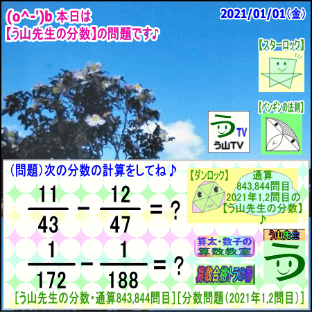 [う山雄一先生の分数]【分数843、844問目】算数・数学天才問題[2021年1月1日]Fraction □──────────────────□ 【算太・数子の算数教室】(R) 【算数合格トラの巻】 【う山TV(スタディ)】 【う山TV(バラエティ)】 【カンブリア・アカデミー】 □──────────────────□ (o^-')b 大人気☆[う山先生式・分数計算]の問題です♪ □──────────────────□ □ 2021/01/01(金曜) □ (o^-')b 【う山先生の分数・通算843,844問目】 [分数問題(2021年01,02問目)] 本日は2021年1月1日です。 次の分数計算をしてね♪ 11/43 - 12/47 = ? 1/172 - 1/188 = ? □ 【答え】後程♪ □ □──────────────────□ (*^ー^)ノ 本日は、2021年元旦に相応しい面白い分数問題を作りました☆ 分子・分母ともどうなるかな♪ □ [Fraction of Professor Uyama] доля Frakcja Fracao □──────────────────□ 算数・数学・家庭教師・個別指導・質問教室 □──────────────────□ □ □□□□□□□□□□□□□□□□□□□□ [発行者氏名]【う山雄一】 [発行者web]【算数合格トラの巻】 [発行者web]【算太・数子の算数教室】(R) [著作]【算太・数子の算数教室】(R) 「さんた・かずこのさんすうきょうしつ」 [著作]【算遊記】 □ [メインサイト]う山先生のHP https://uyama.theblog.me/ □ [中学受験・算数]メイン http://uyama.aikotoba.jp/ [中学受験・算数]サブ https://sansu.theblog.me/ http://santakazuko.wix.com/uyama □ [成績表・偏差値アップ] http://uyama.aikotoba.jp/seiseki/seiseki.html □ [算遊記(さんゆうき)]算蔵法師・算悟空 http://www.geocities.jp/san_yu_ki/(←工事中) □ [仕事用フェイスブック] https://www.facebook.com/kazuko.santa.5/ □ [全般メール] ??????@gmail.com □ [中学受験・仕事用メール] ??????@gmail.com □ [ブログ]【算数合格トラの巻】 http://ameblo.jp/sansu/ http://uyama.blog.jp/ https://blog.goo.ne.jp/sansu_gokaku □ [ブログ]【算太・数子の算数教室】(R) http://ameblo.jp/santa-kazuko/ http://blog.goo.ne.jp/santa_kazuko http://santakazuko.wordpress.com/ http://santa-kazuko.at.webry.info/ http://santa-kazuko.blogspot.jp/ http://ch.nicovideo.jp/santa-kazuko http://santa-kazuko.blog.jp/ □ [ブログ]【う山先生】 http://happy.ap.teacup.com/uyama/ http://sansugokaku.blog.fc2.com/ https://uyama-sensei.hatenablog.com/ □ [ブログ]【オルドビスキー博士】 http://ameblo.jp/ordovisky/ □ [ブログ]【う山TV】 https://ameblo.jp/uyama-tv/ □ [動画一覧]【う山TV】(スタディ/バラエティ) http://uyama.aikotoba.jp/3-uyama-tv.html □ [動画一覧]【う山TV】 https://uyama-tv.themedia.jp/ □ [作曲一覧]【う山TV】(作曲) https://uyama-tv.amebaownd.com/ □ [分数、楽しい!]シリーズ [分数で算数・数学の天才になろう♪]シリーズ [知的ゲーム]シリーズ [一瞬で解こう!]シリーズ [解けたら天才♪]シリーズ [家庭教師]シリーズ [算数・面白い問題]シリーズ [算数・数学ファイル/SSファイル]シリーズ 【音楽・作曲】シリーズ 【空耳】シリーズ 【恋愛探偵サララ】シリーズ 【ランキング】シリーズ □ □ 【毎日の問題ブログ】一覧(お好きなブログを登録してね♪) http://uyama.aikotoba.jp/2-blog.html □ □□□□□□□□□□□□□□□□□□□□ ☆ ☆ ☆ ☆ ☆ ☆ ☆ ☆ ☆ ☆ ☆