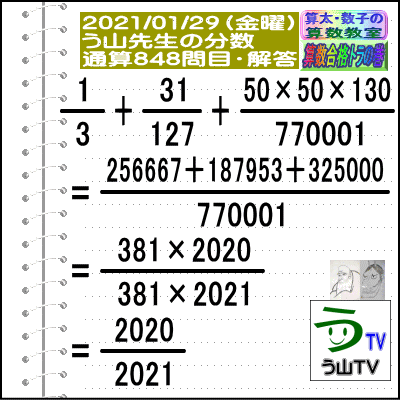 [う山先生・分数]【算数・数学】848問目【う山先生からの挑戦状】[2021年1月29日] □──────────────────□ (o^-')b【算数合格トラの巻】 【算太・数子の算数教室】(R) 【う山TV】 【カンブリア・アカデミー】 [Fraction of Professor Uyama] □──────────────────□ □ 2021/01/29(金曜) □ (o^-')b 【う山先生の分数・通算848問目】 [分数問題(2021年06問目)] 本日は2021年1月29日です。 次の分数計算をしてね♪ 1/3 + 31/127 +(50×50×130)/770001 = ? □ □──────────────────□ □ (*^ー^)ノ 今回も、4年生・5年生でも、 頑張れば、楽しく解ける分数問題です☆ [う山先生の分数]は、 昨年2020年迄で、 合計【842問】作りました☆ 今年も、わかりやすく通し番号(通算番号)と、 その年の作成番号でいきます♪ □ 本日も人気の【う山雄一先生の分数問題】です! 楽しく解いてみて下さい♪(^^) □ [YouTube]の【う山TV】の分数動画も参照してね☆ □ 本日も、面白い分数問題を作成しました! 分母・分子はどうなるかな? 頑張って、5分以内で正解して下さい。 『算数は面白い!』を実感してね♪(^0^)/ □ [計算問題]を楽しんで解いて、 【算数は面白い!で算数合格】しましょう☆(o^-')b □ う山先生の予想正答率は、 堂々と正解 → 30%以下 頑張って正解 → 30%以下 頑張ったけど惜しくも不正解 → 1%以下 約分可能かどうか悩んで不正解 → 1%以下 です。 □ ではレッツ・ゴー!! ☆(^o^)/ □ 答えは、 ↓ ↓ ↓ ↓ ↓ ↓ ↓ ↓ ↓ □ ==================== □ ♪( ´θ`)ノ 【う山先生の分数・通算848問目】解答 [分数問題(2020年6問目)] □ 【答え】[2020/2021]です。 (分子=2020→4桁) (分母=2021→4桁) □ (解法) 1/3 + 31/127 +(50×50×130)/770001 =256667/770001+187953/770001+325000/770001 =769620/770001 =(381×2020)/(381×2021) =2020/2021 □ □ ==================== □ ♪( ´θ`)ノ 本日も面白い数字の分数を作成しました♪ 本日は、2021年にふさわしい分数問題です☆ □ 分子は[2020=去年→4桁] 分子は[2021=今年→4桁] です☆ □ □ □===========□ □ 【参照】 ♪( ´θ`)ノ 【う山先生の分数・通算847問目】解答 [分数問題(2020年5問目)] □ (解法) 2/3 - 31/127 -(50×50×130)/770001 =513334/770001-187953/770001-325000/770001 =381/770001 =381/(381×2021) =1/2021 □ □===========□ □ □ ♪( ´ ▽ ` )ノ もちろん、答えは既約分数です☆ □ □ ==================== □ (*^ー^)ノ[参考] (127=素数) (770001=3×43×47×127=381×2021) (31=素数) (50×50×130=325000=2×2×2×5×5×5×5×5×13) (2020[4桁]=2×2×5×101) (2021[4桁]=43×47) □ □──────────────────□ □ □□□□□□□□□□□ [参考] 【う山先生の分数】通算848問目 [2013年]40問 [2014年]135問 [2015年]143問 [2016年]131問 [2017年]128問 [2018年]108問 [2019年]105問 [2020年]52問 □ [2021年] 2021/01/01(金)[1/2021] 2021/01/01(金)[1/2021] 2021/01/08(金)[1/2021] 2021/01/15(金)[1/2021] 2021/01/22(金)[1/2021] 2021/01/29(金)[2020/2021]←本日(o^-')b □ □□□□□□□□□□□ □ □──────────────────□ 算数・数学・家庭教師・個別指導・質問教室 □──────────────────□ □ □□□□□□□□□□□□□□□□□□□□ [氏名]【う山雄一】 [動画]【う山TV(スタディ)】 [動画]【う山TV(バラエティ)】 [著書]【算太・数子の算数教室】(R) □ [メインサイト]【う山先生のHP】 https://uyama.theblog.me/ □ [中学受験・算数]メイン http://uyama.aikotoba.jp/ □ [中学生] https://uyama-sensei.theblog.me/ □ [高校生] https://uyama-sensei.amebaownd.com/ □ [成績表・偏差値アップ] http://uyama.aikotoba.jp/seiseki/seiseki.html □ [ブログ一覧]【ブログ魂】 http://uyama.aikotoba.jp/2-blog.html □ [動画一覧]【う山TV】(アメーバ) https://uyama-tv.themedia.jp/ □ [作曲一覧]【う山TV】(作曲) https://uyama-tv.amebaownd.com/ □ □ [YouTube・チャンネル]【う山TV】(スタディ) https://www.youtube.com/channel/UCnMIEU_iFTH2iP5uAH1qevQ □ □ [YouTube・チャンネル]【う山TV】(バラエティ) https://www.youtube.com/channel/UC32D4Nf7sEpxD_VvoaHsJaA □ □ 【う山先生の分数】一覧 https://uyama.themedia.jp/ □ □□□□□□□□□□□□□□□□□□□□ ☆ ☆ ☆ ☆ ☆ ☆ ☆ ☆ ☆ ☆ ☆