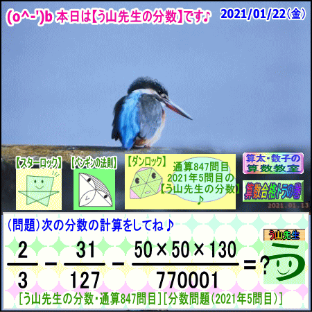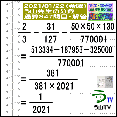 [う山雄一先生の分数]【分数847問目】算数・数学天才問題[2021年1月22日]Fraction □──────────────────□ 【算太・数子の算数教室】(R) 【算数合格トラの巻】 【う山TV(スタディ)】 【う山TV(バラエティ)】 【カンブリア・アカデミー】 □──────────────────□ (o^-')b 大人気☆[う山先生式・分数計算]の問題です♪ □──────────────────□ □ 2021/01/22(金曜) □ (o^-')b 【う山先生の分数・通算847問目】 [分数問題(2021年05問目)] 本日は2021年1月22日です。 次の分数計算をしてね♪ 2/3 - 31/127 -(50×50×130)/770001 = ? 【答え】後程♪ □ □──────────────────□ (*^ー^)ノ 本日は、2021年に相応しい面白い分数問題を作りました☆ 分子・分母ともどうなるかな♪ □ [Fraction of Professor Uyama] доля Frakcja Fracao □──────────────────□ 算数・数学・家庭教師・個別指導・質問教室 □──────────────────□ □ □□□□□□□□□□□□□□□□□□□□ [発行者氏名]【う山雄一】 [発行者web]【算数合格トラの巻】 [発行者web]【算太・数子の算数教室】(R) [著作]【算太・数子の算数教室】(R) 「さんた・かずこのさんすうきょうしつ」 [著作]【算遊記】 □ [メインサイト]う山先生のHP https://uyama.theblog.me/ □ [中学受験・算数]メイン http://uyama.aikotoba.jp/ [中学受験・算数]サブ https://sansu.theblog.me/ http://santakazuko.wix.com/uyama □ [成績表・偏差値アップ] http://uyama.aikotoba.jp/seiseki/seiseki.html □ [算遊記(さんゆうき)]算蔵法師・算悟空 http://www.geocities.jp/san_yu_ki/(←工事中) □ [仕事用フェイスブック] https://www.facebook.com/kazuko.santa.5/ □ [全般メール] ??????@gmail.com □ [中学受験・仕事用メール] ??????@gmail.com □ [ブログ]【算数合格トラの巻】 http://ameblo.jp/sansu/ http://uyama.blog.jp/ https://blog.goo.ne.jp/sansu_gokaku □ [ブログ]【算太・数子の算数教室】(R) http://ameblo.jp/santa-kazuko/ http://blog.goo.ne.jp/santa_kazuko http://santakazuko.wordpress.com/ http://santa-kazuko.at.webry.info/ http://santa-kazuko.blogspot.jp/ http://ch.nicovideo.jp/santa-kazuko http://santa-kazuko.blog.jp/ □ [ブログ]【う山先生】 http://happy.ap.teacup.com/uyama/ http://sansugokaku.blog.fc2.com/ https://uyama-sensei.hatenablog.com/ □ [ブログ]【オルドビスキー博士】 http://ameblo.jp/ordovisky/ □ [ブログ]【う山TV】 https://ameblo.jp/uyama-tv/ □ [動画一覧]【う山TV】(スタディ/バラエティ) http://uyama.aikotoba.jp/3-uyama-tv.html □ [動画一覧]【う山TV】 https://uyama-tv.themedia.jp/ □ [作曲一覧]【う山TV】(作曲) https://uyama-tv.amebaownd.com/ □ [分数、楽しい!]シリーズ [分数で算数・数学の天才になろう♪]シリーズ [知的ゲーム]シリーズ [一瞬で解こう!]シリーズ [解けたら天才♪]シリーズ [家庭教師]シリーズ [算数・面白い問題]シリーズ [算数・数学ファイル/SSファイル]シリーズ 【音楽・作曲】シリーズ 【空耳】シリーズ 【恋愛探偵サララ】シリーズ 【ランキング】シリーズ □ □ 【毎日の問題ブログ】一覧(お好きなブログを登録してね♪) http://uyama.aikotoba.jp/2-blog.html □ □□□□□□□□□□□□□□□□□□□□ ☆ ☆ ☆ ☆ ☆ ☆ ☆ ☆ ☆ ☆ ☆