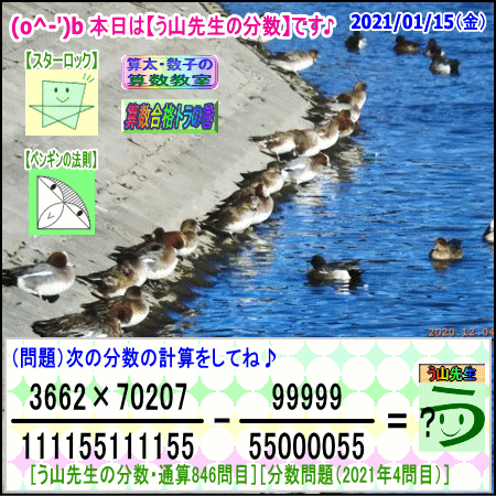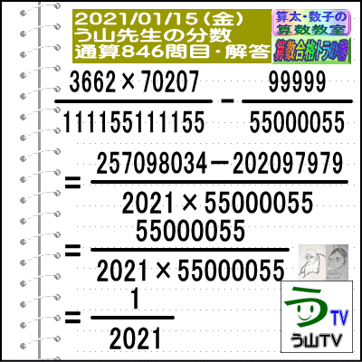 [う山雄一先生の分数]【分数846問目】算数・数学天才問題[2021年1月15日]Fraction □──────────────────□ 【算太・数子の算数教室】(R) 【算数合格トラの巻】 【う山TV(スタディ)】 【う山TV(バラエティ)】 【カンブリア・アカデミー】 □──────────────────□ (o^-')b 大人気☆[う山先生式・分数計算]の問題です♪ □──────────────────□ □ 2021/01/15(金曜) □ (o^-')b 【う山先生の分数・通算846問目】 [分数問題(2021年04問目)] 本日は2021年1月15日です。 次の分数計算をしてね♪ (3662×70207)/111155111155 - 99999/55000055 = ? □ 【答え】後程♪ □ □──────────────────□ (*^ー^)ノ 本日は、2021年に相応しい面白い分数問題を作りました☆ 分子・分母ともどうなるかな♪ □ [Fraction of Professor Uyama] доля Frakcja Fracao □──────────────────□ 算数・数学・家庭教師・個別指導・質問教室 □──────────────────□ □ □□□□□□□□□□□□□□□□□□□□ [発行者氏名]【う山雄一】 [発行者web]【算数合格トラの巻】 [発行者web]【算太・数子の算数教室】(R) [著作]【算太・数子の算数教室】(R) 「さんた・かずこのさんすうきょうしつ」 [著作]【算遊記】 □ [メインサイト]う山先生のHP https://uyama.theblog.me/ □ [中学受験・算数]メイン http://uyama.aikotoba.jp/ [中学受験・算数]サブ https://sansu.theblog.me/ http://santakazuko.wix.com/uyama □ [成績表・偏差値アップ] http://uyama.aikotoba.jp/seiseki/seiseki.html □ [算遊記(さんゆうき)]算蔵法師・算悟空 http://www.geocities.jp/san_yu_ki/(←工事中) □ [仕事用フェイスブック] https://www.facebook.com/kazuko.santa.5/ □ [全般メール] ??????@gmail.com □ [中学受験・仕事用メール] ??????@gmail.com □ [ブログ]【算数合格トラの巻】 http://ameblo.jp/sansu/ http://uyama.blog.jp/ https://blog.goo.ne.jp/sansu_gokaku □ [ブログ]【算太・数子の算数教室】(R) http://ameblo.jp/santa-kazuko/ http://blog.goo.ne.jp/santa_kazuko http://santakazuko.wordpress.com/ http://santa-kazuko.at.webry.info/ http://santa-kazuko.blogspot.jp/ http://ch.nicovideo.jp/santa-kazuko http://santa-kazuko.blog.jp/ □ [ブログ]【う山先生】 http://happy.ap.teacup.com/uyama/ http://sansugokaku.blog.fc2.com/ https://uyama-sensei.hatenablog.com/ □ [ブログ]【オルドビスキー博士】 http://ameblo.jp/ordovisky/ □ [ブログ]【う山TV】 https://ameblo.jp/uyama-tv/ □ [動画一覧]【う山TV】(スタディ/バラエティ) http://uyama.aikotoba.jp/3-uyama-tv.html □ [動画一覧]【う山TV】 https://uyama-tv.themedia.jp/ □ [作曲一覧]【う山TV】(作曲) https://uyama-tv.amebaownd.com/ □ [分数、楽しい!]シリーズ [分数で算数・数学の天才になろう♪]シリーズ [知的ゲーム]シリーズ [一瞬で解こう!]シリーズ [解けたら天才♪]シリーズ [家庭教師]シリーズ [算数・面白い問題]シリーズ [算数・数学ファイル/SSファイル]シリーズ 【音楽・作曲】シリーズ 【空耳】シリーズ 【恋愛探偵サララ】シリーズ 【ランキング】シリーズ □ □ 【毎日の問題ブログ】一覧(お好きなブログを登録してね♪) http://uyama.aikotoba.jp/2-blog.html □ □□□□□□□□□□□□□□□□□□□□ ☆ ☆ ☆ ☆ ☆ ☆ ☆ ☆ ☆ ☆ ☆