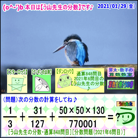 [う山雄一先生の分数]【分数848問目】算数・数学天才問題[2021年1月29日]Fraction □──────────────────□ 【算太・数子の算数教室】(R) 【算数合格トラの巻】 【う山TV(スタディ)】 【う山TV(バラエティ)】 【カンブリア・アカデミー】 □──────────────────□ (o^-')b 大人気☆[う山先生式・分数計算]の問題です♪ □──────────────────□ □ 2021/01/29(金曜) □ (o^-')b 【う山先生の分数・通算848問目】 [分数問題(2021年06問目)] 本日は2021年1月29日です。 次の分数計算をしてね♪ 1/3 + 31/127 +(50×50×130)/770001 = ? 【答え】後程♪ □ □──────────────────□ (*^ー^)ノ 本日は、2021年に相応しい面白い分数問題を作りました☆ 分子・分母ともどうなるかな♪ □ [Fraction of Professor Uyama] доля Frakcja Fracao □──────────────────□ 算数・数学・家庭教師・個別指導・質問教室 □──────────────────□ □ □□□□□□□□□□□□□□□□□□□□ [発行者氏名]【う山雄一】 [発行者web]【算数合格トラの巻】 [発行者web]【算太・数子の算数教室】(R) [著作]【算太・数子の算数教室】(R) 「さんた・かずこのさんすうきょうしつ」 [著作]【算遊記】 □ [メインサイト]う山先生のHP https://uyama.theblog.me/ □ [中学受験・算数]メイン http://uyama.aikotoba.jp/ [中学受験・算数]サブ https://sansu.theblog.me/ http://santakazuko.wix.com/uyama □ [成績表・偏差値アップ] http://uyama.aikotoba.jp/seiseki/seiseki.html □ [算遊記(さんゆうき)]算蔵法師・算悟空 http://www.geocities.jp/san_yu_ki/(←工事中) □ [仕事用フェイスブック] https://www.facebook.com/kazuko.santa.5/ □ [全般メール] ??????@gmail.com □ [中学受験・仕事用メール] ??????@gmail.com □ [ブログ]【算数合格トラの巻】 http://ameblo.jp/sansu/ http://uyama.blog.jp/ https://blog.goo.ne.jp/sansu_gokaku □ [ブログ]【算太・数子の算数教室】(R) http://ameblo.jp/santa-kazuko/ http://blog.goo.ne.jp/santa_kazuko http://santakazuko.wordpress.com/ http://santa-kazuko.at.webry.info/ http://santa-kazuko.blogspot.jp/ http://ch.nicovideo.jp/santa-kazuko http://santa-kazuko.blog.jp/ □ [ブログ]【う山先生】 http://happy.ap.teacup.com/uyama/ http://sansugokaku.blog.fc2.com/ https://uyama-sensei.hatenablog.com/ □ [ブログ]【オルドビスキー博士】 http://ameblo.jp/ordovisky/ □ [ブログ]【う山TV】 https://ameblo.jp/uyama-tv/ □ [動画一覧]【う山TV】(スタディ/バラエティ) http://uyama.aikotoba.jp/3-uyama-tv.html □ [動画一覧]【う山TV】 https://uyama-tv.themedia.jp/ □ [作曲一覧]【う山TV】(作曲) https://uyama-tv.amebaownd.com/ □ [分数、楽しい!]シリーズ [分数で算数・数学の天才になろう♪]シリーズ [知的ゲーム]シリーズ [一瞬で解こう!]シリーズ [解けたら天才♪]シリーズ [家庭教師]シリーズ [算数・面白い問題]シリーズ [算数・数学ファイル/SSファイル]シリーズ 【音楽・作曲】シリーズ 【空耳】シリーズ 【恋愛探偵サララ】シリーズ 【ランキング】シリーズ □ □ 【毎日の問題ブログ】一覧(お好きなブログを登録してね♪) http://uyama.aikotoba.jp/2-blog.html □ □□□□□□□□□□□□□□□□□□□□ ☆ ☆ ☆ ☆ ☆ ☆ ☆ ☆ ☆ ☆ ☆