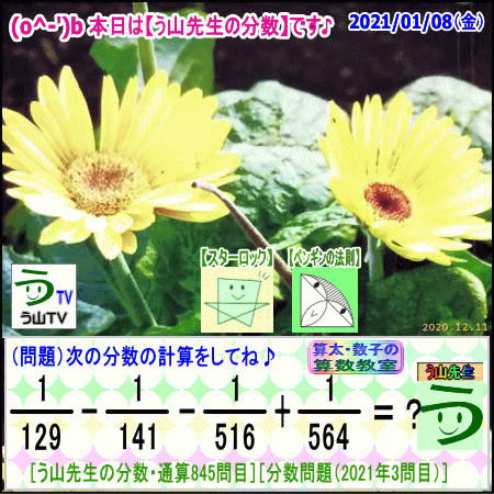 [う山雄一先生の分数]【分数845問目】算数・数学天才問題[2021年1月8日]Fraction □──────────────────□ 【算太・数子の算数教室】(R) 【算数合格トラの巻】 【う山TV(スタディ)】 【う山TV(バラエティ)】 【カンブリア・アカデミー】 □──────────────────□ (o^-')b 大人気☆[う山先生式・分数計算]の問題です♪ □──────────────────□ □ 2021/01/08(金曜) □ (o^-')b 【う山先生の分数・通算845問目】 [分数問題(2021年03問目)] 本日は2021年1月8日です。 次の分数計算をしてね♪ 1/129 - 1/141 - 1/516 + 1/564 = ? □ 【答え】後程♪ □ □──────────────────□ (*^ー^)ノ 本日は、2021年に相応しい面白い分数問題を作りました☆ 分子・分母ともどうなるかな♪ □ [Fraction of Professor Uyama] доля Frakcja Fracao □──────────────────□ 算数・数学・家庭教師・個別指導・質問教室 □──────────────────□ □ □□□□□□□□□□□□□□□□□□□□ [発行者氏名]【う山雄一】 [発行者web]【算数合格トラの巻】 [発行者web]【算太・数子の算数教室】(R) [著作]【算太・数子の算数教室】(R) 「さんた・かずこのさんすうきょうしつ」 [著作]【算遊記】 □ [メインサイト]う山先生のHP https://uyama.theblog.me/ □ [中学受験・算数]メイン http://uyama.aikotoba.jp/ [中学受験・算数]サブ https://sansu.theblog.me/ http://santakazuko.wix.com/uyama □ [成績表・偏差値アップ] http://uyama.aikotoba.jp/seiseki/seiseki.html □ [算遊記(さんゆうき)]算蔵法師・算悟空 http://www.geocities.jp/san_yu_ki/(←工事中) □ [仕事用フェイスブック] https://www.facebook.com/kazuko.santa.5/ □ [全般メール] ??????@gmail.com □ [中学受験・仕事用メール] ??????@gmail.com □ [ブログ]【算数合格トラの巻】 http://ameblo.jp/sansu/ http://uyama.blog.jp/ https://blog.goo.ne.jp/sansu_gokaku □ [ブログ]【算太・数子の算数教室】(R) http://ameblo.jp/santa-kazuko/ http://blog.goo.ne.jp/santa_kazuko http://santakazuko.wordpress.com/ http://santa-kazuko.at.webry.info/ http://santa-kazuko.blogspot.jp/ http://ch.nicovideo.jp/santa-kazuko http://santa-kazuko.blog.jp/ □ [ブログ]【う山先生】 http://happy.ap.teacup.com/uyama/ http://sansugokaku.blog.fc2.com/ https://uyama-sensei.hatenablog.com/ □ [ブログ]【オルドビスキー博士】 http://ameblo.jp/ordovisky/ □ [ブログ]【う山TV】 https://ameblo.jp/uyama-tv/ □ [動画一覧]【う山TV】(スタディ/バラエティ) http://uyama.aikotoba.jp/3-uyama-tv.html □ [動画一覧]【う山TV】 https://uyama-tv.themedia.jp/ □ [作曲一覧]【う山TV】(作曲) https://uyama-tv.amebaownd.com/ □ [分数、楽しい!]シリーズ [分数で算数・数学の天才になろう♪]シリーズ [知的ゲーム]シリーズ [一瞬で解こう!]シリーズ [解けたら天才♪]シリーズ [家庭教師]シリーズ [算数・面白い問題]シリーズ [算数・数学ファイル/SSファイル]シリーズ 【音楽・作曲】シリーズ 【空耳】シリーズ 【恋愛探偵サララ】シリーズ 【ランキング】シリーズ □ □ 【毎日の問題ブログ】一覧(お好きなブログを登録してね♪) http://uyama.aikotoba.jp/2-blog.html □ □□□□□□□□□□□□□□□□□□□□ ☆ ☆ ☆ ☆ ☆ ☆ ☆ ☆ ☆ ☆ ☆