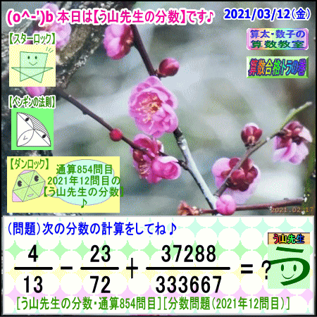 [う山雄一先生の分数]【分数854問目】算数・数学天才問題[2021年3月12日]Fraction □──────────────────□ 【算太・数子の算数教室】(R) 【算数合格トラの巻】 【う山TV(スタディ)】 【う山TV(バラエティ)】 【カンブリア・アカデミー】 □──────────────────□ (o^-')b 大人気☆[う山先生式・分数計算]の問題です♪ □──────────────────□ □ 2021/03/12(金曜) □ (o^-')b 【う山先生の分数・通算854問目】 [分数問題(2021年12問目)] 本日は2021年3月12日です。 次の分数計算をしてね♪ 4/13 - 23/72 + 37288/333667 = ? 【答え】後程♪ □ □──────────────────□ (*^ー^)ノ 本日も面白い分数問題を作りました☆ 分子・分母ともどうなるかな♪ 本日、3月12日に相応しい答えの分数問題です☆ □ [Fraction of Professor Uyama] доля Frakcja Fracao □──────────────────□ 算数・数学・家庭教師・個別指導・質問教室 □──────────────────□ □ □□□□□□□□□□□□□□□□□□□□ [発行者氏名]【う山雄一】 [発行者web]【算数合格トラの巻】 [発行者web]【算太・数子の算数教室】(R) [著作]【算太・数子の算数教室】(R) 「さんた・かずこのさんすうきょうしつ」 [著作]【算遊記】 □ [メインサイト]う山先生のHP https://uyama.theblog.me/ □ [中学受験・算数]メイン http://uyama.aikotoba.jp/ [中学受験・算数]サブ https://sansu.theblog.me/ http://santakazuko.wix.com/uyama □ [成績表・偏差値アップ] http://uyama.aikotoba.jp/seiseki/seiseki.html □ [算遊記(さんゆうき)]算蔵法師・算悟空 http://www.geocities.jp/san_yu_ki/(←工事中) □ [仕事用フェイスブック] https://www.facebook.com/kazuko.santa.5/ □ [全般メール] ??????@gmail.com □ [中学受験・仕事用メール] ??????@gmail.com □ [ブログ]【算数合格トラの巻】 http://ameblo.jp/sansu/ http://uyama.blog.jp/ https://blog.goo.ne.jp/sansu_gokaku □ [ブログ]【算太・数子の算数教室】(R) http://ameblo.jp/santa-kazuko/ http://blog.goo.ne.jp/santa_kazuko http://santakazuko.wordpress.com/ http://santa-kazuko.at.webry.info/ http://santa-kazuko.blogspot.jp/ http://ch.nicovideo.jp/santa-kazuko http://santa-kazuko.blog.jp/ □ [ブログ]【う山先生】 http://happy.ap.teacup.com/uyama/ http://sansugokaku.blog.fc2.com/ https://uyama-sensei.hatenablog.com/ □ [ブログ]【オルドビスキー博士】 http://ameblo.jp/ordovisky/ □ [ブログ]【う山TV】 https://ameblo.jp/uyama-tv/ □ [動画一覧]【う山TV】(スタディ/バラエティ) http://uyama.aikotoba.jp/3-uyama-tv.html □ [動画一覧]【う山TV】 https://uyama-tv.themedia.jp/ □ [作曲一覧]【う山TV】(作曲) https://uyama-tv.amebaownd.com/ □ [分数、楽しい!]シリーズ [分数で算数・数学の天才になろう♪]シリーズ [知的ゲーム]シリーズ [一瞬で解こう!]シリーズ [解けたら天才♪]シリーズ [家庭教師]シリーズ [算数・面白い問題]シリーズ [算数・数学ファイル/SSファイル]シリーズ 【音楽・作曲】シリーズ 【空耳】シリーズ 【恋愛探偵サララ】シリーズ 【ランキング】シリーズ □ □ 【毎日の問題ブログ】一覧(お好きなブログを登録してね♪) http://uyama.aikotoba.jp/2-blog.html □ □□□□□□□□□□□□□□□□□□□□ ☆ ☆ ☆ ☆ ☆ ☆ ☆ ☆ ☆ ☆ ☆