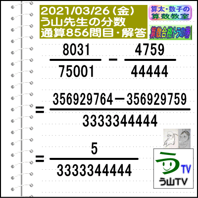 [う山先生・分数]【算数・数学】856問目【う山先生からの挑戦状】[2021年3月26日] □──────────────────□ (o^-')b【算数合格トラの巻】 【算太・数子の算数教室】(R) 【う山TV】 【カンブリア・アカデミー】 [Fraction of Professor Uyama] □──────────────────□ □ 2021/03/26(金曜) □ (o^-')b 【う山先生の分数・通算856問目】 [分数問題(2021年14問目)] 本日は2021年3月26日です。 次の分数計算をしてね♪ 8031/75001 - 4759/44444 = ? □ □──────────────────□ □ (*^ー^)ノ 今回も、4年生・5年生でも、 頑張れば、楽しく解ける分数問題です☆ [う山先生の分数]は、 昨年2020年迄で、 合計【842問】作りました☆ 今年も、わかりやすく通し番号(通算番号)と、 その年の作成番号でいきます♪ □ 本日も人気の【う山雄一先生の分数問題】です! 楽しく解いてみて下さい♪(^^) □ [YouTube]の【う山TV】の分数動画も参照してね☆ □ 本日も、面白い分数問題を作成しました! 分母・分子はどうなるかな? 頑張って、5分以内で正解して下さい。 『算数は面白い!』を実感してね♪(^0^)/ □ [計算問題]を楽しんで解いて、 【算数は面白い!で算数合格】しましょう☆(o^-')b □ う山先生の予想正答率は、 堂々と正解 → 34%以下 頑張って正解 → 34%以下 頑張ったけど惜しくも不正解 → 5%以下 約分可能かどうか悩んで不正解 → 0.01%以下 です。 □ ではレッツ・ゴー!! ☆(^o^)/ □ 答えは、 ↓ ↓ ↓ ↓ ↓ ↓ ↓ ↓ ↓ □ ==================== □ ♪( ´θ`)ノ 【う山先生の分数・通算856問目】解答 [分数問題(2020年14問目)] □ 【答え】[5/3333344444]です。 (分子=5→1桁) (分母=3333344444→10桁) □ (解法) 8031/75001 - 4759/44444 =356929764/3333344444-356929759/3333344444 =5/3333344444 □ □ ==================== □ ♪( ´θ`)ノ 本日も面白い数字の分数を作成しました♪ 本日は、3月に相応しい答えの分数問題です☆ □ 分子は[5=→1桁] 分子は[3333344444=3が5個+4が5個→10桁] です☆ □ □ ♪( ´ ▽ ` )ノ もちろん、答えは既約分数です☆ □ □ ==================== □ (*^ー^)ノ[参考] (75001=179×419) (44444=2×2×41×271) (8031=3×2677) (4759=素数) (5=素数) (3333344444[10桁]=2×2×41×179×271×419=44444×75001) □ □ □──────────────────□ □ □□□□□□□□□□□ [参考] 【う山先生の分数】通算856問目 [2013年]40問 [2014年]135問 [2015年]143問 [2016年]131問 [2017年]128問 [2018年]108問 [2019年]105問 [2020年]52問 □ [2021年] 2021/01/01(金)[1/2021] 2021/01/01(金)[1/2021] 2021/01/08(金)[1/2021] 2021/01/15(金)[1/2021] 2021/01/22(金)[1/2021] 2021/01/29(金)[2020/2021] 2021/02/05(金)[55555555555/222255552222] 2021/02/12(金)[111111211111/222222122222] 2021/02/19(金)[111111211111/222222122222] 2021/02/26(金)[155555/22666666] □ 2021/03/05(金)[55555333/3333555555] 2021/03/12(金)[31231231/312312312] 2021/03/19(金)[222222222223/333333333332] 2021/03/26(金)[5/3333344444]←本日(o^-')b □ □ □□□□□□□□□□□ □ □──────────────────□ 算数・数学・家庭教師・個別指導・質問教室 □──────────────────□ □ □□□□□□□□□□□□□□□□□□□□ [氏名]【う山雄一】 [動画]【う山TV(スタディ)】 [動画]【う山TV(バラエティ)】 [著書]【算太・数子の算数教室】(R) □ [メインサイト]【う山先生のHP】 https://uyama.theblog.me/ □ [中学受験・算数]メイン http://uyama.aikotoba.jp/ □ [中学生] https://uyama-sensei.theblog.me/ □ [高校生] https://uyama-sensei.amebaownd.com/ □ [成績表・偏差値アップ] http://uyama.aikotoba.jp/seiseki/seiseki.html □ [ブログ一覧]【ブログ魂】 http://uyama.aikotoba.jp/2-blog.html □ [動画一覧]【う山TV】(アメーバ) https://uyama-tv.themedia.jp/ □ [作曲一覧]【う山TV】(作曲) https://uyama-tv.amebaownd.com/ □ □ [YouTube・チャンネル]【う山TV】(スタディ) https://www.youtube.com/channel/UCnMIEU_iFTH2iP5uAH1qevQ □ □ [YouTube・チャンネル]【う山TV】(バラエティ) https://www.youtube.com/channel/UC32D4Nf7sEpxD_VvoaHsJaA □ □ 【う山先生の分数】一覧 https://uyama.themedia.jp/ □ □□□□□□□□□□□□□□□□□□□□ ☆ ☆ ☆ ☆ ☆ ☆ ☆ ☆ ☆ ☆ ☆