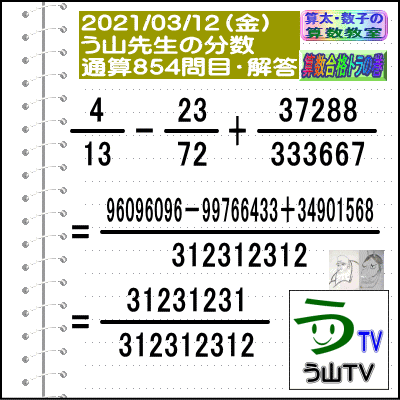[う山先生・分数]【算数・数学】854問目【う山先生からの挑戦状】[2021年3月12日] □──────────────────□ (o^-')b【算数合格トラの巻】 【算太・数子の算数教室】(R) 【う山TV】 【カンブリア・アカデミー】 [Fraction of Professor Uyama] □──────────────────□ □ 2021/03/12(金曜) □ (o^-')b 【う山先生の分数・通算854問目】 [分数問題(2021年12問目)] 本日は2021年3月12日です。 次の分数計算をしてね♪ 4/13 - 23/72 + 37288/333667 = ? □ □──────────────────□ □ (*^ー^)ノ 今回も、4年生・5年生でも、 頑張れば、楽しく解ける分数問題です☆ [う山先生の分数]は、 昨年2020年迄で、 合計【842問】作りました☆ 今年も、わかりやすく通し番号(通算番号)と、 その年の作成番号でいきます♪ □ 本日も人気の【う山雄一先生の分数問題】です! 楽しく解いてみて下さい♪(^^) □ [YouTube]の【う山TV】の分数動画も参照してね☆ □ 本日も、面白い分数問題を作成しました! 分母・分子はどうなるかな? 頑張って、5分以内で正解して下さい。 『算数は面白い!』を実感してね♪(^0^)/ □ [計算問題]を楽しんで解いて、 【算数は面白い!で算数合格】しましょう☆(o^-')b □ う山先生の予想正答率は、 堂々と正解 → 12%以下 頑張って正解 → 12%以下 頑張ったけど惜しくも不正解 → 12%以下 約分可能かどうか悩んで不正解 → 12%以下 です。 □ ではレッツ・ゴー!! ☆(^o^)/ □ 答えは、 ↓ ↓ ↓ ↓ ↓ ↓ ↓ ↓ ↓ □ ==================== □ ♪( ´θ`)ノ 【う山先生の分数・通算854問目】解答 [分数問題(2020年12問目)] □ 【答え】[31231231/312312312]です。 (分子=31231231→8桁) (分母=312312312→9桁) □ (解法) 4/13 - 23/72 + 37288/333667 =96096096/312312312-99766433/312312312+34901568/312312312 =31231231/312312312 □ □ ==================== □ ♪( ´θ`)ノ 本日も面白い数字の分数を作成しました♪ 本日、3月12日に相応しい答えの分数問題です☆ □ 分子は[31231231=312+312+31→8桁] 分子は[312312312=312+312+312→9桁] です☆ □ □ ♪( ´ ▽ ` )ノ もちろん、答えは既約分数です☆ □ □ ==================== □ (*^ー^)ノ[参考] (13=素数) (72=2×2×2×3×3) (333667=素数) (4=2×2) (23=素数) (37288=2×2×2×59×79) (31231231[桁]=19×29×56681) (312312312[桁]=2×2×2×3×3×13×333667=13×72×333667) □ □ □──────────────────□ □ □□□□□□□□□□□ [参考] 【う山先生の分数】通算854問目 [2013年]40問 [2014年]135問 [2015年]143問 [2016年]131問 [2017年]128問 [2018年]108問 [2019年]105問 [2020年]52問 □ [2021年] 2021/01/01(金)[1/2021] 2021/01/01(金)[1/2021] 2021/01/08(金)[1/2021] 2021/01/15(金)[1/2021] 2021/01/22(金)[1/2021] 2021/01/29(金)[2020/2021] 2021/02/05(金)[55555555555/222255552222] 2021/02/12(金)[111111211111/222222122222] 2021/02/19(金)[111111211111/222222122222] 2021/02/26(金)[155555/22666666] □ 2021/03/05(金)[55555333/3333555555] 2021/03/12(金)[31231231/312312312]←本日(o^-')b □ □ □□□□□□□□□□□ □ □──────────────────□ 算数・数学・家庭教師・個別指導・質問教室 □──────────────────□ □ □□□□□□□□□□□□□□□□□□□□ [氏名]【う山雄一】 [動画]【う山TV(スタディ)】 [動画]【う山TV(バラエティ)】 [著書]【算太・数子の算数教室】(R) □ [メインサイト]【う山先生のHP】 https://uyama.theblog.me/ □ [中学受験・算数]メイン http://uyama.aikotoba.jp/ □ [中学生] https://uyama-sensei.theblog.me/ □ [高校生] https://uyama-sensei.amebaownd.com/ □ [成績表・偏差値アップ] http://uyama.aikotoba.jp/seiseki/seiseki.html □ [ブログ一覧]【ブログ魂】 http://uyama.aikotoba.jp/2-blog.html □ [動画一覧]【う山TV】(アメーバ) https://uyama-tv.themedia.jp/ □ [作曲一覧]【う山TV】(作曲) https://uyama-tv.amebaownd.com/ □ □ [YouTube・チャンネル]【う山TV】(スタディ) https://www.youtube.com/channel/UCnMIEU_iFTH2iP5uAH1qevQ □ □ [YouTube・チャンネル]【う山TV】(バラエティ) https://www.youtube.com/channel/UC32D4Nf7sEpxD_VvoaHsJaA □ □ 【う山先生の分数】一覧 https://uyama.themedia.jp/ □ □□□□□□□□□□□□□□□□□□□□ ☆ ☆ ☆ ☆ ☆ ☆ ☆ ☆ ☆ ☆ ☆