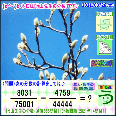 [う山雄一先生の分数]【分数856問目】算数・数学天才問題[2021年3月26日]Fraction □──────────────────□ 【算太・数子の算数教室】(R) 【算数合格トラの巻】 【う山TV(スタディ)】 【う山TV(バラエティ)】 【カンブリア・アカデミー】 □──────────────────□ (o^-')b 大人気☆[う山先生式・分数計算]の問題です♪ □──────────────────□ □ 2021/03/26(金曜) □ (o^-')b 【う山先生の分数・通算856問目】 [分数問題(2021年14問目)] 本日は2021年3月26日です。 次の分数計算をしてね♪ 8031/75001 - 4759/44444 = ? 【答え】後程♪ □ □──────────────────□ (*^ー^)ノ 本日も面白い分数問題を作りました☆ 分子・分母ともどうなるかな♪ 本日は、3月に相応しい答えの分数問題です☆ □ [Fraction of Professor Uyama] доля Frakcja Fracao □──────────────────□ 算数・数学・家庭教師・個別指導・質問教室 □──────────────────□ □ □□□□□□□□□□□□□□□□□□□□ [発行者氏名]【う山雄一】 [発行者web]【算数合格トラの巻】 [発行者web]【算太・数子の算数教室】(R) [著作]【算太・数子の算数教室】(R) 「さんた・かずこのさんすうきょうしつ」 [著作]【算遊記】 □ [メインサイト]う山先生のHP https://uyama.theblog.me/ □ [中学受験・算数]メイン http://uyama.aikotoba.jp/ [中学受験・算数]サブ https://sansu.theblog.me/ http://santakazuko.wix.com/uyama □ [成績表・偏差値アップ] http://uyama.aikotoba.jp/seiseki/seiseki.html □ [算遊記(さんゆうき)]算蔵法師・算悟空 http://www.geocities.jp/san_yu_ki/(←工事中) □ [仕事用フェイスブック] https://www.facebook.com/kazuko.santa.5/ □ [全般メール] ??????@gmail.com □ [中学受験・仕事用メール] ??????@gmail.com □ [ブログ]【算数合格トラの巻】 http://ameblo.jp/sansu/ http://uyama.blog.jp/ https://blog.goo.ne.jp/sansu_gokaku □ [ブログ]【算太・数子の算数教室】(R) http://ameblo.jp/santa-kazuko/ http://blog.goo.ne.jp/santa_kazuko http://santakazuko.wordpress.com/ http://santa-kazuko.at.webry.info/ http://santa-kazuko.blogspot.jp/ http://ch.nicovideo.jp/santa-kazuko http://santa-kazuko.blog.jp/ □ [ブログ]【う山先生】 http://happy.ap.teacup.com/uyama/ http://sansugokaku.blog.fc2.com/ https://uyama-sensei.hatenablog.com/ □ [ブログ]【オルドビスキー博士】 http://ameblo.jp/ordovisky/ □ [ブログ]【う山TV】 https://ameblo.jp/uyama-tv/ □ [動画一覧]【う山TV】(スタディ/バラエティ) http://uyama.aikotoba.jp/3-uyama-tv.html □ [動画一覧]【う山TV】 https://uyama-tv.themedia.jp/ □ [作曲一覧]【う山TV】(作曲) https://uyama-tv.amebaownd.com/ □ [分数、楽しい!]シリーズ [分数で算数・数学の天才になろう♪]シリーズ [知的ゲーム]シリーズ [一瞬で解こう!]シリーズ [解けたら天才♪]シリーズ [家庭教師]シリーズ [算数・面白い問題]シリーズ [算数・数学ファイル/SSファイル]シリーズ 【音楽・作曲】シリーズ 【空耳】シリーズ 【恋愛探偵サララ】シリーズ 【ランキング】シリーズ □ □ 【毎日の問題ブログ】一覧(お好きなブログを登録してね♪) http://uyama.aikotoba.jp/2-blog.html □ □□□□□□□□□□□□□□□□□□□□ ☆ ☆ ☆ ☆ ☆ ☆ ☆ ☆ ☆ ☆ ☆