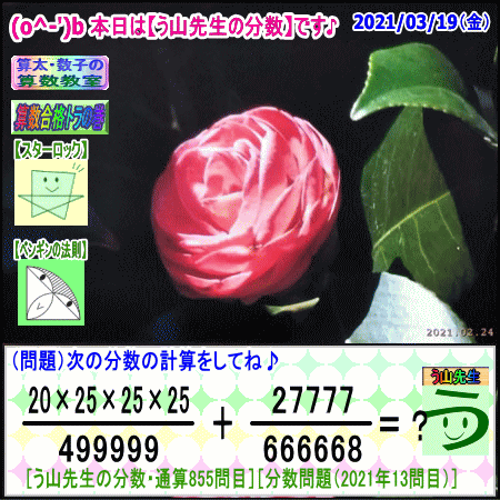 [う山雄一先生の分数]【分数855問目】算数・数学天才問題[2021年3月19日]Fraction □──────────────────□ 【算太・数子の算数教室】(R) 【算数合格トラの巻】 【う山TV(スタディ)】 【う山TV(バラエティ)】 【カンブリア・アカデミー】 □──────────────────□ (o^-')b 大人気☆[う山先生式・分数計算]の問題です♪ □──────────────────□ □ 2021/03/19(金曜) □ (o^-')b 【う山先生の分数・通算855問目】 [分数問題(2021年13問目)] 本日は2021年3月19日です。 次の分数計算をしてね♪ (20×25×25×25)/499999 + 27777/666668 = ? 【答え】後程♪ □ □──────────────────□ (*^ー^)ノ 本日も面白い分数問題を作りました☆ 分子・分母ともどうなるかな♪ 本日は、3月に相応しい答えの分数問題です☆ □ [Fraction of Professor Uyama] доля Frakcja Fracao □──────────────────□ 算数・数学・家庭教師・個別指導・質問教室 □──────────────────□ □ □□□□□□□□□□□□□□□□□□□□ [発行者氏名]【う山雄一】 [発行者web]【算数合格トラの巻】 [発行者web]【算太・数子の算数教室】(R) [著作]【算太・数子の算数教室】(R) 「さんた・かずこのさんすうきょうしつ」 [著作]【算遊記】 □ [メインサイト]う山先生のHP https://uyama.theblog.me/ □ [中学受験・算数]メイン http://uyama.aikotoba.jp/ [中学受験・算数]サブ https://sansu.theblog.me/ http://santakazuko.wix.com/uyama □ [成績表・偏差値アップ] http://uyama.aikotoba.jp/seiseki/seiseki.html □ [算遊記(さんゆうき)]算蔵法師・算悟空 http://www.geocities.jp/san_yu_ki/(←工事中) □ [仕事用フェイスブック] https://www.facebook.com/kazuko.santa.5/ □ [全般メール] ??????@gmail.com □ [中学受験・仕事用メール] ??????@gmail.com □ [ブログ]【算数合格トラの巻】 http://ameblo.jp/sansu/ http://uyama.blog.jp/ https://blog.goo.ne.jp/sansu_gokaku □ [ブログ]【算太・数子の算数教室】(R) http://ameblo.jp/santa-kazuko/ http://blog.goo.ne.jp/santa_kazuko http://santakazuko.wordpress.com/ http://santa-kazuko.at.webry.info/ http://santa-kazuko.blogspot.jp/ http://ch.nicovideo.jp/santa-kazuko http://santa-kazuko.blog.jp/ □ [ブログ]【う山先生】 http://happy.ap.teacup.com/uyama/ http://sansugokaku.blog.fc2.com/ https://uyama-sensei.hatenablog.com/ □ [ブログ]【オルドビスキー博士】 http://ameblo.jp/ordovisky/ □ [ブログ]【う山TV】 https://ameblo.jp/uyama-tv/ □ [動画一覧]【う山TV】(スタディ/バラエティ) http://uyama.aikotoba.jp/3-uyama-tv.html □ [動画一覧]【う山TV】 https://uyama-tv.themedia.jp/ □ [作曲一覧]【う山TV】(作曲) https://uyama-tv.amebaownd.com/ □ [分数、楽しい!]シリーズ [分数で算数・数学の天才になろう♪]シリーズ [知的ゲーム]シリーズ [一瞬で解こう!]シリーズ [解けたら天才♪]シリーズ [家庭教師]シリーズ [算数・面白い問題]シリーズ [算数・数学ファイル/SSファイル]シリーズ 【音楽・作曲】シリーズ 【空耳】シリーズ 【恋愛探偵サララ】シリーズ 【ランキング】シリーズ □ □ 【毎日の問題ブログ】一覧(お好きなブログを登録してね♪) http://uyama.aikotoba.jp/2-blog.html □ □□□□□□□□□□□□□□□□□□□□ ☆ ☆ ☆ ☆ ☆ ☆ ☆ ☆ ☆ ☆ ☆