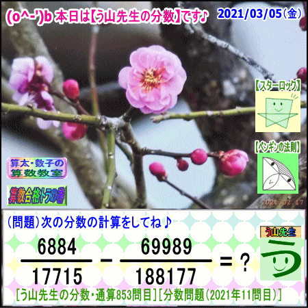 [う山雄一先生の分数]【分数853問目】算数・数学天才問題[2021年3月5日]Fraction □──────────────────□ 【算太・数子の算数教室】(R) 【算数合格トラの巻】 【う山TV(スタディ)】 【う山TV(バラエティ)】 【カンブリア・アカデミー】 □──────────────────□ (o^-')b 大人気☆[う山先生式・分数計算]の問題です♪ □──────────────────□ □ 2021/03/05(金曜) □ (o^-')b 【う山先生の分数・通算853問目】 [分数問題(2021年11問目)] 本日は2021年3月5日です。 次の分数計算をしてね♪ 6884/17715 - 69989/188177 = ? 【答え】後程♪ □ □──────────────────□ (*^ー^)ノ 本日も面白い分数問題を作りました☆ 分子・分母ともどうなるかな♪ 本日、3月5日に相応しい答えの分数問題です☆ □ [Fraction of Professor Uyama] доля Frakcja Fracao □──────────────────□ 算数・数学・家庭教師・個別指導・質問教室 □──────────────────□ □ □□□□□□□□□□□□□□□□□□□□ [発行者氏名]【う山雄一】 [発行者web]【算数合格トラの巻】 [発行者web]【算太・数子の算数教室】(R) [著作]【算太・数子の算数教室】(R) 「さんた・かずこのさんすうきょうしつ」 [著作]【算遊記】 □ [メインサイト]う山先生のHP https://uyama.theblog.me/ □ [中学受験・算数]メイン http://uyama.aikotoba.jp/ [中学受験・算数]サブ https://sansu.theblog.me/ http://santakazuko.wix.com/uyama □ [成績表・偏差値アップ] http://uyama.aikotoba.jp/seiseki/seiseki.html □ [算遊記(さんゆうき)]算蔵法師・算悟空 http://www.geocities.jp/san_yu_ki/(←工事中) □ [仕事用フェイスブック] https://www.facebook.com/kazuko.santa.5/ □ [全般メール] ??????@gmail.com □ [中学受験・仕事用メール] ??????@gmail.com □ [ブログ]【算数合格トラの巻】 http://ameblo.jp/sansu/ http://uyama.blog.jp/ https://blog.goo.ne.jp/sansu_gokaku □ [ブログ]【算太・数子の算数教室】(R) http://ameblo.jp/santa-kazuko/ http://blog.goo.ne.jp/santa_kazuko http://santakazuko.wordpress.com/ http://santa-kazuko.at.webry.info/ http://santa-kazuko.blogspot.jp/ http://ch.nicovideo.jp/santa-kazuko http://santa-kazuko.blog.jp/ □ [ブログ]【う山先生】 http://happy.ap.teacup.com/uyama/ http://sansugokaku.blog.fc2.com/ https://uyama-sensei.hatenablog.com/ □ [ブログ]【オルドビスキー博士】 http://ameblo.jp/ordovisky/ □ [ブログ]【う山TV】 https://ameblo.jp/uyama-tv/ □ [動画一覧]【う山TV】(スタディ/バラエティ) http://uyama.aikotoba.jp/3-uyama-tv.html □ [動画一覧]【う山TV】 https://uyama-tv.themedia.jp/ □ [作曲一覧]【う山TV】(作曲) https://uyama-tv.amebaownd.com/ □ [分数、楽しい!]シリーズ [分数で算数・数学の天才になろう♪]シリーズ [知的ゲーム]シリーズ [一瞬で解こう!]シリーズ [解けたら天才♪]シリーズ [家庭教師]シリーズ [算数・面白い問題]シリーズ [算数・数学ファイル/SSファイル]シリーズ 【音楽・作曲】シリーズ 【空耳】シリーズ 【恋愛探偵サララ】シリーズ 【ランキング】シリーズ □ □ 【毎日の問題ブログ】一覧(お好きなブログを登録してね♪) http://uyama.aikotoba.jp/2-blog.html □ □□□□□□□□□□□□□□□□□□□□ ☆ ☆ ☆ ☆ ☆ ☆ ☆ ☆ ☆ ☆ ☆