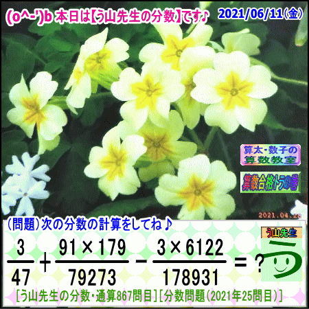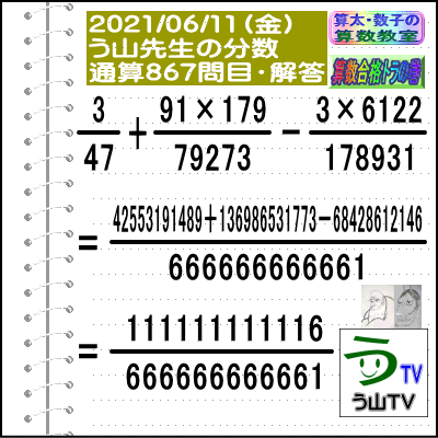 [う山雄一先生の分数]【分数867問目】算数・数学天才問題[2021年6月11日]Fraction □──────────────────□ 【算太・数子の算数教室】(R) 【算数合格トラの巻】 【う山TV(スタディ)】 【う山TV(バラエティ)】 【カンブリア・アカデミー】 □──────────────────□ (o^-')b 大人気☆[う山先生式・分数計算]の問題です♪ □──────────────────□ □ 2021/06/11(金曜) □ (o^-')b 【う山先生の分数・通算867問目】 [分数問題(2021年25問目)] 本日は2021年06月11日です。 次の分数計算をしてね♪ 3/47 +(91×179)/79273 -(3×6122)/178931 = ? 【答え】後程♪ □ □──────────────────□ (*^ー^)ノ 本日も面白い分数問題を作りました☆ 分子・分母ともどうなるかな♪ 本日、6月11日に相応しい分数問題です☆ □ [Fraction of Professor Uyama] доля Frakcja Fracao □──────────────────□ 算数・数学・家庭教師・個別指導・質問教室 □──────────────────□ □ □□□□□□□□□□□□□□□□□□□□ [発行者氏名]【う山雄一】 [発行者web]【算数合格トラの巻】 [発行者web]【算太・数子の算数教室】(R) [著作]【算太・数子の算数教室】(R) 「さんた・かずこのさんすうきょうしつ」 [著作]【算遊記】 □ [メインサイト]う山先生のHP https://uyama.theblog.me/ □ [中学受験・算数]メイン http://uyama.aikotoba.jp/ [中学受験・算数]サブ https://sansu.theblog.me/ http://santakazuko.wix.com/uyama □ [成績表・偏差値アップ] http://uyama.aikotoba.jp/seiseki/seiseki.html □ [算遊記(さんゆうき)]算蔵法師・算悟空 http://www.geocities.jp/san_yu_ki/(←工事中) □ [仕事用フェイスブック] https://www.facebook.com/kazuko.santa.5/ □ [全般メール] ??????@gmail.com □ [中学受験・仕事用メール] ??????@gmail.com □ [ブログ]【算数合格トラの巻】 http://ameblo.jp/sansu/ http://uyama.blog.jp/ https://blog.goo.ne.jp/sansu_gokaku □ [ブログ]【算太・数子の算数教室】(R) http://ameblo.jp/santa-kazuko/ http://blog.goo.ne.jp/santa_kazuko http://santakazuko.wordpress.com/ http://santa-kazuko.at.webry.info/ http://santa-kazuko.blogspot.jp/ http://ch.nicovideo.jp/santa-kazuko http://santa-kazuko.blog.jp/ □ [ブログ]【う山先生】 http://happy.ap.teacup.com/uyama/ http://sansugokaku.blog.fc2.com/ https://uyama-sensei.hatenablog.com/ □ [ブログ]【オルドビスキー博士】 http://ameblo.jp/ordovisky/ □ [ブログ]【う山TV】 https://ameblo.jp/uyama-tv/ □ [動画一覧]【う山TV】(スタディ/バラエティ) http://uyama.aikotoba.jp/3-uyama-tv.html □ [動画一覧]【う山TV】 https://uyama-tv.themedia.jp/ □ [作曲一覧]【う山TV】(作曲) https://uyama-tv.amebaownd.com/ □ [分数、楽しい!]シリーズ [分数で算数・数学の天才になろう♪]シリーズ [知的ゲーム]シリーズ [一瞬で解こう!]シリーズ [解けたら天才♪]シリーズ [家庭教師]シリーズ [算数・面白い問題]シリーズ [算数・数学ファイル/SSファイル]シリーズ 【音楽・作曲】シリーズ 【空耳】シリーズ 【恋愛探偵サララ】シリーズ 【ランキング】シリーズ □ □ 【毎日の問題ブログ】一覧(お好きなブログを登録してね♪) http://uyama.aikotoba.jp/2-blog.html □ □□□□□□□□□□□□□□□□□□□□ ☆ ☆ ☆ ☆ ☆ ☆ ☆ ☆ ☆ ☆ ☆