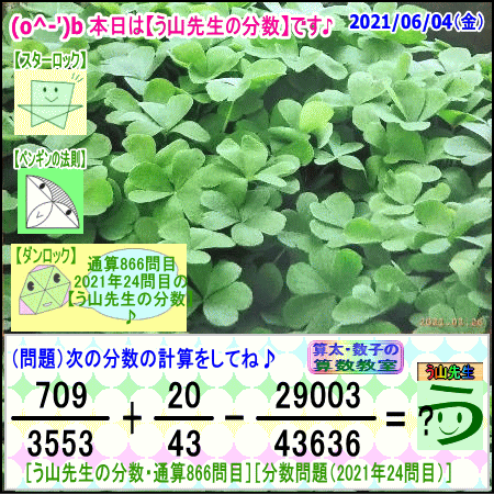 [う山雄一先生の分数]【分数866問目】算数・数学天才問題[2021年6月4日]Fraction □──────────────────□ 【算太・数子の算数教室】(R) 【算数合格トラの巻】 【う山TV(スタディ)】 【う山TV(バラエティ)】 【カンブリア・アカデミー】 □──────────────────□ (o^-')b 大人気☆[う山先生式・分数計算]の問題です♪ □──────────────────□ □ 2021/06/04(金曜) □ (o^-')b 【う山先生の分数・通算866問目】 [分数問題(2021年24問目)] 本日は2021年06月04日です。 次の分数計算をしてね♪ 709/3553 + 20/43 - 29003/43636 = ? 【答え】後程♪ □ □──────────────────□ (*^ー^)ノ 本日も面白い分数問題を作りました☆ 分子・分母ともどうなるかな♪ 本日、6月4日に相応しい分数問題です☆ □ [Fraction of Professor Uyama] доля Frakcja Fracao □──────────────────□ 算数・数学・家庭教師・個別指導・質問教室 □──────────────────□ □ □□□□□□□□□□□□□□□□□□□□ [発行者氏名]【う山雄一】 [発行者web]【算数合格トラの巻】 [発行者web]【算太・数子の算数教室】(R) [著作]【算太・数子の算数教室】(R) 「さんた・かずこのさんすうきょうしつ」 [著作]【算遊記】 □ [メインサイト]う山先生のHP https://uyama.theblog.me/ □ [中学受験・算数]メイン http://uyama.aikotoba.jp/ [中学受験・算数]サブ https://sansu.theblog.me/ http://santakazuko.wix.com/uyama □ [成績表・偏差値アップ] http://uyama.aikotoba.jp/seiseki/seiseki.html □ [算遊記(さんゆうき)]算蔵法師・算悟空 http://www.geocities.jp/san_yu_ki/(←工事中) □ [仕事用フェイスブック] https://www.facebook.com/kazuko.santa.5/ □ [全般メール] ??????@gmail.com □ [中学受験・仕事用メール] ??????@gmail.com □ [ブログ]【算数合格トラの巻】 http://ameblo.jp/sansu/ http://uyama.blog.jp/ https://blog.goo.ne.jp/sansu_gokaku □ [ブログ]【算太・数子の算数教室】(R) http://ameblo.jp/santa-kazuko/ http://blog.goo.ne.jp/santa_kazuko http://santakazuko.wordpress.com/ http://santa-kazuko.at.webry.info/ http://santa-kazuko.blogspot.jp/ http://ch.nicovideo.jp/santa-kazuko http://santa-kazuko.blog.jp/ □ [ブログ]【う山先生】 http://happy.ap.teacup.com/uyama/ http://sansugokaku.blog.fc2.com/ https://uyama-sensei.hatenablog.com/ □ [ブログ]【オルドビスキー博士】 http://ameblo.jp/ordovisky/ □ [ブログ]【う山TV】 https://ameblo.jp/uyama-tv/ □ [動画一覧]【う山TV】(スタディ/バラエティ) http://uyama.aikotoba.jp/3-uyama-tv.html □ [動画一覧]【う山TV】 https://uyama-tv.themedia.jp/ □ [作曲一覧]【う山TV】(作曲) https://uyama-tv.amebaownd.com/ □ [分数、楽しい!]シリーズ [分数で算数・数学の天才になろう♪]シリーズ [知的ゲーム]シリーズ [一瞬で解こう!]シリーズ [解けたら天才♪]シリーズ [家庭教師]シリーズ [算数・面白い問題]シリーズ [算数・数学ファイル/SSファイル]シリーズ 【音楽・作曲】シリーズ 【空耳】シリーズ 【恋愛探偵サララ】シリーズ 【ランキング】シリーズ □ □ 【毎日の問題ブログ】一覧(お好きなブログを登録してね♪) http://uyama.aikotoba.jp/2-blog.html □ □□□□□□□□□□□□□□□□□□□□ ☆ ☆ ☆ ☆ ☆ ☆ ☆ ☆ ☆ ☆ ☆