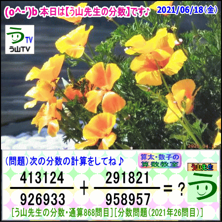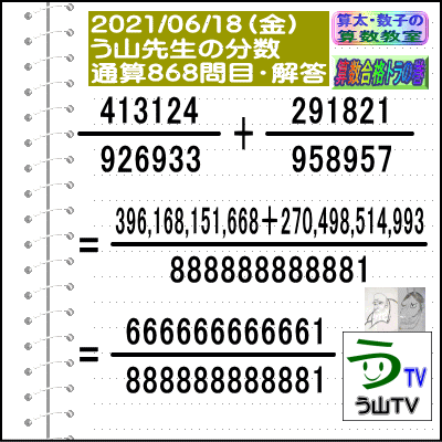 [う山雄一先生の分数]【分数868問目】算数・数学天才問題[2021年6月18日]Fraction □──────────────────□ 【算太・数子の算数教室】(R) 【算数合格トラの巻】 【う山TV(スタディ)】 【う山TV(バラエティ)】 【カンブリア・アカデミー】 □──────────────────□ (o^-')b 大人気☆[う山先生式・分数計算]の問題です♪ □──────────────────□ □ 2021/06/18(金曜) □ (o^-')b 【う山先生の分数・通算868問目】 [分数問題(2021年26問目)] 本日は2021年06月18日です。 次の分数計算をしてね♪ 413124/926933 + 291821/958957 = ? 【答え】後程♪ □ □──────────────────□ (*^ー^)ノ 本日も面白い分数問題を作りました☆ 分子・分母ともどうなるかな♪ 本日、6月18日に相応しい分数問題です☆ □ [Fraction of Professor Uyama] доля Frakcja Fracao □──────────────────□ 算数・数学・家庭教師・個別指導・質問教室 □──────────────────□ □ □□□□□□□□□□□□□□□□□□□□ [発行者氏名]【う山雄一】 [発行者web]【算数合格トラの巻】 [発行者web]【算太・数子の算数教室】(R) [著作]【算太・数子の算数教室】(R) 「さんた・かずこのさんすうきょうしつ」 [著作]【算遊記】 □ [メインサイト]う山先生のHP https://uyama.theblog.me/ □ [中学受験・算数]メイン http://uyama.aikotoba.jp/ [中学受験・算数]サブ https://sansu.theblog.me/ http://santakazuko.wix.com/uyama □ [成績表・偏差値アップ] http://uyama.aikotoba.jp/seiseki/seiseki.html □ [算遊記(さんゆうき)]算蔵法師・算悟空 http://www.geocities.jp/san_yu_ki/(←工事中) □ [仕事用フェイスブック] https://www.facebook.com/kazuko.santa.5/ □ [全般メール] ??????@gmail.com □ [中学受験・仕事用メール] ??????@gmail.com □ [ブログ]【算数合格トラの巻】 http://ameblo.jp/sansu/ http://uyama.blog.jp/ https://blog.goo.ne.jp/sansu_gokaku □ [ブログ]【算太・数子の算数教室】(R) http://ameblo.jp/santa-kazuko/ http://blog.goo.ne.jp/santa_kazuko http://santakazuko.wordpress.com/ http://santa-kazuko.at.webry.info/ http://santa-kazuko.blogspot.jp/ http://ch.nicovideo.jp/santa-kazuko http://santa-kazuko.blog.jp/ □ [ブログ]【う山先生】 http://happy.ap.teacup.com/uyama/ http://sansugokaku.blog.fc2.com/ https://uyama-sensei.hatenablog.com/ □ [ブログ]【オルドビスキー博士】 http://ameblo.jp/ordovisky/ □ [ブログ]【う山TV】 https://ameblo.jp/uyama-tv/ □ [動画一覧]【う山TV】(スタディ/バラエティ) http://uyama.aikotoba.jp/3-uyama-tv.html □ [動画一覧]【う山TV】 https://uyama-tv.themedia.jp/ □ [作曲一覧]【う山TV】(作曲) https://uyama-tv.amebaownd.com/ □ [分数、楽しい!]シリーズ [分数で算数・数学の天才になろう♪]シリーズ [知的ゲーム]シリーズ [一瞬で解こう!]シリーズ [解けたら天才♪]シリーズ [家庭教師]シリーズ [算数・面白い問題]シリーズ [算数・数学ファイル/SSファイル]シリーズ 【音楽・作曲】シリーズ 【空耳】シリーズ 【恋愛探偵サララ】シリーズ 【ランキング】シリーズ □ □ 【毎日の問題ブログ】一覧(お好きなブログを登録してね♪) http://uyama.aikotoba.jp/2-blog.html □ □□□□□□□□□□□□□□□□□□□□ ☆ ☆ ☆ ☆ ☆ ☆ ☆ ☆ ☆ ☆ ☆