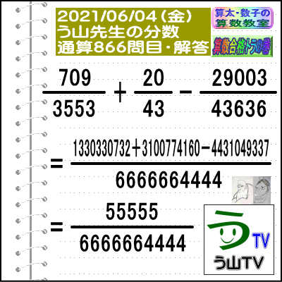 [う山先生・分数]【算数・数学】866問目【う山先生からの挑戦状】[2021年6月4日] □──────────────────□ (o^-')b【算数合格トラの巻】 【算太・数子の算数教室】(R) 【う山TV】 【カンブリア・アカデミー】 [Fraction of Professor Uyama] □──────────────────□ □ 2021/06/04(金曜) □ (o^-')b 【う山先生の分数・通算866問目】 [分数問題(2021年24問目)] 本日は2021年06月04日です。 次の分数計算をしてね♪ 709/3553 + 20/43 - 29003/43636 = ? □ □──────────────────□ □ (*^ー^)ノ 今回も、4年生・5年生でも、 頑張れば、楽しく解ける分数問題です☆ [う山先生の分数]は、 昨年2020年迄で、 合計【842問】作りました☆ 今年も、わかりやすく通し番号(通算番号)と、 その年の作成番号でいきます♪ □ 本日も人気の【う山雄一先生の分数問題】です! 楽しく解いてみて下さい♪(^^) □ [YouTube]の【う山TV】の分数動画も参照してね☆ □ 本日も、面白い分数問題を作成しました! 分母・分子はどうなるかな? 頑張って、5分以内で正解して下さい。 『算数は面白い!』を実感してね♪(^0^)/ □ [計算問題]を楽しんで解いて、 【算数は面白い!で算数合格】しましょう☆(o^-')b □ う山先生の予想正答率は、 堂々と正解 → 6%以下 頑張って正解 → 4%以下 頑張ったけど惜しくも不正解 → 5%以下 約分可能かどうか悩んで不正解 → 10%以下 です。 □ ではレッツ・ゴー!! ☆(^o^)/ □ 答えは、 ↓ ↓ ↓ ↓ ↓ ↓ ↓ ↓ ↓ □ ==================== □ ♪( ´θ`)ノ 【う山先生の分数・通算866問目】解答 [分数問題(2021年24問目)] □ 【答え】[55555/6666664444]です。 (分子=55555→5桁) (分母=6666664444→10桁) □ (解法) 709/3553 + 20/43 - 29003/43636 =1,330,330,732/6666664444 +3,100,774,160/6666664444 -4,431,049,337/6666664444 =55555/6666664444 □ □ ==================== □ ♪( ´θ`)ノ 本日も面白い数字の分数を作成しました♪ 本日、6月4日に相応しい分数問題です☆ □ 分子は[55555=5が5個→5桁] 分母は[6666664444=6が6個+4が4個→10桁] です☆ □ □===========□ □ 【参考】 * 2016年01月15日(金) [う山先生の分数・通算324問目] 30613/55556 - 66122/119999 =55555/6666664444 * 2017/06/02(金) [う山先生の分数・通算511問目] (233×2399)/611116 - 9978/10909 =55555/6666664444 * 2019/06/04(火) 【う山先生の分数・通算730問目】解答 [分数問題(2019年45問目)] 9/44 - 5527/27778 - 668/119999 =55555/6666664444 □ □===========□ □ ♪( ´ ▽ ` )ノ もちろん、答えは既約分数です☆ □ □ ==================== □ (*^ー^)ノ[参考] □ (3553=11×17×19) (43=素数) (43636=2×2×10909) (709=素数) (20=2×2×5) (29003=13×23×97) (55555[5桁]=5×41×271) (6666664444[10桁]=2×2×11×17×19×43×10909=3553×43×43636) □ □ □──────────────────□ □ □□□□□□□□□□□ [参考] 【う山先生の分数】通算866問目 [2013年]40問 [2014年]135問 [2015年]143問 [2016年]131問 [2017年]128問 [2018年]108問 [2019年]105問 [2020年]52問 □ [2021年] 2021/01/01(金)[1/2021] 2021/01/01(金)[1/2021] 2021/01/08(金)[1/2021] 2021/01/15(金)[1/2021] 2021/01/22(金)[1/2021] 2021/01/29(金)[2020/2021] 2021/02/05(金)[55555555555/222255552222] 2021/02/12(金)[111111211111/222222122222] 2021/02/19(金)[111111211111/222222122222] 2021/02/26(金)[155555/22666666] □ 2021/03/05(金)[55555333/3333555555] 2021/03/12(金)[31231231/312312312] 2021/03/19(金)[222222222223/333333333332] 2021/03/26(金)[5/3333344444] 2021/04/02(金)[555555555/3333344444] 2021/04/09(金)[4444499999/444444999999] 2021/04/16(金)[55555/4444446666] 2021/04/23(金)[44444/2222223333] 2021/04/30(金)[5555555/4444446666] 2021/05/07(金)[555555577777/555557777777] □ 2021/05/14(金)[111141111/11111411111] 2021/05/21(金)[22222522222/55555255555] 2021/05/28(金)[55555/2288888888] 2021/06/04(金)[55555/6666664444]←本日(o^-')b □ □ □□□□□□□□□□□ □ □──────────────────□ 算数・数学・家庭教師・個別指導・質問教室 □──────────────────□ □ □□□□□□□□□□□□□□□□□□□□ [氏名]【う山雄一】 [動画]【う山TV(スタディ)】 [動画]【う山TV(バラエティ)】 [著書]【算太・数子の算数教室】(R) □ [メインサイト]【う山先生のHP】 https://uyama.theblog.me/ □ [中学受験・算数]メイン http://uyama.aikotoba.jp/ □ [中学生] https://uyama-sensei.theblog.me/ □ [高校生] https://uyama-sensei.amebaownd.com/ □ [成績表・偏差値アップ] http://uyama.aikotoba.jp/seiseki/seiseki.html □ [ブログ一覧]【ブログ魂】 http://uyama.aikotoba.jp/2-blog.html □ [動画一覧]【う山TV】(アメーバ) https://uyama-tv.themedia.jp/ □ [作曲一覧]【う山TV】(作曲) https://uyama-tv.amebaownd.com/ □ □ [YouTube・チャンネル]【う山TV】(スタディ) https://www.youtube.com/channel/UCnMIEU_iFTH2iP5uAH1qevQ □ □ [YouTube・チャンネル]【う山TV】(バラエティ) https://www.youtube.com/channel/UC32D4Nf7sEpxD_VvoaHsJaA □ □ 【う山先生の分数】一覧 https://uyama.themedia.jp/ □ □□□□□□□□□□□□□□□□□□□□ ☆ ☆ ☆ ☆ ☆ ☆ ☆ ☆ ☆ ☆ ☆