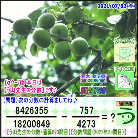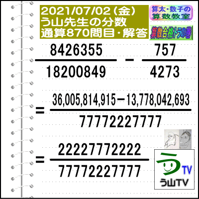 [う山雄一先生の分数]【分数870問目】算数・数学天才問題[2021年7月2日]Fraction □──────────────────□ 【算太・数子の算数教室】(R) 【算数合格トラの巻】 【う山TV(スタディ)】 【う山TV(バラエティ)】 【カンブリア・アカデミー】 □──────────────────□ (o^-')b 大人気☆[う山先生式・分数計算]の問題です♪ □──────────────────□ □ 2021/07/02(金曜) □ (o^-')b 【う山先生の分数・通算870問目】 [分数問題(2021年28問目)] 本日は2021年07月02日です。 次の分数計算をしてね♪ 8426355/18200849 - 757/4273 = ? 【答え】後程♪ □ □──────────────────□ (*^ー^)ノ 本日も面白い分数問題を作りました☆ 分子・分母ともどうなるかな♪ 本日、7月2日に相応しい分数問題です☆ □ [Fraction of Professor Uyama] доля Frakcja Fracao □──────────────────□ 算数・数学・家庭教師・個別指導・質問教室 □──────────────────□ □ □□□□□□□□□□□□□□□□□□□□ [発行者氏名]【う山雄一】 [発行者web]【算数合格トラの巻】 [発行者web]【算太・数子の算数教室】(R) [著作]【算太・数子の算数教室】(R) 「さんた・かずこのさんすうきょうしつ」 [著作]【算遊記】 □ [メインサイト]う山先生のHP https://uyama.theblog.me/ □ [中学受験・算数]メイン http://uyama.aikotoba.jp/ [中学受験・算数]サブ https://sansu.theblog.me/ http://santakazuko.wix.com/uyama □ [成績表・偏差値アップ] http://uyama.aikotoba.jp/seiseki/seiseki.html □ [算遊記(さんゆうき)]算蔵法師・算悟空 http://www.geocities.jp/san_yu_ki/(←工事中) □ [仕事用フェイスブック] https://www.facebook.com/kazuko.santa.5/ □ [全般メール] ??????@gmail.com □ [中学受験・仕事用メール] ??????@gmail.com □ [ブログ]【算数合格トラの巻】 http://ameblo.jp/sansu/ http://uyama.blog.jp/ https://blog.goo.ne.jp/sansu_gokaku □ [ブログ]【算太・数子の算数教室】(R) http://ameblo.jp/santa-kazuko/ http://blog.goo.ne.jp/santa_kazuko http://santakazuko.wordpress.com/ http://santa-kazuko.at.webry.info/ http://santa-kazuko.blogspot.jp/ http://ch.nicovideo.jp/santa-kazuko http://santa-kazuko.blog.jp/ □ [ブログ]【う山先生】 http://happy.ap.teacup.com/uyama/ http://sansugokaku.blog.fc2.com/ https://uyama-sensei.hatenablog.com/ □ [ブログ]【オルドビスキー博士】 http://ameblo.jp/ordovisky/ □ [ブログ]【う山TV】 https://ameblo.jp/uyama-tv/ □ [動画一覧]【う山TV】(スタディ/バラエティ) http://uyama.aikotoba.jp/3-uyama-tv.html □ [動画一覧]【う山TV】 https://uyama-tv.themedia.jp/ □ [作曲一覧]【う山TV】(作曲) https://uyama-tv.amebaownd.com/ □ [分数、楽しい!]シリーズ [分数で算数・数学の天才になろう♪]シリーズ [知的ゲーム]シリーズ [一瞬で解こう!]シリーズ [解けたら天才♪]シリーズ [家庭教師]シリーズ [算数・面白い問題]シリーズ [算数・数学ファイル/SSファイル]シリーズ 【音楽・作曲】シリーズ 【空耳】シリーズ 【恋愛探偵サララ】シリーズ 【ランキング】シリーズ □ □ 【毎日の問題ブログ】一覧(お好きなブログを登録してね♪) http://uyama.aikotoba.jp/2-blog.html □ □□□□□□□□□□□□□□□□□□□□ ☆ ☆ ☆ ☆ ☆ ☆ ☆ ☆ ☆ ☆ ☆