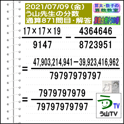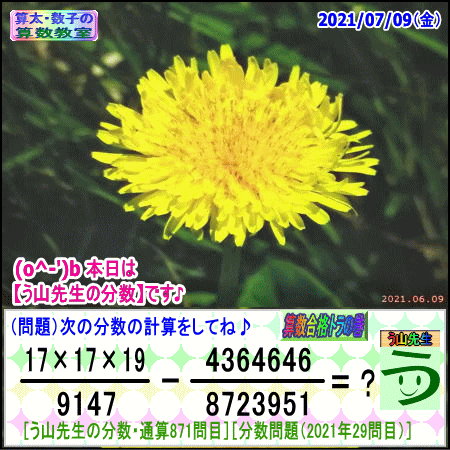 [う山雄一先生の分数]【分数871問目】算数・数学天才問題[2021年7月9日]Fraction □──────────────────□ 【算太・数子の算数教室】(R) 【算数合格トラの巻】 【う山TV(スタディ)】 【う山TV(バラエティ)】 【カンブリア・アカデミー】 □──────────────────□ (o^-')b 大人気☆[う山先生式・分数計算]の問題です♪ □──────────────────□ □ 2021/07/09(金曜) □ (o^-')b 【う山先生の分数・通算871問目】 [分数問題(2021年29問目)] 本日は2021年07月09日です。 次の分数計算をしてね♪ (17×17×19)/9147 - 4364646/8723951 = ? 【答え】後程♪ □ □──────────────────□ (*^ー^)ノ 本日も面白い分数問題を作りました☆ 分子・分母ともどうなるかな♪ 本日、7月9日に相応しい分数問題です☆ □ [Fraction of Professor Uyama] доля Frakcja Fracao □──────────────────□ 算数・数学・家庭教師・個別指導・質問教室 □──────────────────□ □ □□□□□□□□□□□□□□□□□□□□ [発行者氏名]【う山雄一】 [発行者web]【算数合格トラの巻】 [発行者web]【算太・数子の算数教室】(R) [著作]【算太・数子の算数教室】(R) 「さんた・かずこのさんすうきょうしつ」 [著作]【算遊記】 □ [メインサイト]う山先生のHP https://uyama.theblog.me/ □ [中学受験・算数]メイン http://uyama.aikotoba.jp/ [中学受験・算数]サブ https://sansu.theblog.me/ http://santakazuko.wix.com/uyama □ [成績表・偏差値アップ] http://uyama.aikotoba.jp/seiseki/seiseki.html □ [算遊記(さんゆうき)]算蔵法師・算悟空 http://www.geocities.jp/san_yu_ki/(←工事中) □ [仕事用フェイスブック] https://www.facebook.com/kazuko.santa.5/ □ [全般メール] ??????@gmail.com □ [中学受験・仕事用メール] ??????@gmail.com □ [ブログ]【算数合格トラの巻】 http://ameblo.jp/sansu/ http://uyama.blog.jp/ https://blog.goo.ne.jp/sansu_gokaku □ [ブログ]【算太・数子の算数教室】(R) http://ameblo.jp/santa-kazuko/ http://blog.goo.ne.jp/santa_kazuko http://santakazuko.wordpress.com/ http://santa-kazuko.at.webry.info/ http://santa-kazuko.blogspot.jp/ http://ch.nicovideo.jp/santa-kazuko http://santa-kazuko.blog.jp/ □ [ブログ]【う山先生】 http://happy.ap.teacup.com/uyama/ http://sansugokaku.blog.fc2.com/ https://uyama-sensei.hatenablog.com/ □ [ブログ]【オルドビスキー博士】 http://ameblo.jp/ordovisky/ □ [ブログ]【う山TV】 https://ameblo.jp/uyama-tv/ □ [動画一覧]【う山TV】(スタディ/バラエティ) http://uyama.aikotoba.jp/3-uyama-tv.html □ [動画一覧]【う山TV】 https://uyama-tv.themedia.jp/ □ [作曲一覧]【う山TV】(作曲) https://uyama-tv.amebaownd.com/ □ [分数、楽しい!]シリーズ [分数で算数・数学の天才になろう♪]シリーズ [知的ゲーム]シリーズ [一瞬で解こう!]シリーズ [解けたら天才♪]シリーズ [家庭教師]シリーズ [算数・面白い問題]シリーズ [算数・数学ファイル/SSファイル]シリーズ 【音楽・作曲】シリーズ 【空耳】シリーズ 【恋愛探偵サララ】シリーズ 【ランキング】シリーズ □ □ 【毎日の問題ブログ】一覧(お好きなブログを登録してね♪) http://uyama.aikotoba.jp/2-blog.html □ □□□□□□□□□□□□□□□□□□□□ ☆ ☆ ☆ ☆ ☆ ☆ ☆ ☆ ☆ ☆ ☆