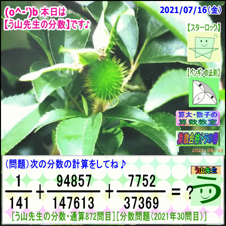 [う山雄一先生の分数]【分数872問目】算数・数学天才問題[2021年7月16日]Fraction □──────────────────□ 【算太・数子の算数教室】(R) 【算数合格トラの巻】 【う山TV(スタディ)】 【う山TV(バラエティ)】 【カンブリア・アカデミー】 □──────────────────□ (o^-')b 大人気☆[う山先生式・分数計算]の問題です♪ □──────────────────□ □ 2021/07/16(金曜) □ (o^-')b 【う山先生の分数・通算872問目】 [分数問題(2021年30問目)] 本日は2021年07月16日です。 次の分数計算をしてね♪ 1/141 + 94857/147613 + 7752/37369 = ? 【答え】後程♪ □ □──────────────────□ (*^ー^)ノ 本日も面白い分数問題を作りました☆ 分子・分母ともどうなるかな♪ 本日、7月16日に相応しい分数問題です☆ □ [Fraction of Professor Uyama] доля Frakcja Fracao □──────────────────□ 算数・数学・家庭教師・個別指導・質問教室 □──────────────────□ □ □□□□□□□□□□□□□□□□□□□□ [発行者氏名]【う山雄一】 [発行者web]【算数合格トラの巻】 [発行者web]【算太・数子の算数教室】(R) [著作]【算太・数子の算数教室】(R) 「さんた・かずこのさんすうきょうしつ」 [著作]【算遊記】 □ [メインサイト]う山先生のHP https://uyama.theblog.me/ □ [中学受験・算数]メイン http://uyama.aikotoba.jp/ [中学受験・算数]サブ https://sansu.theblog.me/ http://santakazuko.wix.com/uyama □ [成績表・偏差値アップ] http://uyama.aikotoba.jp/seiseki/seiseki.html □ [算遊記(さんゆうき)]算蔵法師・算悟空 http://www.geocities.jp/san_yu_ki/(←工事中) □ [仕事用フェイスブック] https://www.facebook.com/kazuko.santa.5/ □ [全般メール] ??????@gmail.com □ [中学受験・仕事用メール] ??????@gmail.com □ [ブログ]【算数合格トラの巻】 http://ameblo.jp/sansu/ http://uyama.blog.jp/ https://blog.goo.ne.jp/sansu_gokaku □ [ブログ]【算太・数子の算数教室】(R) http://ameblo.jp/santa-kazuko/ http://blog.goo.ne.jp/santa_kazuko http://santakazuko.wordpress.com/ http://santa-kazuko.at.webry.info/ http://santa-kazuko.blogspot.jp/ http://ch.nicovideo.jp/santa-kazuko http://santa-kazuko.blog.jp/ □ [ブログ]【う山先生】 http://happy.ap.teacup.com/uyama/ http://sansugokaku.blog.fc2.com/ https://uyama-sensei.hatenablog.com/ □ [ブログ]【オルドビスキー博士】 http://ameblo.jp/ordovisky/ □ [ブログ]【う山TV】 https://ameblo.jp/uyama-tv/ □ [動画一覧]【う山TV】(スタディ/バラエティ) http://uyama.aikotoba.jp/3-uyama-tv.html □ [動画一覧]【う山TV】 https://uyama-tv.themedia.jp/ □ [作曲一覧]【う山TV】(作曲) https://uyama-tv.amebaownd.com/ □ [分数、楽しい!]シリーズ [分数で算数・数学の天才になろう♪]シリーズ [知的ゲーム]シリーズ [一瞬で解こう!]シリーズ [解けたら天才♪]シリーズ [家庭教師]シリーズ [算数・面白い問題]シリーズ [算数・数学ファイル/SSファイル]シリーズ 【音楽・作曲】シリーズ 【空耳】シリーズ 【恋愛探偵サララ】シリーズ 【ランキング】シリーズ □ □ 【毎日の問題ブログ】一覧(お好きなブログを登録してね♪) http://uyama.aikotoba.jp/2-blog.html □ □□□□□□□□□□□□□□□□□□□□ ☆ ☆ ☆ ☆ ☆ ☆ ☆ ☆ ☆ ☆ ☆