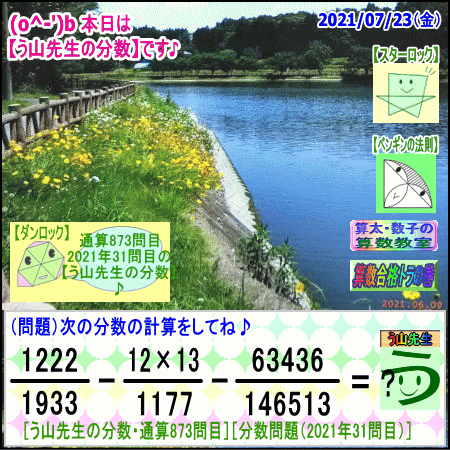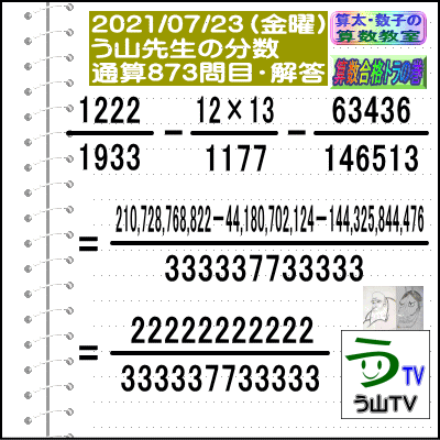 [う山雄一先生の分数]【分数873問目】算数・数学天才問題[2021年7月23日]Fraction □──────────────────□ 【算太・数子の算数教室】(R) 【算数合格トラの巻】 【う山TV(スタディ)】 【う山TV(バラエティ)】 【カンブリア・アカデミー】 □──────────────────□ (o^-')b 大人気☆[う山先生式・分数計算]の問題です♪ □──────────────────□ □ 2021/07/23(金曜) □ (o^-')b 【う山先生の分数・通算873問目】 [分数問題(2021年31問目)] 本日は2021年07月23日です。 次の分数計算をしてね♪ 1222/1933 -(12×13)/1177 - 63436/146513 = ? 【答え】後程♪ □ □──────────────────□ (*^ー^)ノ 本日も面白い分数問題を作りました☆ 分子・分母ともどうなるかな♪ 本日、7月23日に相応しい分数問題です☆ □ [Fraction of Professor Uyama] доля Frakcja Fracao □──────────────────□ 算数・数学・家庭教師・個別指導・質問教室 □──────────────────□ □ □□□□□□□□□□□□□□□□□□□□ [発行者氏名]【う山雄一】 [発行者web]【算数合格トラの巻】 [発行者web]【算太・数子の算数教室】(R) [著作]【算太・数子の算数教室】(R) 「さんた・かずこのさんすうきょうしつ」 [著作]【算遊記】 □ [メインサイト]う山先生のHP https://uyama.theblog.me/ □ [中学受験・算数]メイン http://uyama.aikotoba.jp/ [中学受験・算数]サブ https://sansu.theblog.me/ http://santakazuko.wix.com/uyama □ [成績表・偏差値アップ] http://uyama.aikotoba.jp/seiseki/seiseki.html □ [算遊記(さんゆうき)]算蔵法師・算悟空 http://www.geocities.jp/san_yu_ki/(←工事中) □ [仕事用フェイスブック] https://www.facebook.com/kazuko.santa.5/ □ [全般メール] ??????@gmail.com □ [中学受験・仕事用メール] ??????@gmail.com □ [ブログ]【算数合格トラの巻】 http://ameblo.jp/sansu/ http://uyama.blog.jp/ https://blog.goo.ne.jp/sansu_gokaku □ [ブログ]【算太・数子の算数教室】(R) http://ameblo.jp/santa-kazuko/ http://blog.goo.ne.jp/santa_kazuko http://santakazuko.wordpress.com/ http://santa-kazuko.at.webry.info/ http://santa-kazuko.blogspot.jp/ http://ch.nicovideo.jp/santa-kazuko http://santa-kazuko.blog.jp/ □ [ブログ]【う山先生】 http://happy.ap.teacup.com/uyama/ http://sansugokaku.blog.fc2.com/ https://uyama-sensei.hatenablog.com/ □ [ブログ]【オルドビスキー博士】 http://ameblo.jp/ordovisky/ □ [ブログ]【う山TV】 https://ameblo.jp/uyama-tv/ □ [動画一覧]【う山TV】(スタディ/バラエティ) http://uyama.aikotoba.jp/3-uyama-tv.html □ [動画一覧]【う山TV】 https://uyama-tv.themedia.jp/ □ [作曲一覧]【う山TV】(作曲) https://uyama-tv.amebaownd.com/ □ [分数、楽しい!]シリーズ [分数で算数・数学の天才になろう♪]シリーズ [知的ゲーム]シリーズ [一瞬で解こう!]シリーズ [解けたら天才♪]シリーズ [家庭教師]シリーズ [算数・面白い問題]シリーズ [算数・数学ファイル/SSファイル]シリーズ 【音楽・作曲】シリーズ 【空耳】シリーズ 【恋愛探偵サララ】シリーズ 【ランキング】シリーズ □ □ 【毎日の問題ブログ】一覧(お好きなブログを登録してね♪) http://uyama.aikotoba.jp/2-blog.html □ □□□□□□□□□□□□□□□□□□□□ ☆ ☆ ☆ ☆ ☆ ☆ ☆ ☆ ☆ ☆ ☆