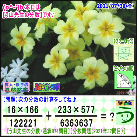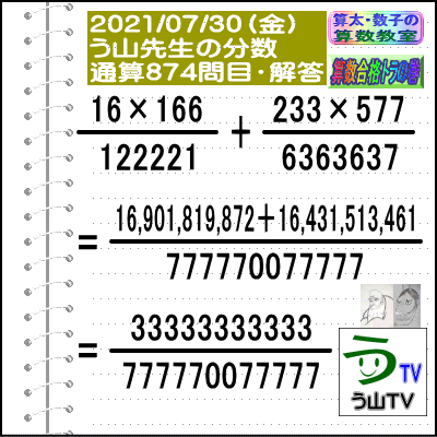 [う山雄一先生の分数]【分数874問目】算数・数学天才問題[2021年7月30日]Fraction □──────────────────□ 【算太・数子の算数教室】(R) 【算数合格トラの巻】 【う山TV(スタディ)】 【う山TV(バラエティ)】 【カンブリア・アカデミー】 □──────────────────□ (o^-')b 大人気☆[う山先生式・分数計算]の問題です♪ □──────────────────□ □ 2021/07/30(金曜) □ (o^-')b 【う山先生の分数・通算874問目】 [分数問題(2021年32問目)] 本日は2021年07月30日です。 次の分数計算をしてね♪ (16×166)/122221 +(233×577)/6363637 = ? 【答え】後程♪ □ □──────────────────□ (*^ー^)ノ 本日も面白い分数問題を作りました☆ 分子・分母ともどうなるかな♪ 本日、7月30日に相応しい分数問題です☆ □ [Fraction of Professor Uyama] доля Frakcja Fracao □──────────────────□ 算数・数学・家庭教師・個別指導・質問教室 □──────────────────□ □ □□□□□□□□□□□□□□□□□□□□ [発行者氏名]【う山雄一】 [発行者web]【算数合格トラの巻】 [発行者web]【算太・数子の算数教室】(R) [著作]【算太・数子の算数教室】(R) 「さんた・かずこのさんすうきょうしつ」 [著作]【算遊記】 □ [メインサイト]う山先生のHP https://uyama.theblog.me/ □ [中学受験・算数]メイン http://uyama.aikotoba.jp/ [中学受験・算数]サブ https://sansu.theblog.me/ http://santakazuko.wix.com/uyama □ [成績表・偏差値アップ] http://uyama.aikotoba.jp/seiseki/seiseki.html □ [算遊記(さんゆうき)]算蔵法師・算悟空 http://www.geocities.jp/san_yu_ki/(←工事中) □ [仕事用フェイスブック] https://www.facebook.com/kazuko.santa.5/ □ [全般メール] ??????@gmail.com □ [中学受験・仕事用メール] ??????@gmail.com □ [ブログ]【算数合格トラの巻】 http://ameblo.jp/sansu/ http://uyama.blog.jp/ https://blog.goo.ne.jp/sansu_gokaku □ [ブログ]【算太・数子の算数教室】(R) http://ameblo.jp/santa-kazuko/ http://blog.goo.ne.jp/santa_kazuko http://santakazuko.wordpress.com/ http://santa-kazuko.at.webry.info/ http://santa-kazuko.blogspot.jp/ http://ch.nicovideo.jp/santa-kazuko http://santa-kazuko.blog.jp/ □ [ブログ]【う山先生】 http://happy.ap.teacup.com/uyama/ http://sansugokaku.blog.fc2.com/ https://uyama-sensei.hatenablog.com/ □ [ブログ]【オルドビスキー博士】 http://ameblo.jp/ordovisky/ □ [ブログ]【う山TV】 https://ameblo.jp/uyama-tv/ □ [動画一覧]【う山TV】(スタディ/バラエティ) http://uyama.aikotoba.jp/3-uyama-tv.html □ [動画一覧]【う山TV】 https://uyama-tv.themedia.jp/ □ [作曲一覧]【う山TV】(作曲) https://uyama-tv.amebaownd.com/ □ [分数、楽しい!]シリーズ [分数で算数・数学の天才になろう♪]シリーズ [知的ゲーム]シリーズ [一瞬で解こう!]シリーズ [解けたら天才♪]シリーズ [家庭教師]シリーズ [算数・面白い問題]シリーズ [算数・数学ファイル/SSファイル]シリーズ 【音楽・作曲】シリーズ 【空耳】シリーズ 【恋愛探偵サララ】シリーズ 【ランキング】シリーズ □ □ 【毎日の問題ブログ】一覧(お好きなブログを登録してね♪) http://uyama.aikotoba.jp/2-blog.html □ □□□□□□□□□□□□□□□□□□□□ ☆ ☆ ☆ ☆ ☆ ☆ ☆ ☆ ☆ ☆ ☆