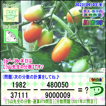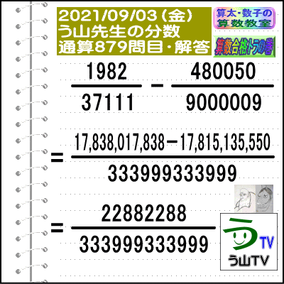 [う山雄一先生の分数]【分数879問目】算数・数学天才問題[2021年9月3日]Fraction □──────────────────□ 【算太・数子の算数教室】(R) 【算数合格トラの巻】 【う山TV(スタディ)】 【う山TV(バラエティ)】 【カンブリア・アカデミー】 □──────────────────□ (o^-')b 大人気☆[う山先生式・分数計算]の問題です♪ □──────────────────□ □ 2021/09/03(金曜) □ (o^-')b 【う山先生の分数・通算879問目】 [分数問題(2021年37問目)] 本日は2021年09月03日です。 次の分数計算をしてね♪ 1982/37111 - 480050/9000009 = ? 【答え】後程♪ □ □──────────────────□ (*^ー^)ノ 本日も面白い分数問題を作りました☆ 分子・分母ともどうなるかな♪ 本日、9月3日に相応しい分数問題です☆ □ [Fraction of Professor Uyama] доля Frakcja Fracao □──────────────────□ 算数・数学・家庭教師・個別指導・質問教室 □──────────────────□ □ □□□□□□□□□□□□□□□□□□□□ [発行者氏名]【う山雄一】 [発行者web]【算数合格トラの巻】 [発行者web]【算太・数子の算数教室】(R) [著作]【算太・数子の算数教室】(R) 「さんた・かずこのさんすうきょうしつ」 [著作]【算遊記】 □ [メインサイト]う山先生のHP https://uyama.theblog.me/ □ [中学受験・算数]メイン http://uyama.aikotoba.jp/ [中学受験・算数]サブ https://sansu.theblog.me/ http://santakazuko.wix.com/uyama □ [成績表・偏差値アップ] http://uyama.aikotoba.jp/seiseki/seiseki.html □ [算遊記(さんゆうき)]算蔵法師・算悟空 http://www.geocities.jp/san_yu_ki/(←工事中) □ [仕事用フェイスブック] https://www.facebook.com/kazuko.santa.5/ □ [全般メール] ??????@gmail.com □ [中学受験・仕事用メール] ??????@gmail.com □ [ブログ]【算数合格トラの巻】 http://ameblo.jp/sansu/ http://uyama.blog.jp/ https://blog.goo.ne.jp/sansu_gokaku □ [ブログ]【算太・数子の算数教室】(R) http://ameblo.jp/santa-kazuko/ http://blog.goo.ne.jp/santa_kazuko http://santakazuko.wordpress.com/ http://santa-kazuko.at.webry.info/ http://santa-kazuko.blogspot.jp/ http://ch.nicovideo.jp/santa-kazuko http://santa-kazuko.blog.jp/ □ [ブログ]【う山先生】 http://happy.ap.teacup.com/uyama/ http://sansugokaku.blog.fc2.com/ https://uyama-sensei.hatenablog.com/ □ [ブログ]【オルドビスキー博士】 http://ameblo.jp/ordovisky/ □ [ブログ]【う山TV】 https://ameblo.jp/uyama-tv/ □ [動画一覧]【う山TV】(スタディ/バラエティ) http://uyama.aikotoba.jp/3-uyama-tv.html □ [動画一覧]【う山TV】 https://uyama-tv.themedia.jp/ □ [作曲一覧]【う山TV】(作曲) https://uyama-tv.amebaownd.com/ □ [分数、楽しい!]シリーズ [分数で算数・数学の天才になろう♪]シリーズ [知的ゲーム]シリーズ [一瞬で解こう!]シリーズ [解けたら天才♪]シリーズ [家庭教師]シリーズ [算数・面白い問題]シリーズ [算数・数学ファイル/SSファイル]シリーズ 【音楽・作曲】シリーズ 【空耳】シリーズ 【恋愛探偵サララ】シリーズ 【ランキング】シリーズ □ □ 【毎日の問題ブログ】一覧(お好きなブログを登録してね♪) http://uyama.aikotoba.jp/2-blog.html □ □□□□□□□□□□□□□□□□□□□□ #分数 #う山先生の分数 #算数 #算数合格トラの巻 #数学 #解けたら天才 #家庭教師 #う山TV #う山先生 #う山雄一先生 #算太数子の算数教室 #算太数子 #算太くん #数子ちゃん #オルドビスキー博士 #シルルちゃん #デボン君 #白亜紀先生 #カンブリアアカデミー #勉強 #勉強垢 #計算問題 #数学垢 #数学教えて #数学教える #中学受験 #中学入試 #高校入試 #高校受験 #相互フォロー □ □□□□□□□□□□□□□□□□□□□□ ☆ ☆ ☆ ☆ ☆ ☆ ☆ ☆ ☆ ☆ ☆