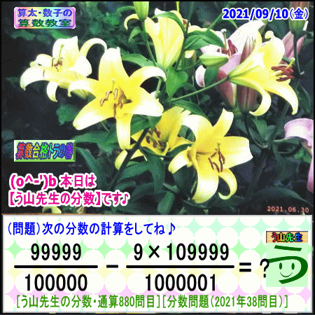 [う山雄一先生の分数]【分数880問目】算数・数学天才問題[2021年9月10日]Fraction □──────────────────□ 【算太・数子の算数教室】(R) 【算数合格トラの巻】 【う山TV(スタディ)】 【う山TV(バラエティ)】 【カンブリア・アカデミー】 □──────────────────□ (o^-')b 大人気☆[う山先生式・分数計算]の問題です♪ □──────────────────□ □ 2021/09/10(金曜) □ (o^-')b 【う山先生の分数・通算880問目】 [分数問題(2021年38問目)] 本日は2021年09月10日です。 次の分数計算をしてね♪ 99999/100000 -(9×109999)/1000001 = ? 【答え】後程♪ □ □──────────────────□ (*^ー^)ノ 本日も面白い分数問題を作りました☆ 分子・分母ともどうなるかな♪ 本日、9月10日に相応しい分数問題です☆ □ [Fraction of Professor Uyama] доля Frakcja Fracao □──────────────────□ 算数・数学・家庭教師・個別指導・質問教室 □──────────────────□ □□□□□□□□□□□□□□□□□□□□ #分数 #う山先生の分数 #算数 #算数合格トラの巻 #数学 #解けたら天才 #家庭教師 #う山TV #う山先生 #う山雄一先生 #算太数子の算数教室 #算太数子 #算太くん #数子ちゃん #オルドビスキー博士 #シルルちゃん #デボン君 #白亜紀先生 #カンブリアアカデミー #勉強 #勉強垢 #計算問題 #数学垢 #数学教えて #数学教える #中学受験 #中学入試 #高校入試 #高校受験 #相互フォロー □ □□□□□□□□□□□□□□□□□□□□ [発行者氏名]【う山雄一】 [発行者web]【算数合格トラの巻】 [発行者web]【算太・数子の算数教室】(R) [著作]【算太・数子の算数教室】(R) 「さんた・かずこのさんすうきょうしつ」 [著作]【算遊記】 □ [メインサイト]う山先生のHP https://uyama.theblog.me/ □ [中学受験・算数]メイン http://uyama.aikotoba.jp/ [中学受験・算数]サブ https://sansu.theblog.me/ http://santakazuko.wix.com/uyama □ [成績表・偏差値アップ] http://uyama.aikotoba.jp/seiseki/seiseki.html □ [算遊記(さんゆうき)]算蔵法師・算悟空 http://www.geocities.jp/san_yu_ki/(←工事中) □ [仕事用フェイスブック] https://www.facebook.com/kazuko.santa.5/ □ [全般メール] ??????@gmail.com □ [中学受験・仕事用メール] ??????@gmail.com □ [ブログ]【算数合格トラの巻】 http://ameblo.jp/sansu/ http://uyama.blog.jp/ https://blog.goo.ne.jp/sansu_gokaku □ [ブログ]【算太・数子の算数教室】(R) http://ameblo.jp/santa-kazuko/ http://blog.goo.ne.jp/santa_kazuko http://santakazuko.wordpress.com/ http://santa-kazuko.at.webry.info/ http://santa-kazuko.blogspot.jp/ http://ch.nicovideo.jp/santa-kazuko http://santa-kazuko.blog.jp/ □ [ブログ]【う山先生】 http://happy.ap.teacup.com/uyama/ http://sansugokaku.blog.fc2.com/ https://uyama-sensei.hatenablog.com/ □ [ブログ]【オルドビスキー博士】 http://ameblo.jp/ordovisky/ □ [ブログ]【う山TV】 https://ameblo.jp/uyama-tv/ □ [動画一覧]【う山TV】(スタディ/バラエティ) http://uyama.aikotoba.jp/3-uyama-tv.html □ [動画一覧]【う山TV】 https://uyama-tv.themedia.jp/ □ [作曲一覧]【う山TV】(作曲) https://uyama-tv.amebaownd.com/ □ [分数、楽しい!]シリーズ [分数で算数・数学の天才になろう♪]シリーズ [知的ゲーム]シリーズ [一瞬で解こう!]シリーズ [解けたら天才♪]シリーズ [家庭教師]シリーズ [算数・面白い問題]シリーズ [算数・数学ファイル/SSファイル]シリーズ 【音楽・作曲】シリーズ 【空耳】シリーズ 【恋愛探偵サララ】シリーズ 【ランキング】シリーズ □ □ 【毎日の問題ブログ】一覧(お好きなブログを登録してね♪) http://uyama.aikotoba.jp/2-blog.html □ □□□□□□□□□□□□□□□□□□□□ ☆ ☆ ☆ ☆ ☆ ☆ ☆ ☆ ☆ ☆ ☆