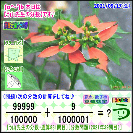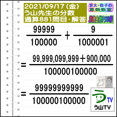 [う山雄一先生の分数]【分数881問目】算数・数学天才問題[2021年9月17日]Fraction □──────────────────□ 【算太・数子の算数教室】(R) 【算数合格トラの巻】 【う山TV(スタディ)】 【う山TV(バラエティ)】 【カンブリア・アカデミー】 □──────────────────□ (o^-')b 大人気☆[う山先生式・分数計算]の問題です♪ □──────────────────□ □ 2021/09/17(金曜) □ (o^-')b 【う山先生の分数・通算881問目】 [分数問題(2021年39問目)] 本日は2021年09月17日です。 次の分数計算をしてね♪ 99999/100000 + 9/1000001 = ? 【答え】後程♪ □ □──────────────────□ (*^ー^)ノ 本日も面白い分数問題を作りました☆ 分子・分母ともどうなるかな♪ 本日も、9月に相応しい分数問題です☆ 先週の9月10日の問題に似ていますが・・・?! □ [Fraction of Professor Uyama] доля Frakcja Fracao □──────────────────□ 算数・数学・家庭教師・個別指導・質問教室 □──────────────────□ □□□□□□□□□□□□□□□□□□□□ #分数 #う山先生の分数 #算数 #算数合格トラの巻 #数学 #解けたら天才 #家庭教師 #う山TV #う山先生 #う山雄一先生 #算太数子の算数教室 #算太数子 #算太くん #数子ちゃん #オルドビスキー博士 #シルルちゃん #デボン君 #白亜紀先生 #カンブリアアカデミー #勉強 #勉強垢 #計算問題 #数学垢 #数学教えて #数学教える #中学受験 #中学入試 #高校入試 #高校受験 #相互フォロー □ □□□□□□□□□□□□□□□□□□□□ [発行者氏名]【う山雄一】 [発行者web]【算数合格トラの巻】 [発行者web]【算太・数子の算数教室】(R) [著作]【算太・数子の算数教室】(R) 「さんた・かずこのさんすうきょうしつ」 [著作]【算遊記】 □ [メインサイト]う山先生のHP https://uyama.theblog.me/ □ [中学受験・算数]メイン http://uyama.aikotoba.jp/ [中学受験・算数]サブ https://sansu.theblog.me/ http://santakazuko.wix.com/uyama □ [成績表・偏差値アップ] http://uyama.aikotoba.jp/seiseki/seiseki.html □ [算遊記(さんゆうき)]算蔵法師・算悟空 http://www.geocities.jp/san_yu_ki/(←工事中) □ [仕事用フェイスブック] https://www.facebook.com/kazuko.santa.5/ □ [全般メール] ??????@gmail.com □ [中学受験・仕事用メール] ??????@gmail.com □ [ブログ]【算数合格トラの巻】 http://ameblo.jp/sansu/ http://uyama.blog.jp/ https://blog.goo.ne.jp/sansu_gokaku □ [ブログ]【算太・数子の算数教室】(R) http://ameblo.jp/santa-kazuko/ http://blog.goo.ne.jp/santa_kazuko http://santakazuko.wordpress.com/ http://santa-kazuko.at.webry.info/ http://santa-kazuko.blogspot.jp/ http://ch.nicovideo.jp/santa-kazuko http://santa-kazuko.blog.jp/ □ [ブログ]【う山先生】 http://happy.ap.teacup.com/uyama/ http://sansugokaku.blog.fc2.com/ https://uyama-sensei.hatenablog.com/ □ [ブログ]【オルドビスキー博士】 http://ameblo.jp/ordovisky/ □ [ブログ]【う山TV】 https://ameblo.jp/uyama-tv/ □ [動画一覧]【う山TV】(スタディ/バラエティ) http://uyama.aikotoba.jp/3-uyama-tv.html □ [動画一覧]【う山TV】 https://uyama-tv.themedia.jp/ □ [作曲一覧]【う山TV】(作曲) https://uyama-tv.amebaownd.com/ □ [分数、楽しい!]シリーズ [分数で算数・数学の天才になろう♪]シリーズ [知的ゲーム]シリーズ [一瞬で解こう!]シリーズ [解けたら天才♪]シリーズ [家庭教師]シリーズ [算数・面白い問題]シリーズ [算数・数学ファイル/SSファイル]シリーズ 【音楽・作曲】シリーズ 【空耳】シリーズ 【恋愛探偵サララ】シリーズ 【ランキング】シリーズ □ □ 【毎日の問題ブログ】一覧(お好きなブログを登録してね♪) http://uyama.aikotoba.jp/2-blog.html □ □□□□□□□□□□□□□□□□□□□□ ☆ ☆ ☆ ☆ ☆ ☆ ☆ ☆ ☆ ☆ ☆