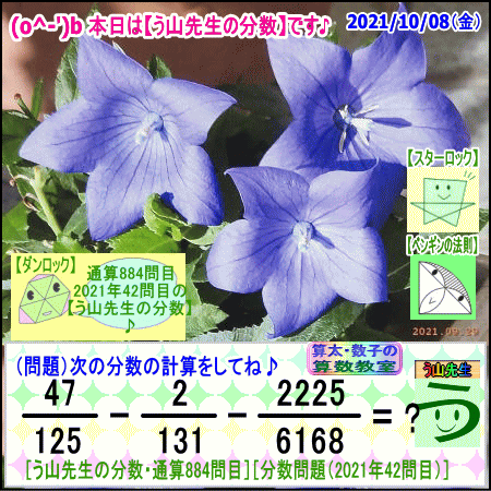 [う山雄一先生の分数]【分数884問目】算数・数学天才問題[2021年10月8日]Fraction □──────────────────□ 【算太・数子の算数教室】(R) 【算数合格トラの巻】 【う山TV(スタディ)】 【う山TV(バラエティ)】 【カンブリア・アカデミー】 □──────────────────□ (o^-')b 大人気☆[う山先生式・分数計算]の問題です♪ □──────────────────□ □ 2021/10/08(金曜) □ (o^-')b 【う山先生の分数・通算884問目】 [分数問題(2021年42問目)] 本日は2021年10月08日です。 次の分数計算をしてね♪ 47/125 - 2/131- 2225/6168 = ? 【答え】後程♪ □ □──────────────────□ (*^ー^)ノ 本日も面白い分数問題を作りました☆ 分子・分母ともどうなるかな♪ 本日も、10月に相応しい分数問題です☆ □ [Fraction of Professor Uyama] доля Frakcja Fracao □──────────────────□ 算数・数学・家庭教師・個別指導・質問教室 □──────────────────□ □□□□□□□□□□□□□□□□□□□□ #分数 #う山先生の分数 #算数 #算数合格トラの巻 #数学 #解けたら天才 #家庭教師 #う山TV #う山先生 #う山雄一先生 #算太数子の算数教室 #算太数子 #算太くん #数子ちゃん #オルドビスキー博士 #シルルちゃん #デボン君 #白亜紀先生 #カンブリアアカデミー #勉強 #勉強垢 #計算問題 #数学垢 #数学教えて #数学教える #中学受験 #中学入試 #高校入試 #高校受験 #相互フォロー □ □□□□□□□□□□□□□□□□□□□□ [発行者氏名]【う山雄一】 [発行者web]【算数合格トラの巻】 [発行者web]【算太・数子の算数教室】(R) [著作]【算太・数子の算数教室】(R) 「さんた・かずこのさんすうきょうしつ」 [著作]【算遊記】 □ [メインサイト]う山先生のHP https://uyama.theblog.me/ □ [中学受験・算数]メイン http://uyama.aikotoba.jp/ [中学受験・算数]サブ https://sansu.theblog.me/ http://santakazuko.wix.com/uyama □ [成績表・偏差値アップ] http://uyama.aikotoba.jp/seiseki/seiseki.html □ [算遊記(さんゆうき)]算蔵法師・算悟空 http://www.geocities.jp/san_yu_ki/(←工事中) □ [仕事用フェイスブック] https://www.facebook.com/kazuko.santa.5/ □ [全般メール] ??????@gmail.com □ [中学受験・仕事用メール] ??????@gmail.com □ [ブログ]【算数合格トラの巻】 http://ameblo.jp/sansu/ http://uyama.blog.jp/ https://blog.goo.ne.jp/sansu_gokaku □ [ブログ]【算太・数子の算数教室】(R) http://ameblo.jp/santa-kazuko/ http://blog.goo.ne.jp/santa_kazuko http://santakazuko.wordpress.com/ http://santa-kazuko.at.webry.info/ http://santa-kazuko.blogspot.jp/ http://ch.nicovideo.jp/santa-kazuko http://santa-kazuko.blog.jp/ □ [ブログ]【う山先生】 http://happy.ap.teacup.com/uyama/ http://sansugokaku.blog.fc2.com/ https://uyama-sensei.hatenablog.com/ □ [ブログ]【オルドビスキー博士】 http://ameblo.jp/ordovisky/ □ [ブログ]【う山TV】 https://ameblo.jp/uyama-tv/ □ [動画一覧]【う山TV】(スタディ/バラエティ) http://uyama.aikotoba.jp/3-uyama-tv.html □ [動画一覧]【う山TV】 https://uyama-tv.themedia.jp/ □ [作曲一覧]【う山TV】(作曲) https://uyama-tv.amebaownd.com/ □ [分数、楽しい!]シリーズ [分数で算数・数学の天才になろう♪]シリーズ [知的ゲーム]シリーズ [一瞬で解こう!]シリーズ [解けたら天才♪]シリーズ [家庭教師]シリーズ [算数・面白い問題]シリーズ [算数・数学ファイル/SSファイル]シリーズ 【音楽・作曲】シリーズ 【空耳】シリーズ 【恋愛探偵サララ】シリーズ 【ランキング】シリーズ □ □ 【毎日の問題ブログ】一覧(お好きなブログを登録してね♪) http://uyama.aikotoba.jp/2-blog.html □ □□□□□□□□□□□□□□□□□□□□ ☆ ☆ ☆ ☆ ☆ ☆ ☆ ☆ ☆ ☆ ☆