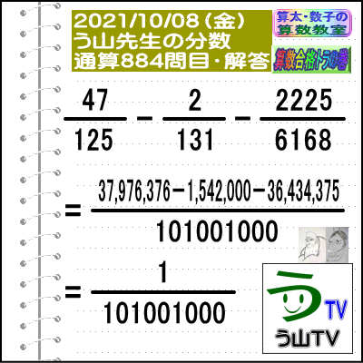 [う山先生・分数]【算数・数学】884問目【う山先生からの挑戦状】[2021年10月8日] □──────────────────□ (o^-')b【算数合格トラの巻】 【算太・数子の算数教室】(R) 【う山TV】 【カンブリア・アカデミー】 [Fraction of Professor Uyama] □──────────────────□ □ 2021/10/08(金曜) □ (o^-')b 【う山先生の分数・通算884問目】 [分数問題(2021年42問目)] 本日は2021年10月08日です。 次の分数計算をしてね♪ 47/125 - 2/131- 2225/6168 = ? □ □──────────────────□ □ (*^ー^)ノ 今回も、4年生・5年生でも、 頑張れば、楽しく解ける分数問題です☆ [う山先生の分数]は、 昨年2020年迄で、 合計【842問】作りました☆ 今年も、わかりやすく通し番号(通算番号)と、 その年の作成番号でいきます♪ □ 本日も人気の【う山雄一先生の分数問題】です! 楽しく解いてみて下さい♪(^^) □ [YouTube]の【う山TV】の分数動画も参照してね☆ □ 本日も、面白い分数問題を作成しました! 分母・分子はどうなるかな? 頑張って、10分以内で正解して下さい。 『算数は面白い!』を実感してね♪(^0^)/ □ [計算問題]を楽しんで解いて、 【算数は面白い!で算数合格】しましょう☆(o^-')b □ う山先生の予想正答率は、 堂々と正解 → 10%以下 頑張って正解 → 10%以下 頑張ったけど惜しくも不正解 → 10%以下 約分可能かどうか悩んで不正解 →0.1%以下 です。 □ ではレッツ・ゴー!! ☆(^o^)/ □ 答えは、 ↓ ↓ ↓ ↓ ↓ ↓ ↓ ↓ ↓ □ ==================== □ ♪( ´θ`)ノ 【う山先生の分数・通算884問目】解答 [分数問題(2021年42問目)] □ 【答え】[1/1xxx-xxx-xxxxx]です。 (分子=1→1桁) (分母=1xxx-xxx-xxxxx→9桁) □ (解法) 47/125 - 2/131- 2225/6168 =37,976,376/1xxx-xxx-xxxxx -1,542,000/1xxx-xxx-xxxxx -36,434,375/1xxx-xxx-xxxxx =1/1xxx-xxx-xxxxx □ □ ==================== □ ♪( ´θ`)ノ 本日も面白い数字の分数を作成しました♪ 本日は、10月に相応しい分数問題です☆ □ 分子は[1=1が1個→1桁] 分母は[101001000=1と0→9桁] です☆ □ □ ※==========※ 【参照】 □ ♪( ´θ`)ノ 【う山先生の分数・通算883問目】解答 [分数問題(2021年41問目)] □ 1/100000 -10/1000001 =1,000,001/1xxx-xxx-xxxxx-1,000,000/1xxx-xxx-xxxxx =1/1xxx-xxx-xxxxx □ ※==========※ □ □ ♪( ´ ▽ ` )ノ もちろん、答えは既約分数です☆ □ ==================== □ (*^ー^)ノ[参考] □ (125=5×5×5) (131=素数) (6168=2^3×3×257) (47=素数) (2=素数) (2225=5×5×89) (1xxx-xxx-xxxxx[9桁]=2^3×3×5^3×131×257=125×131×6168) □ □ □──────────────────□ #分数 #う山先生の分数 #算数 #算数合格トラの巻 #数学 #解けたら天才 #家庭教師 #う山TV #う山先生 #う山雄一先生 #算太数子の算数教室 #算太数子 #算太くん #数子ちゃん #オルドビスキー博士 #シルルちゃん #デボン君 #白亜紀先生 #カンブリアアカデミー #勉強 #勉強垢 #計算問題 #数学垢 #数学教えて #数学教える #中学受験 #中学入試 #高校入試 #高校受験 #相互フォロー □ □□□□□□□□□□□ [参考] 【う山先生の分数】通算884問目 [2013年]40問 [2014年]135問 [2015年]143問 [2016年]131問 [2017年]128問 [2018年]108問 [2019年]105問 [2020年]52問 □ [2021年] 2021/01/01(金)[1/2021] 2021/01/01(金)[1/2021] 2021/01/08(金)[1/2021] 2021/01/15(金)[1/2021] 2021/01/22(金)[1/2021] 2021/01/29(金)[2020/2021] 2021/02/05(金)[55555555555/222255552222] 2021/02/12(金)[111111211111/222222122222] 2021/02/19(金)[111111211111/222222122222] 2021/02/26(金)[155555/22666666] □ 2021/03/05(金)[55555333/3333555555] 2021/03/12(金)[31231231/312312312] 2021/03/19(金)[222222222223/333333333332] 2021/03/26(金)[5/3333344444] 2021/04/02(金)[555555555/3333344444] 2021/04/09(金)[4444499999/444444999999] 2021/04/16(金)[55555/4444446666] 2021/04/23(金)[44444/2222223333] 2021/04/30(金)[5555555/4444446666] 2021/05/07(金)[555555577777/555557777777] □ 2021/05/14(金)[111141111/11111411111] 2021/05/21(金)[22222522222/55555255555] 2021/05/28(金)[55555/2288888888] 2021/06/04(金)[55555/6666664444] 2021/06/11(金)[111111111116/666666666661] 2021/06/18(金)[666666666661/888888888881] 2021/06/25(金)[55555655555/66666566666] 2021/07/02(金)[22227772222/77772227777] 2021/07/09(金)[7979797979/79797979797] 2021/07/16(金)[666666166666/777777177777] □ 2021/07/23(金)[22222222222/333337733333] 2021/07/30(金)[33333333333/77777xxx-xxx-xxxxx] 2021/08/06(金)[75757575757/86868686868] 2021/08/13(金)[88888888888/333333111111] 2021/08/20(金)[123454321/87654345678] 2021/08/27(金)[88888888888/222222777777] 2021/09/03(金)[22882288/333999333999] 2021/09/10(金)[999999999/1xxx-xxx-xxxxx] 2021/09/17(金)[99999999999/1xxx-xxx-xxxxx] 2021/09/24(金)[9/1xxx-xxx-xxxxx] □ 2021/10/01(金)[1/1xxx-xxx-xxxxx] 2021/10/08(金)[1/1xxx-xxx-xxxxx]←本日(o^-')b □ □□□□□□□□□□□ □ □──────────────────□ 算数・数学・家庭教師・個別指導・質問教室 □──────────────────□ □ □□□□□□□□□□□□□□□□□□□□ [氏名]【う山雄一】 [動画]【う山TV(スタディ)】 [動画]【う山TV(バラエティ)】 [著書]【算太・数子の算数教室】(R) □ [メインサイト]【う山先生のHP】 https://uyama.theblog.me/ □ [中学受験・算数]メイン http://uyama.aikotoba.jp/ □ [中学生] https://uyama-sensei.theblog.me/ □ [高校生] https://uyama-sensei.amebaownd.com/ □ [成績表・偏差値