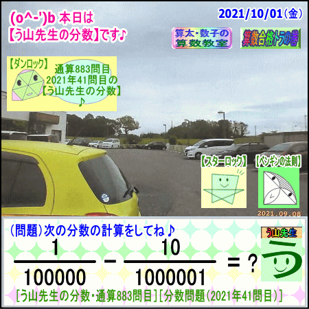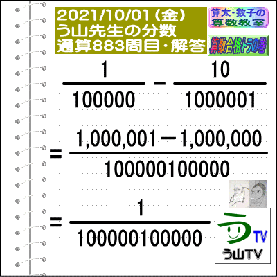 [う山雄一先生の分数]【分数883問目】算数・数学天才問題[2021年10月1日]Fraction □──────────────────□ 【算太・数子の算数教室】(R) 【算数合格トラの巻】 【う山TV(スタディ)】 【う山TV(バラエティ)】 【カンブリア・アカデミー】 □──────────────────□ (o^-')b 大人気☆[う山先生式・分数計算]の問題です♪ □──────────────────□ □ 2021/10/01(金曜) □ (o^-')b 【う山先生の分数・通算883問目】 [分数問題(2021年41問目)] 本日は2021年10月01日です。 次の分数計算をしてね♪ 1/100000 -10/1000001 = ? 【答え】後程♪ □ □──────────────────□ (*^ー^)ノ 本日も面白い分数問題を作りました☆ 分子・分母ともどうなるかな♪ 本日、10月1日に相応しい分数問題です☆ 先週の分数問題とよ~く比べてみましょう♪ □ [Fraction of Professor Uyama] доля Frakcja Fracao □──────────────────□ 算数・数学・家庭教師・個別指導・質問教室 □──────────────────□ □□□□□□□□□□□□□□□□□□□□ #分数 #う山先生の分数 #算数 #算数合格トラの巻 #数学 #解けたら天才 #家庭教師 #う山TV #う山先生 #う山雄一先生 #算太数子の算数教室 #算太数子 #算太くん #数子ちゃん #オルドビスキー博士 #シルルちゃん #デボン君 #白亜紀先生 #カンブリアアカデミー #勉強 #勉強垢 #計算問題 #数学垢 #数学教えて #数学教える #中学受験 #中学入試 #高校入試 #高校受験 #相互フォロー □ □□□□□□□□□□□□□□□□□□□□ [発行者氏名]【う山雄一】 [発行者web]【算数合格トラの巻】 [発行者web]【算太・数子の算数教室】(R) [著作]【算太・数子の算数教室】(R) 「さんた・かずこのさんすうきょうしつ」 [著作]【算遊記】 □ [メインサイト]う山先生のHP https://uyama.theblog.me/ □ [中学受験・算数]メイン http://uyama.aikotoba.jp/ [中学受験・算数]サブ https://sansu.theblog.me/ http://santakazuko.wix.com/uyama □ [成績表・偏差値アップ] http://uyama.aikotoba.jp/seiseki/seiseki.html □ [算遊記(さんゆうき)]算蔵法師・算悟空 http://www.geocities.jp/san_yu_ki/(←工事中) □ [仕事用フェイスブック] https://www.facebook.com/kazuko.santa.5/ □ [全般メール] ??????@gmail.com □ [中学受験・仕事用メール] ??????@gmail.com □ [ブログ]【算数合格トラの巻】 http://ameblo.jp/sansu/ http://uyama.blog.jp/ https://blog.goo.ne.jp/sansu_gokaku □ [ブログ]【算太・数子の算数教室】(R) http://ameblo.jp/santa-kazuko/ http://blog.goo.ne.jp/santa_kazuko http://santakazuko.wordpress.com/ http://santa-kazuko.at.webry.info/ http://santa-kazuko.blogspot.jp/ http://ch.nicovideo.jp/santa-kazuko http://santa-kazuko.blog.jp/ □ [ブログ]【う山先生】 http://happy.ap.teacup.com/uyama/ http://sansugokaku.blog.fc2.com/ https://uyama-sensei.hatenablog.com/ □ [ブログ]【オルドビスキー博士】 http://ameblo.jp/ordovisky/ □ [ブログ]【う山TV】 https://ameblo.jp/uyama-tv/ □ [動画一覧]【う山TV】(スタディ/バラエティ) http://uyama.aikotoba.jp/3-uyama-tv.html □ [動画一覧]【う山TV】 https://uyama-tv.themedia.jp/ □ [作曲一覧]【う山TV】(作曲) https://uyama-tv.amebaownd.com/ □ [分数、楽しい!]シリーズ [分数で算数・数学の天才になろう♪]シリーズ [知的ゲーム]シリーズ [一瞬で解こう!]シリーズ [解けたら天才♪]シリーズ [家庭教師]シリーズ [算数・面白い問題]シリーズ [算数・数学ファイル/SSファイル]シリーズ 【音楽・作曲】シリーズ 【空耳】シリーズ 【恋愛探偵サララ】シリーズ 【ランキング】シリーズ □ □ 【毎日の問題ブログ】一覧(お好きなブログを登録してね♪) http://uyama.aikotoba.jp/2-blog.html □ □□□□□□□□□□□□□□□□□□□□ ☆ ☆ ☆ ☆ ☆ ☆ ☆ ☆ ☆ ☆ ☆