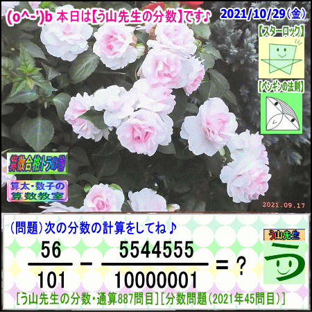 [う山雄一先生の分数]【分数887問目】算数・数学天才問題[2021年10月29日]Fraction □──────────────────□ 【算太・数子の算数教室】(R) 【算数合格トラの巻】 【う山TV(スタディ)】 【う山TV(バラエティ)】 【カンブリア・アカデミー】 □──────────────────□ (o^-')b 大人気☆[う山先生式・分数計算]の問題です♪ □──────────────────□ □ 2021/10/29(金曜) □ (o^-')b 【う山先生の分数・通算887問目】 [分数問題(2021年45問目)] 本日は2021年10月29日です。 次の分数計算をしてね♪ 56/101 - 5544555/1xxx-xxx-xxxxx = ? 【答え】後程♪ □ □──────────────────□ (*^ー^)ノ 本日も面白い分数問題を作りました☆ 分子・分母ともどうなるかな♪ 本日も、10月に相応しい分数問題です☆ □ [Fraction of Professor Uyama] доля Frakcja Fracao □──────────────────□ 算数・数学・家庭教師・個別指導・質問教室 □──────────────────□ □□□□□□□□□□□□□□□□□□□□ #分数 #う山先生の分数 #算数 #算数合格トラの巻 #数学 #解けたら天才 #家庭教師 #う山TV #う山先生 #う山雄一先生 #算太数子の算数教室 #算太数子 #算太くん #数子ちゃん #オルドビスキー博士 #シルルちゃん #デボン君 #白亜紀先生 #カンブリアアカデミー #勉強 #勉強垢 #計算問題 #数学垢 #数学教えて #数学教える #中学受験 #中学入試 #高校入試 #高校受験 #相互フォロー □ □□□□□□□□□□□□□□□□□□□□ [発行者氏名]【う山雄一】 [発行者web]【算数合格トラの巻】 [発行者web]【算太・数子の算数教室】(R) [著作]【算太・数子の算数教室】(R) 「さんた・かずこのさんすうきょうしつ」 [著作]【算遊記】 □ [メインサイト]う山先生のHP https://uyama.theblog.me/ □ [中学受験・算数]メイン http://uyama.aikotoba.jp/ [中学受験・算数]サブ https://sansu.theblog.me/ http://santakazuko.wix.com/uyama □ [成績表・偏差値アップ] http://uyama.aikotoba.jp/seiseki/seiseki.html □ [算遊記(さんゆうき)]算蔵法師・算悟空 http://www.geocities.jp/san_yu_ki/(←工事中) □ [仕事用フェイスブック] https://www.facebook.com/kazuko.santa.5/ □ [全般メール] ??????@gmail.com □ [中学受験・仕事用メール] ??????@gmail.com □ [ブログ]【算数合格トラの巻】 http://ameblo.jp/sansu/ http://uyama.blog.jp/ https://blog.goo.ne.jp/sansu_gokaku □ [ブログ]【算太・数子の算数教室】(R) http://ameblo.jp/santa-kazuko/ http://blog.goo.ne.jp/santa_kazuko http://santakazuko.wordpress.com/ http://santa-kazuko.at.webry.info/ http://santa-kazuko.blogspot.jp/ http://ch.nicovideo.jp/santa-kazuko http://santa-kazuko.blog.jp/ □ [ブログ]【う山先生】 http://happy.ap.teacup.com/uyama/ http://sansugokaku.blog.fc2.com/ https://uyama-sensei.hatenablog.com/ □ [ブログ]【オルドビスキー博士】 http://ameblo.jp/ordovisky/ □ [ブログ]【う山TV】 https://ameblo.jp/uyama-tv/ □ [動画一覧]【う山TV】(スタディ/バラエティ) http://uyama.aikotoba.jp/3-uyama-tv.html □ [動画一覧]【う山TV】 https://uyama-tv.themedia.jp/ □ [作曲一覧]【う山TV】(作曲) https://uyama-tv.amebaownd.com/ □ [分数、楽しい!]シリーズ [分数で算数・数学の天才になろう♪]シリーズ [知的ゲーム]シリーズ [一瞬で解こう!]シリーズ [解けたら天才♪]シリーズ [家庭教師]シリーズ [算数・面白い問題]シリーズ [算数・数学ファイル/SSファイル]シリーズ 【音楽・作曲】シリーズ 【空耳】シリーズ 【恋愛探偵サララ】シリーズ 【ランキング】シリーズ □ □ 【毎日の問題ブログ】一覧(お好きなブログを登録してね♪) http://uyama.aikotoba.jp/2-blog.html □ □□□□□□□□□□□□□□□□□□□□ ☆ ☆ ☆ ☆ ☆ ☆ ☆ ☆ ☆ ☆ ☆