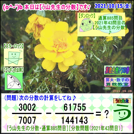 [う山雄一先生の分数]【分数885問目】算数・数学天才問題[2021年10月15日]Fraction □──────────────────□ 【算太・数子の算数教室】(R) 【算数合格トラの巻】 【う山TV(スタディ)】 【う山TV(バラエティ)】 【カンブリア・アカデミー】 □──────────────────□ (o^-')b 大人気☆[う山先生式・分数計算]の問題です♪ □──────────────────□ □ 2021/10/15(金曜) □ (o^-')b 【う山先生の分数・通算885問目】 [分数問題(2021年43問目)] 本日は2021年10月15日です。 次の分数計算をしてね♪ 3002/7007 - 61755/144143 = ? 【答え】後程♪ □ □──────────────────□ (*^ー^)ノ 本日も面白い分数問題を作りました☆ 分子・分母ともどうなるかな♪ 本日も、10月に相応しい分数問題です☆ □ [Fraction of Professor Uyama] доля Frakcja Fracao □──────────────────□ 算数・数学・家庭教師・個別指導・質問教室 □──────────────────□ □□□□□□□□□□□□□□□□□□□□ #分数 #う山先生の分数 #算数 #算数合格トラの巻 #数学 #解けたら天才 #家庭教師 #う山TV #う山先生 #う山雄一先生 #算太数子の算数教室 #算太数子 #算太くん #数子ちゃん #オルドビスキー博士 #シルルちゃん #デボン君 #白亜紀先生 #カンブリアアカデミー #勉強 #勉強垢 #計算問題 #数学垢 #数学教えて #数学教える #中学受験 #中学入試 #高校入試 #高校受験 #相互フォロー □ □□□□□□□□□□□□□□□□□□□□ [発行者氏名]【う山雄一】 [発行者web]【算数合格トラの巻】 [発行者web]【算太・数子の算数教室】(R) [著作]【算太・数子の算数教室】(R) 「さんた・かずこのさんすうきょうしつ」 [著作]【算遊記】 □ [メインサイト]う山先生のHP https://uyama.theblog.me/ □ [中学受験・算数]メイン http://uyama.aikotoba.jp/ [中学受験・算数]サブ https://sansu.theblog.me/ http://santakazuko.wix.com/uyama □ [成績表・偏差値アップ] http://uyama.aikotoba.jp/seiseki/seiseki.html □ [算遊記(さんゆうき)]算蔵法師・算悟空 http://www.geocities.jp/san_yu_ki/(←工事中) □ [仕事用フェイスブック] https://www.facebook.com/kazuko.santa.5/ □ [全般メール] ??????@gmail.com □ [中学受験・仕事用メール] ??????@gmail.com □ [ブログ]【算数合格トラの巻】 http://ameblo.jp/sansu/ http://uyama.blog.jp/ https://blog.goo.ne.jp/sansu_gokaku □ [ブログ]【算太・数子の算数教室】(R) http://ameblo.jp/santa-kazuko/ http://blog.goo.ne.jp/santa_kazuko http://santakazuko.wordpress.com/ http://santa-kazuko.at.webry.info/ http://santa-kazuko.blogspot.jp/ http://ch.nicovideo.jp/santa-kazuko http://santa-kazuko.blog.jp/ □ [ブログ]【う山先生】 http://happy.ap.teacup.com/uyama/ http://sansugokaku.blog.fc2.com/ https://uyama-sensei.hatenablog.com/ □ [ブログ]【オルドビスキー博士】 http://ameblo.jp/ordovisky/ □ [ブログ]【う山TV】 https://ameblo.jp/uyama-tv/ □ [動画一覧]【う山TV】(スタディ/バラエティ) http://uyama.aikotoba.jp/3-uyama-tv.html □ [動画一覧]【う山TV】 https://uyama-tv.themedia.jp/ □ [作曲一覧]【う山TV】(作曲) https://uyama-tv.amebaownd.com/ □ [分数、楽しい!]シリーズ [分数で算数・数学の天才になろう♪]シリーズ [知的ゲーム]シリーズ [一瞬で解こう!]シリーズ [解けたら天才♪]シリーズ [家庭教師]シリーズ [算数・面白い問題]シリーズ [算数・数学ファイル/SSファイル]シリーズ 【音楽・作曲】シリーズ 【空耳】シリーズ 【恋愛探偵サララ】シリーズ 【ランキング】シリーズ □ □ 【毎日の問題ブログ】一覧(お好きなブログを登録してね♪) http://uyama.aikotoba.jp/2-blog.html □ □□□□□□□□□□□□□□□□□□□□ ☆ ☆ ☆ ☆ ☆ ☆ ☆ ☆ ☆ ☆ ☆