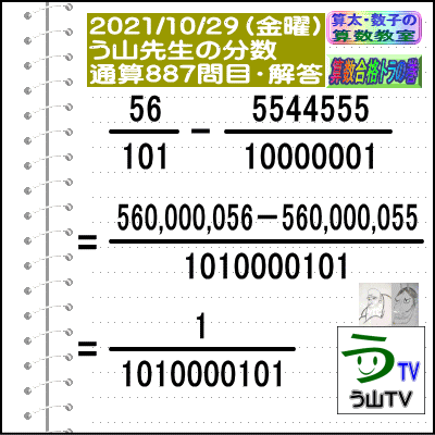 [う山先生・分数]【算数・数学】887問目【う山先生からの挑戦状】[2021年10月29日] □──────────────────□ (o^-')b【算数合格トラの巻】 【算太・数子の算数教室】(R) 【う山TV】 【カンブリア・アカデミー】 [Fraction of Professor Uyama] □──────────────────□ □ 2021/10/29(金曜) □ (o^-')b 【う山先生の分数・通算887問目】 [分数問題(2021年45問目)] 本日は2021年10月29日です。 次の分数計算をしてね♪ 56/101 - 5544555/1xxx-xxx-xxxxx = ? □ □──────────────────□ □ (*^ー^)ノ 今回も、4年生・5年生でも、 頑張れば、楽しく解ける分数問題です☆ [う山先生の分数]は、 昨年2020年迄で、 合計【842問】作りました☆ 今年も、わかりやすく通し番号(通算番号)と、 その年の作成番号でいきます♪ □ 本日も人気の【う山雄一先生の分数問題】です! 楽しく解いてみて下さい♪(^^) □ [YouTube]の【う山TV】の分数動画も参照してね☆ □ 本日も、面白い分数問題を作成しました! 分母・分子はどうなるかな? 頑張って、10分以内で正解して下さい。 『算数は面白い!』を実感してね♪(^0^)/ □ [計算問題]を楽しんで解いて、 【算数は面白い!で算数合格】しましょう☆(o^-')b □ う山先生の予想正答率は、 堂々と正解 → 10%以下 頑張って正解 → 10%以下 頑張ったけど惜しくも不正解 → 10%以下 約分可能かどうか悩んで不正解 →0.1%以下 です。 □ ではレッツ・ゴー!! ☆(^o^)/ □ 答えは、 ↓ ↓ ↓ ↓ ↓ ↓ ↓ ↓ ↓ □ ==================== □ ♪( ´θ`)ノ 【う山先生の分数・通算887問目】解答 [分数問題(2021年45問目)] □ 【答え】[1/1xxx-xxx-xxxxx]です。 (分子=1→1桁) (分母=1xxx-xxx-xxxxx→10桁) □ (解法) 56/101 - 5544555/1xxx-xxx-xxxxx =560,000,056/1xxx-xxx-xxxxx-560,000,055/1xxx-xxx-xxxxx =1/1xxx-xxx-xxxxx □ □ ==================== □ ♪( ´θ`)ノ 本日も面白い数字の分数を作成しました♪ 本日も、10月に相応しい分数問題です☆ □ 分子は[1=1が1個→1桁] 分母は[1010000101=1と0→10桁] です☆ □ □ ※==========※ 【参照】 □ 2021/10/01(金)[1/1xxx-xxx-xxxxx] 2021/10/08(金)[1/1xxx-xxx-xxxxx] 2021/10/15(金)[1/1xxx-xxx-xxxxx] 2021/10/22(金)[1/1xxx-xxx-xxxxx] 2021/10/29(金)[1/1xxx-xxx-xxxxx] □ ※==========※ □ □ ♪( ´ ▽ ` )ノ もちろん、答えは既約分数です☆ □ □ ==================== □ (*^ー^)ノ[参考] □ (101=素数) (1xxx-xxx-xxxxx=11×909091) (56=2×2×2×7) (5544555=3×5×369637) (1xxx-xxx-xxxxx[10桁]=11×101×909091=101×1xxx-xxx-xxxxx) □ □ □──────────────────□ #分数 #う山先生の分数 #算数 #算数合格トラの巻 #数学 #解けたら天才 #家庭教師 #う山TV #う山先生 #う山雄一先生 #算太数子の算数教室 #算太数子 #算太くん #数子ちゃん #オルドビスキー博士 #シルルちゃん #デボン君 #白亜紀先生 #カンブリアアカデミー #勉強 #勉強垢 #計算問題 #数学垢 #数学教えて #数学教える #中学受験 #中学入試 #高校入試 #高校受験 #相互フォロー □ □□□□□□□□□□□ [参考] 【う山先生の分数】通算887問目 [2013年]40問 [2014年]135問 [2015年]143問 [2016年]131問 [2017年]128問 [2018年]108問 [2019年]105問 [2020年]52問 □ [2021年] 2021/01/01(金)[1/2021] 2021/01/01(金)[1/2021] 2021/01/08(金)[1/2021] 2021/01/15(金)[1/2021] 2021/01/22(金)[1/2021] 2021/01/29(金)[2020/2021] 2021/02/05(金)[55555555555/222255552222] 2021/02/12(金)[111111211111/222222122222] 2021/02/19(金)[111111211111/222222122222] 2021/02/26(金)[155555/22666666] □ 2021/03/05(金)[55555333/3333555555] 2021/03/12(金)[31231231/312312312] 2021/03/19(金)[222222222223/333333333332] 2021/03/26(金)[5/3333344444] 2021/04/02(金)[555555555/3333344444] 2021/04/09(金)[4444499999/444444999999] 2021/04/16(金)[55555/4444446666] 2021/04/23(金)[44444/2222223333] 2021/04/30(金)[5555555/4444446666] 2021/05/07(金)[555555577777/555557777777] □ 2021/05/14(金)[111141111/11111411111] 2021/05/21(金)[22222522222/55555255555] 2021/05/28(金)[55555/2288888888] 2021/06/04(金)[55555/6666664444] 2021/06/11(金)[111111111116/666666666661] 2021/06/18(金)[666666666661/888888888881] 2021/06/25(金)[55555655555/66666566666] 2021/07/02(金)[22227772222/77772227777] 2021/07/09(金)[7979797979/79797979797] 2021/07/16(金)[666666166666/777777177777] □ 2021/07/23(金)[22222222222/333337733333] 2021/07/30(金)[33333333333/77777xxx-xxx-xxxxx] 2021/08/06(金)[75757575757/86868686868] 2021/08/13(金)[88888888888/333333111111] 2021/08/20(金)[123454321/87654345678] 2021/08/27(金)[88888888888/222222777777] 2021/09/03(金)[22882288/333999333999] 2021/09/10(金)[999999999/1xxx-xxx-xxxxx] 2021/09/17(金)[99999999999/1xxx-xxx-xxxxx] 2021/09/24(金)[9/1xxx-xxx-xxxxx] □ 2021/10/01(金)[1/1xxx-xxx-xxxxx] 2021/10/08(金)[1/1xxx-xxx-xxxxx] 2021/10/15(金)[1/1xxx-xxx-xxxxx] 2021/10/22(金)[1/1xxx-xxx-xxxxx] 2021/10/29(金)[1/1xxx-xxx-xxxxx]←本日(o^-')b □ □□□□□□□□□□□ □ □──────────────────□ 算数・数学・家庭教師・個別指導・質問教室 □──────────────────□ □ □□□□□□□□□□□□□□□□□□□□ [氏名]【う山雄一】 [動画]【う山TV(スタディ)】 [動画]【う山TV(バラエティ)】 [著書]【算太・数子の算数教室】(R) □ [メインサイト]【う山先生のHP】 https://uyama.theblog.me/ □ [中学受験・算数]メイン http://uyama.aikotoba.jp/ □ [中学生] https://uyama-sensei.theblog.me/ □ [高