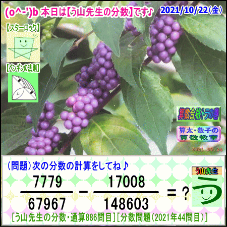 [う山雄一先生の分数]【分数886問目】算数・数学天才問題[2021年10月22日]Fraction □──────────────────□ 【算太・数子の算数教室】(R) 【算数合格トラの巻】 【う山TV(スタディ)】 【う山TV(バラエティ)】 【カンブリア・アカデミー】 □──────────────────□ (o^-')b 大人気☆[う山先生式・分数計算]の問題です♪ □──────────────────□ □ 2021/10/22(金曜) □ (o^-')b 【う山先生の分数・通算886問目】 [分数問題(2021年44問目)] 本日は2021年10月22日です。 次の分数計算をしてね♪ 7779/67967 - 17008/148603 = ? 【答え】後程♪ □ □──────────────────□ (*^ー^)ノ 本日も面白い分数問題を作りました☆ 分子・分母ともどうなるかな♪ 本日も、10月に相応しい分数問題です☆ □ [Fraction of Professor Uyama] доля Frakcja Fracao □──────────────────□ 算数・数学・家庭教師・個別指導・質問教室 □──────────────────□ □□□□□□□□□□□□□□□□□□□□ #分数 #う山先生の分数 #算数 #算数合格トラの巻 #数学 #解けたら天才 #家庭教師 #う山TV #う山先生 #う山雄一先生 #算太数子の算数教室 #算太数子 #算太くん #数子ちゃん #オルドビスキー博士 #シルルちゃん #デボン君 #白亜紀先生 #カンブリアアカデミー #勉強 #勉強垢 #計算問題 #数学垢 #数学教えて #数学教える #中学受験 #中学入試 #高校入試 #高校受験 #相互フォロー □ □□□□□□□□□□□□□□□□□□□□ [発行者氏名]【う山雄一】 [発行者web]【算数合格トラの巻】 [発行者web]【算太・数子の算数教室】(R) [著作]【算太・数子の算数教室】(R) 「さんた・かずこのさんすうきょうしつ」 [著作]【算遊記】 □ [メインサイト]う山先生のHP https://uyama.theblog.me/ □ [中学受験・算数]メイン http://uyama.aikotoba.jp/ [中学受験・算数]サブ https://sansu.theblog.me/ http://santakazuko.wix.com/uyama □ [成績表・偏差値アップ] http://uyama.aikotoba.jp/seiseki/seiseki.html □ [算遊記(さんゆうき)]算蔵法師・算悟空 http://www.geocities.jp/san_yu_ki/(←工事中) □ [仕事用フェイスブック] https://www.facebook.com/kazuko.santa.5/ □ [全般メール] ??????@gmail.com □ [中学受験・仕事用メール] ??????@gmail.com □ [ブログ]【算数合格トラの巻】 http://ameblo.jp/sansu/ http://uyama.blog.jp/ https://blog.goo.ne.jp/sansu_gokaku □ [ブログ]【算太・数子の算数教室】(R) http://ameblo.jp/santa-kazuko/ http://blog.goo.ne.jp/santa_kazuko http://santakazuko.wordpress.com/ http://santa-kazuko.at.webry.info/ http://santa-kazuko.blogspot.jp/ http://ch.nicovideo.jp/santa-kazuko http://santa-kazuko.blog.jp/ □ [ブログ]【う山先生】 http://happy.ap.teacup.com/uyama/ http://sansugokaku.blog.fc2.com/ https://uyama-sensei.hatenablog.com/ □ [ブログ]【オルドビスキー博士】 http://ameblo.jp/ordovisky/ □ [ブログ]【う山TV】 https://ameblo.jp/uyama-tv/ □ [動画一覧]【う山TV】(スタディ/バラエティ) http://uyama.aikotoba.jp/3-uyama-tv.html □ [動画一覧]【う山TV】 https://uyama-tv.themedia.jp/ □ [作曲一覧]【う山TV】(作曲) https://uyama-tv.amebaownd.com/ □ [分数、楽しい!]シリーズ [分数で算数・数学の天才になろう♪]シリーズ [知的ゲーム]シリーズ [一瞬で解こう!]シリーズ [解けたら天才♪]シリーズ [家庭教師]シリーズ [算数・面白い問題]シリーズ [算数・数学ファイル/SSファイル]シリーズ 【音楽・作曲】シリーズ 【空耳】シリーズ 【恋愛探偵サララ】シリーズ 【ランキング】シリーズ □ □ 【毎日の問題ブログ】一覧(お好きなブログを登録してね♪) http://uyama.aikotoba.jp/2-blog.html □ □□□□□□□□□□□□□□□□□□□□ ☆ ☆ ☆ ☆ ☆ ☆ ☆ ☆ ☆ ☆ ☆