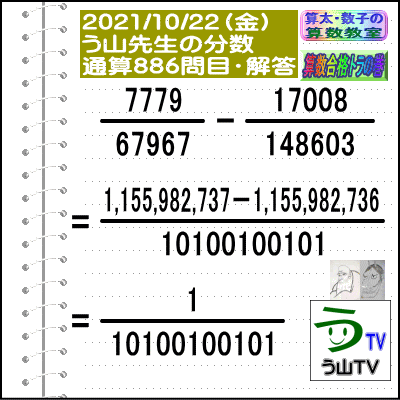 [う山先生・分数]【算数・数学】886問目【う山先生からの挑戦状】[2021年10月22日] □──────────────────□ (o^-')b【算数合格トラの巻】 【算太・数子の算数教室】(R) 【う山TV】 【カンブリア・アカデミー】 [Fraction of Professor Uyama] □──────────────────□ □ 2021/10/22(金曜) □ (o^-')b 【う山先生の分数・通算886問目】 [分数問題(2021年44問目)] 本日は2021年10月22日です。 次の分数計算をしてね♪ 7779/67967 - 17008/148603 = ? □ □──────────────────□ □ (*^ー^)ノ 今回も、4年生・5年生でも、 頑張れば、楽しく解ける分数問題です☆ [う山先生の分数]は、 昨年2020年迄で、 合計【842問】作りました☆ 今年も、わかりやすく通し番号(通算番号)と、 その年の作成番号でいきます♪ □ 本日も人気の【う山雄一先生の分数問題】です! 楽しく解いてみて下さい♪(^^) □ [YouTube]の【う山TV】の分数動画も参照してね☆ □ 本日も、面白い分数問題を作成しました! 分母・分子はどうなるかな? 頑張って、10分以内で正解して下さい。 『算数は面白い!』を実感してね♪(^0^)/ □ [計算問題]を楽しんで解いて、 【算数は面白い!で算数合格】しましょう☆(o^-')b □ う山先生の予想正答率は、 堂々と正解 → 10%以下 頑張って正解 → 10%以下 頑張ったけど惜しくも不正解 → 10%以下 約分可能かどうか悩んで不正解 →0.1%以下 です。 □ ではレッツ・ゴー!! ☆(^o^)/ □ 答えは、 ↓ ↓ ↓ ↓ ↓ ↓ ↓ ↓ ↓ □ ==================== □ ♪( ´θ`)ノ 【う山先生の分数・通算886問目】解答 [分数問題(2021年44問目)] □ 【答え】[1/1xxx-xxx-xxxxx]です。 (分子=1→1桁) (分母=1xxx-xxx-xxxxx→11桁) □ (解法) 7779/67967 - 17008/148603 =1,155,982,737/1xxx-xxx-xxxxx-1,155,982,736/1xxx-xxx-xxxxx =1/1xxx-xxx-xxxxx □ □ ==================== □ ♪( ´θ`)ノ 本日も面白い数字の分数を作成しました♪ 本日も、10月に相応しい分数問題です☆ □ 分子は[1=1が1個→1桁] 分母は[10100100101=1と0→11桁] です☆ □ □ ※==========※ 【参照】1 □ ♪( ´θ`)ノ 【う山先生の分数・通算883問目】解答 [分数問題(2021年41問目)] □ 1/100000 -10/1000001 =1/1xxx-xxx-xxxxx □ ※==========※ 【参照】2 □ ♪( ´θ`)ノ 【う山先生の分数・通算884問目】解答 [分数問題(2021年42問目)] □ 47/125 - 2/131- 2225/6168 =1/1xxx-xxx-xxxxx □ ※==========※ 【参照】3 □ ♪( ´θ`)ノ 【う山先生の分数・通算885問目】解答 [分数問題(2021年43問目)] □ 3002/7007 - 61755/144143 =1/1xxx-xxx-xxxxx □ ※==========※ □ □ ♪( ´ ▽ ` )ノ もちろん、答えは既約分数です☆ □ ==================== □ (*^ー^)ノ[参考] □ (67967=素数) (148603=7×13×23×71) (7779=3×2597) (17008=2×2×2×2×1063) (1xxx-xxx-xxxxx[11桁]=7×13×23×71×67967=148603×67967) □ □ □──────────────────□ #分数 #う山先生の分数 #算数 #算数合格トラの巻 #数学 #解けたら天才 #家庭教師 #う山TV #う山先生 #う山雄一先生 #算太数子の算数教室 #算太数子 #算太くん #数子ちゃん #オルドビスキー博士 #シルルちゃん #デボン君 #白亜紀先生 #カンブリアアカデミー #勉強 #勉強垢 #計算問題 #数学垢 #数学教えて #数学教える #中学受験 #中学入試 #高校入試 #高校受験 #相互フォロー □ □□□□□□□□□□□ [参考] 【う山先生の分数】通算886問目 [2013年]40問 [2014年]135問 [2015年]143問 [2016年]131問 [2017年]128問 [2018年]108問 [2019年]105問 [2020年]52問 □ [2021年] 2021/01/01(金)[1/2021] 2021/01/01(金)[1/2021] 2021/01/08(金)[1/2021] 2021/01/15(金)[1/2021] 2021/01/22(金)[1/2021] 2021/01/29(金)[2020/2021] 2021/02/05(金)[55555555555/222255552222] 2021/02/12(金)[111111211111/222222122222] 2021/02/19(金)[111111211111/222222122222] 2021/02/26(金)[155555/22666666] □ 2021/03/05(金)[55555333/3333555555] 2021/03/12(金)[31231231/312312312] 2021/03/19(金)[222222222223/333333333332] 2021/03/26(金)[5/3333344444] 2021/04/02(金)[555555555/3333344444] 2021/04/09(金)[4444499999/444444999999] 2021/04/16(金)[55555/4444446666] 2021/04/23(金)[44444/2222223333] 2021/04/30(金)[5555555/4444446666] 2021/05/07(金)[555555577777/555557777777] □ 2021/05/14(金)[111141111/11111411111] 2021/05/21(金)[22222522222/55555255555] 2021/05/28(金)[55555/2288888888] 2021/06/04(金)[55555/6666664444] 2021/06/11(金)[111111111116/666666666661] 2021/06/18(金)[666666666661/888888888881] 2021/06/25(金)[55555655555/66666566666] 2021/07/02(金)[22227772222/77772227777] 2021/07/09(金)[7979797979/79797979797] 2021/07/16(金)[666666166666/777777177777] □ 2021/07/23(金)[22222222222/333337733333] 2021/07/30(金)[33333333333/77777xxx-xxx-xxxxx] 2021/08/06(金)[75757575757/86868686868] 2021/08/13(金)[88888888888/333333111111] 2021/08/20(金)[123454321/87654345678] 2021/08/27(金)[88888888888/222222777777] 2021/09/03(金)[22882288/333999333999] 2021/09/10(金)[999999999/1xxx-xxx-xxxxx] 2021/09/17(金)[99999999999/1xxx-xxx-xxxxx] 2021/09/24(金)[9/1xxx-xxx-xxxxx] □ 2021/10/01(金)[1/1xxx-xxx-xxxxx] 2021/10/08(金)[1/1xxx-xxx-xxxxx] 2021/10/15(金)[1/1xxx-xxx-xxxxx] 2021/10/22(金)[1/1xxx-xxx-xxxxx]←本日(o^-')b □ □□□□□□□□□□□ □ □──────────────────□ 算数・数学・家庭教師・個別指導・質問教室 □──────────────────□ □ □□□□□□□□□□□□□□□□□□□□ [氏名]【う山雄一】 [動画]【う山TV(ス