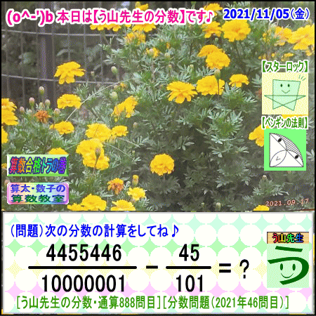 [う山雄一先生の分数]【分数888問目】算数・数学天才問題[2021年11月5日]Fraction □──────────────────□ 【算太・数子の算数教室】(R) 【算数合格トラの巻】 【う山TV(スタディ)】 【う山TV(バラエティ)】 【カンブリア・アカデミー】 □──────────────────□ (o^-')b 大人気☆[う山先生式・分数計算]の問題です♪ □──────────────────□ □ 2021/11/05(金曜) □ (o^-')b 【う山先生の分数・通算888問目】 [分数問題(2021年46問目)] 本日は2021年11月5日です。 次の分数計算をしてね♪ 4455446/1xxx-xxx-xxxxx - 45/101 = ? 【答え】後程♪ □ □──────────────────□ (*^ー^)ノ 本日も面白い分数問題を作りました☆ 分子・分母ともどうなるかな♪ 本日は、前回を思い出してもらいたい分数問題です☆ □ [Fraction of Professor Uyama] доля Frakcja Fracao □──────────────────□ 算数・数学・家庭教師・個別指導・質問教室 □──────────────────□ □□□□□□□□□□□□□□□□□□□□ #分数 #う山先生の分数 #算数 #算数合格トラの巻 #数学 #解けたら天才 #家庭教師 #う山TV #う山先生 #う山雄一先生 #算太数子の算数教室 #算太数子 #算太くん #数子ちゃん #オルドビスキー博士 #シルルちゃん #デボン君 #白亜紀先生 #カンブリアアカデミー #勉強 #勉強垢 #計算問題 #数学垢 #数学教えて #数学教える #中学受験 #中学入試 #高校入試 #高校受験 #相互フォロー □ □□□□□□□□□□□□□□□□□□□□ [発行者氏名]【う山雄一】 [発行者web]【算数合格トラの巻】 [発行者web]【算太・数子の算数教室】(R) [著作]【算太・数子の算数教室】(R) 「さんた・かずこのさんすうきょうしつ」 [著作]【算遊記】 □ [メインサイト]う山先生のHP https://uyama.theblog.me/ □ [中学受験・算数]メイン http://uyama.aikotoba.jp/ [中学受験・算数]サブ https://sansu.theblog.me/ http://santakazuko.wix.com/uyama □ [成績表・偏差値アップ] http://uyama.aikotoba.jp/seiseki/seiseki.html □ [算遊記(さんゆうき)]算蔵法師・算悟空 http://www.geocities.jp/san_yu_ki/(←工事中) □ [仕事用フェイスブック] https://www.facebook.com/kazuko.santa.5/ □ [全般メール] ??????@gmail.com □ [中学受験・仕事用メール] ??????@gmail.com □ [ブログ]【算数合格トラの巻】 http://ameblo.jp/sansu/ http://uyama.blog.jp/ https://blog.goo.ne.jp/sansu_gokaku □ [ブログ]【算太・数子の算数教室】(R) http://ameblo.jp/santa-kazuko/ http://blog.goo.ne.jp/santa_kazuko http://santakazuko.wordpress.com/ http://santa-kazuko.at.webry.info/ http://santa-kazuko.blogspot.jp/ http://ch.nicovideo.jp/santa-kazuko http://santa-kazuko.blog.jp/ □ [ブログ]【う山先生】 http://happy.ap.teacup.com/uyama/ http://sansugokaku.blog.fc2.com/ https://uyama-sensei.hatenablog.com/ □ [ブログ]【オルドビスキー博士】 http://ameblo.jp/ordovisky/ □ [ブログ]【う山TV】 https://ameblo.jp/uyama-tv/ □ [動画一覧]【う山TV】(スタディ/バラエティ) http://uyama.aikotoba.jp/3-uyama-tv.html □ [動画一覧]【う山TV】 https://uyama-tv.themedia.jp/ □ [作曲一覧]【う山TV】(作曲) https://uyama-tv.amebaownd.com/ □ [分数、楽しい!]シリーズ [分数で算数・数学の天才になろう♪]シリーズ [知的ゲーム]シリーズ [一瞬で解こう!]シリーズ [解けたら天才♪]シリーズ [家庭教師]シリーズ [算数・面白い問題]シリーズ [算数・数学ファイル/SSファイル]シリーズ 【音楽・作曲】シリーズ 【空耳】シリーズ 【恋愛探偵サララ】シリーズ 【ランキング】シリーズ □ □ 【毎日の問題ブログ】一覧(お好きなブログを登録してね♪) http://uyama.aikotoba.jp/2-blog.html □ □□□□□□□□□□□□□□□□□□□□ ☆ ☆ ☆ ☆ ☆ ☆ ☆ ☆ ☆ ☆ ☆