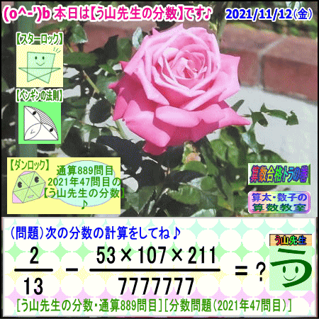 [う山雄一先生の分数]【分数889問目】算数・数学天才問題[2021年11月12日]Fraction □──────────────────□ 【算太・数子の算数教室】(R) 【算数合格トラの巻】 【う山TV(スタディ)】 【う山TV(バラエティ)】 【カンブリア・アカデミー】 □──────────────────□ (o^-')b 大人気☆[う山先生式・分数計算]の問題です♪ □──────────────────□ □ 2021/11/12(金曜) □ (o^-')b 【う山先生の分数・通算889問目】 [分数問題(2021年47問目)] 本日は2021年11月12日です。 次の分数計算をしてね♪ 2/13 -(53×107×211)/7777777 = ? 【答え】後程♪ □ □──────────────────□ (*^ー^)ノ 本日も面白い分数問題を作りました☆ 分子・分母ともどうなるかな♪ 本日は、前回を思い出してもらいたい分数問題です☆ □ [Fraction of Professor Uyama] доля Frakcja Fracao □──────────────────□ 算数・数学・家庭教師・個別指導・質問教室 □──────────────────□ □□□□□□□□□□□□□□□□□□□□ #分数 #う山先生の分数 #算数 #算数合格トラの巻 #数学 #解けたら天才 #家庭教師 #う山TV #う山先生 #う山雄一先生 #算太数子の算数教室 #算太数子 #算太くん #数子ちゃん #オルドビスキー博士 #シルルちゃん #デボン君 #白亜紀先生 #カンブリアアカデミー #勉強 #勉強垢 #計算問題 #数学垢 #数学教えて #数学教える #中学受験 #中学入試 #高校入試 #高校受験 #相互フォロー □ □□□□□□□□□□□□□□□□□□□□ [発行者氏名]【う山雄一】 [発行者web]【算数合格トラの巻】 [発行者web]【算太・数子の算数教室】(R) [著作]【算太・数子の算数教室】(R) 「さんた・かずこのさんすうきょうしつ」 [著作]【算遊記】 □ [メインサイト]う山先生のHP https://uyama.theblog.me/ □ [中学受験・算数]メイン http://uyama.aikotoba.jp/ [中学受験・算数]サブ https://sansu.theblog.me/ http://santakazuko.wix.com/uyama □ [成績表・偏差値アップ] http://uyama.aikotoba.jp/seiseki/seiseki.html □ [算遊記(さんゆうき)]算蔵法師・算悟空 http://www.geocities.jp/san_yu_ki/(←工事中) □ [仕事用フェイスブック] https://www.facebook.com/kazuko.santa.5/ □ [全般メール] ??????@gmail.com □ [中学受験・仕事用メール] ??????@gmail.com □ [ブログ]【算数合格トラの巻】 http://ameblo.jp/sansu/ http://uyama.blog.jp/ https://blog.goo.ne.jp/sansu_gokaku □ [ブログ]【算太・数子の算数教室】(R) http://ameblo.jp/santa-kazuko/ http://blog.goo.ne.jp/santa_kazuko http://santakazuko.wordpress.com/ http://santa-kazuko.at.webry.info/ http://santa-kazuko.blogspot.jp/ http://ch.nicovideo.jp/santa-kazuko http://santa-kazuko.blog.jp/ □ [ブログ]【う山先生】 http://happy.ap.teacup.com/uyama/ http://sansugokaku.blog.fc2.com/ https://uyama-sensei.hatenablog.com/ □ [ブログ]【オルドビスキー博士】 http://ameblo.jp/ordovisky/ □ [ブログ]【う山TV】 https://ameblo.jp/uyama-tv/ □ [動画一覧]【う山TV】(スタディ/バラエティ) http://uyama.aikotoba.jp/3-uyama-tv.html □ [動画一覧]【う山TV】 https://uyama-tv.themedia.jp/ □ [作曲一覧]【う山TV】(作曲) https://uyama-tv.amebaownd.com/ □ [分数、楽しい!]シリーズ [分数で算数・数学の天才になろう♪]シリーズ [知的ゲーム]シリーズ [一瞬で解こう!]シリーズ [解けたら天才♪]シリーズ [家庭教師]シリーズ [算数・面白い問題]シリーズ [算数・数学ファイル/SSファイル]シリーズ 【音楽・作曲】シリーズ 【空耳】シリーズ 【恋愛探偵サララ】シリーズ 【ランキング】シリーズ □ □ 【毎日の問題ブログ】一覧(お好きなブログを登録してね♪) http://uyama.aikotoba.jp/2-blog.html □ □□□□□□□□□□□□□□□□□□□□ ☆ ☆ ☆ ☆ ☆ ☆ ☆ ☆ ☆ ☆ ☆