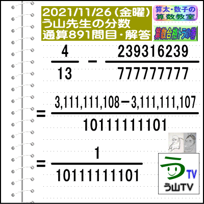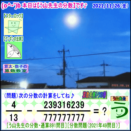 [う山雄一先生の分数]【分数891問目】算数・数学天才問題[2021年11月26日]Fraction □──────────────────□ 【算太・数子の算数教室】(R) 【算数合格トラの巻】 【う山TV(スタディ)】 【う山TV(バラエティ)】 【カンブリア・アカデミー】 □──────────────────□ (o^-')b 大人気☆[う山先生式・分数計算]の問題です♪ □──────────────────□ □ 2021/11/26(金曜) □ (o^-')b 【う山先生の分数・通算891問目】 [分数問題(2021年49問目)] 本日は2021年11月26日です。 次の分数計算をしてね♪ 4/13 - 239316239/777777777 = ? 【答え】後程♪ □ □──────────────────□ (*^ー^)ノ 本日も面白い分数問題を作りました☆ 分子・分母ともどうなるかな♪ 本日は、前回を思い出してもらいたい分数問題です☆ □ [Fraction of Professor Uyama] доля Frakcja Fracao □──────────────────□ 算数・数学・家庭教師・個別指導・質問教室 □──────────────────□ □□□□□□□□□□□□□□□□□□□□ #分数 #う山先生の分数 #算数 #算数合格トラの巻 #数学 #解けたら天才 #家庭教師 #う山TV #う山先生 #う山雄一先生 #算太数子の算数教室 #算太数子 #算太くん #数子ちゃん #オルドビスキー博士 #シルルちゃん #デボン君 #白亜紀先生 #カンブリアアカデミー #勉強 #勉強垢 #計算問題 #数学垢 #数学教えて #数学教える #中学受験 #中学入試 #高校入試 #高校受験 #相互フォロー □ □□□□□□□□□□□□□□□□□□□□ [発行者氏名]【う山雄一】 [発行者web]【算数合格トラの巻】 [発行者web]【算太・数子の算数教室】(R) [著作]【算太・数子の算数教室】(R) 「さんた・かずこのさんすうきょうしつ」 [著作]【算遊記】 □ [メインサイト]う山先生のHP https://uyama.theblog.me/ □ [中学受験・算数]メイン http://uyama.aikotoba.jp/ [中学受験・算数]サブ https://sansu.theblog.me/ http://santakazuko.wix.com/uyama □ [成績表・偏差値アップ] http://uyama.aikotoba.jp/seiseki/seiseki.html □ [算遊記(さんゆうき)]算蔵法師・算悟空 http://www.geocities.jp/san_yu_ki/(←工事中) □ [仕事用フェイスブック] https://www.facebook.com/kazuko.santa.5/ □ [全般メール] ??????@gmail.com □ [中学受験・仕事用メール] ??????@gmail.com □ [ブログ]【算数合格トラの巻】 http://ameblo.jp/sansu/ http://uyama.blog.jp/ https://blog.goo.ne.jp/sansu_gokaku □ [ブログ]【算太・数子の算数教室】(R) http://ameblo.jp/santa-kazuko/ http://blog.goo.ne.jp/santa_kazuko http://santakazuko.wordpress.com/ http://santa-kazuko.at.webry.info/ http://santa-kazuko.blogspot.jp/ http://ch.nicovideo.jp/santa-kazuko http://santa-kazuko.blog.jp/ □ [ブログ]【う山先生】 http://happy.ap.teacup.com/uyama/ http://sansugokaku.blog.fc2.com/ https://uyama-sensei.hatenablog.com/ □ [ブログ]【オルドビスキー博士】 http://ameblo.jp/ordovisky/ □ [ブログ]【う山TV】 https://ameblo.jp/uyama-tv/ □ [動画一覧]【う山TV】(スタディ/バラエティ) http://uyama.aikotoba.jp/3-uyama-tv.html □ [動画一覧]【う山TV】 https://uyama-tv.themedia.jp/ □ [作曲一覧]【う山TV】(作曲) https://uyama-tv.amebaownd.com/ □ [分数、楽しい!]シリーズ [分数で算数・数学の天才になろう♪]シリーズ [知的ゲーム]シリーズ [一瞬で解こう!]シリーズ [解けたら天才♪]シリーズ [家庭教師]シリーズ [算数・面白い問題]シリーズ [算数・数学ファイル/SSファイル]シリーズ 【音楽・作曲】シリーズ 【空耳】シリーズ 【恋愛探偵サララ】シリーズ 【ランキング】シリーズ □ □ 【毎日の問題ブログ】一覧(お好きなブログを登録してね♪) http://uyama.aikotoba.jp/2-blog.html □ □□□□□□□□□□□□□□□□□□□□ ☆ ☆ ☆ ☆ ☆ ☆ ☆ ☆ ☆ ☆ ☆