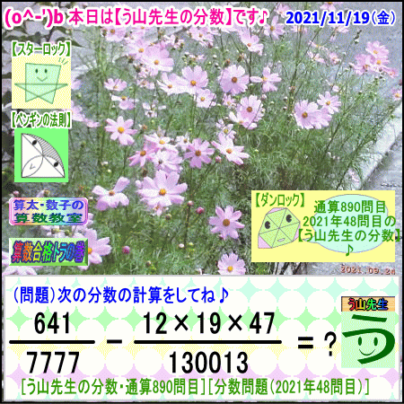 [う山雄一先生の分数]【分数890問目】算数・数学天才問題[2021年11月19日]Fraction □──────────────────□ 【算太・数子の算数教室】(R) 【算数合格トラの巻】 【う山TV(スタディ)】 【う山TV(バラエティ)】 【カンブリア・アカデミー】 □──────────────────□ (o^-')b 大人気☆[う山先生式・分数計算]の問題です♪ □──────────────────□ □ 2021/11/19(金曜) □ (o^-')b 【う山先生の分数・通算890問目】 [分数問題(2021年48問目)] 本日は2021年11月19日です。 次の分数計算をしてね♪ 641/7777 -(12×19×47)/130013 = ? 【答え】後程♪ □ □──────────────────□ (*^ー^)ノ 本日も面白い分数問題を作りました☆ 分子・分母ともどうなるかな♪ 本日は、前回を思い出してもらいたい分数問題です☆ □ [Fraction of Professor Uyama] доля Frakcja Fracao □──────────────────□ 算数・数学・家庭教師・個別指導・質問教室 □──────────────────□ □□□□□□□□□□□□□□□□□□□□ #分数 #う山先生の分数 #算数 #算数合格トラの巻 #数学 #解けたら天才 #家庭教師 #う山TV #う山先生 #う山雄一先生 #算太数子の算数教室 #算太数子 #算太くん #数子ちゃん #オルドビスキー博士 #シルルちゃん #デボン君 #白亜紀先生 #カンブリアアカデミー #勉強 #勉強垢 #計算問題 #数学垢 #数学教えて #数学教える #中学受験 #中学入試 #高校入試 #高校受験 #相互フォロー □ □□□□□□□□□□□□□□□□□□□□ [発行者氏名]【う山雄一】 [発行者web]【算数合格トラの巻】 [発行者web]【算太・数子の算数教室】(R) [著作]【算太・数子の算数教室】(R) 「さんた・かずこのさんすうきょうしつ」 [著作]【算遊記】 □ [メインサイト]う山先生のHP https://uyama.theblog.me/ □ [中学受験・算数]メイン http://uyama.aikotoba.jp/ [中学受験・算数]サブ https://sansu.theblog.me/ http://santakazuko.wix.com/uyama □ [成績表・偏差値アップ] http://uyama.aikotoba.jp/seiseki/seiseki.html □ [算遊記(さんゆうき)]算蔵法師・算悟空 http://www.geocities.jp/san_yu_ki/(←工事中) □ [仕事用フェイスブック] https://www.facebook.com/kazuko.santa.5/ □ [全般メール] ??????@gmail.com □ [中学受験・仕事用メール] ??????@gmail.com □ [ブログ]【算数合格トラの巻】 http://ameblo.jp/sansu/ http://uyama.blog.jp/ https://blog.goo.ne.jp/sansu_gokaku □ [ブログ]【算太・数子の算数教室】(R) http://ameblo.jp/santa-kazuko/ http://blog.goo.ne.jp/santa_kazuko http://santakazuko.wordpress.com/ http://santa-kazuko.at.webry.info/ http://santa-kazuko.blogspot.jp/ http://ch.nicovideo.jp/santa-kazuko http://santa-kazuko.blog.jp/ □ [ブログ]【う山先生】 http://happy.ap.teacup.com/uyama/ http://sansugokaku.blog.fc2.com/ https://uyama-sensei.hatenablog.com/ □ [ブログ]【オルドビスキー博士】 http://ameblo.jp/ordovisky/ □ [ブログ]【う山TV】 https://ameblo.jp/uyama-tv/ □ [動画一覧]【う山TV】(スタディ/バラエティ) http://uyama.aikotoba.jp/3-uyama-tv.html □ [動画一覧]【う山TV】 https://uyama-tv.themedia.jp/ □ [作曲一覧]【う山TV】(作曲) https://uyama-tv.amebaownd.com/ □ [分数、楽しい!]シリーズ [分数で算数・数学の天才になろう♪]シリーズ [知的ゲーム]シリーズ [一瞬で解こう!]シリーズ [解けたら天才♪]シリーズ [家庭教師]シリーズ [算数・面白い問題]シリーズ [算数・数学ファイル/SSファイル]シリーズ 【音楽・作曲】シリーズ 【空耳】シリーズ 【恋愛探偵サララ】シリーズ 【ランキング】シリーズ □ □ 【毎日の問題ブログ】一覧(お好きなブログを登録してね♪) http://uyama.aikotoba.jp/2-blog.html □ □□□□□□□□□□□□□□□□□□□□ ☆ ☆ ☆ ☆ ☆ ☆ ☆ ☆ ☆ ☆ ☆