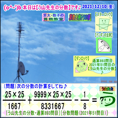 [う山雄一先生の分数]【分数893問目】算数・数学天才問題[2021年12月10日]Fraction □──────────────────□ 【算太・数子の算数教室】(R) 【算数合格トラの巻】 【う山TV(スタディ)】 【う山TV(バラエティ)】 【カンブリア・アカデミー】 □──────────────────□ (o^-')b 大人気☆[う山先生式・分数計算]の問題です♪ □──────────────────□ □ 2021/12/10(金曜) □ (o^-')b 【う山先生の分数・通算893問目】 [分数問題(2021年51問目)] 本日は2021年12月10日です。 次の分数計算をしてね♪ (25×25)/1667 +(9999×25×25)/8331667 - 1/8 = ? 【答え】後程♪ □ □──────────────────□ (*^ー^)ノ 本日も面白い分数問題を作りました☆ 分子・分母ともどうなるかな♪ □ [Fraction of Professor Uyama] доля Frakcja Fracao □──────────────────□ 算数・数学・家庭教師・個別指導・質問教室 □──────────────────□ □□□□□□□□□□□□□□□□□□□□ #分数 #う山先生の分数 #算数 #算数合格トラの巻 #数学 #解けたら天才 #家庭教師 #う山TV #う山先生 #う山雄一先生 #算太数子の算数教室 #算太数子 #算太くん #数子ちゃん #オルドビスキー博士 #シルルちゃん #デボン君 #白亜紀先生 #カンブリアアカデミー #勉強 #勉強垢 #計算問題 #数学垢 #数学教えて #数学教える #中学受験 #中学入試 #高校入試 #高校受験 #相互フォロー □ □□□□□□□□□□□□□□□□□□□□ [発行者氏名]【う山雄一】 [発行者web]【算数合格トラの巻】 [発行者web]【算太・数子の算数教室】(R) [著作]【算太・数子の算数教室】(R) 「さんた・かずこのさんすうきょうしつ」 [著作]【算遊記】 □ [メインサイト]う山先生のHP https://uyama.theblog.me/ □ [中学受験・算数]メイン http://uyama.aikotoba.jp/ [中学受験・算数]サブ https://sansu.theblog.me/ http://santakazuko.wix.com/uyama □ [成績表・偏差値アップ] http://uyama.aikotoba.jp/seiseki/seiseki.html □ [算遊記(さんゆうき)]算蔵法師・算悟空 http://www.geocities.jp/san_yu_ki/(←工事中) □ [仕事用フェイスブック] https://www.facebook.com/kazuko.santa.5/ □ [全般メール] ??????@gmail.com □ [中学受験・仕事用メール] ??????@gmail.com □ [ブログ]【算数合格トラの巻】 http://ameblo.jp/sansu/ http://uyama.blog.jp/ https://blog.goo.ne.jp/sansu_gokaku □ [ブログ]【算太・数子の算数教室】(R) http://ameblo.jp/santa-kazuko/ http://blog.goo.ne.jp/santa_kazuko http://santakazuko.wordpress.com/ http://santa-kazuko.at.webry.info/ http://santa-kazuko.blogspot.jp/ http://ch.nicovideo.jp/santa-kazuko http://santa-kazuko.blog.jp/ □ [ブログ]【う山先生】 http://happy.ap.teacup.com/uyama/ http://sansugokaku.blog.fc2.com/ https://uyama-sensei.hatenablog.com/ □ [ブログ]【オルドビスキー博士】 http://ameblo.jp/ordovisky/ □ [ブログ]【う山TV】 https://ameblo.jp/uyama-tv/ □ [動画一覧]【う山TV】(スタディ/バラエティ) http://uyama.aikotoba.jp/3-uyama-tv.html □ [動画一覧]【う山TV】 https://uyama-tv.themedia.jp/ □ [作曲一覧]【う山TV】(作曲) https://uyama-tv.amebaownd.com/ □ [分数、楽しい!]シリーズ [分数で算数・数学の天才になろう♪]シリーズ [知的ゲーム]シリーズ [一瞬で解こう!]シリーズ [解けたら天才♪]シリーズ [家庭教師]シリーズ [算数・面白い問題]シリーズ [算数・数学ファイル/SSファイル]シリーズ 【音楽・作曲】シリーズ 【空耳】シリーズ 【恋愛探偵サララ】シリーズ 【ランキング】シリーズ □ □ 【毎日の問題ブログ】一覧(お好きなブログを登録してね♪) http://uyama.aikotoba.jp/2-blog.html □ □□□□□□□□□□□□□□□□□□□□ ☆ ☆ ☆ ☆ ☆ ☆ ☆ ☆ ☆ ☆ ☆